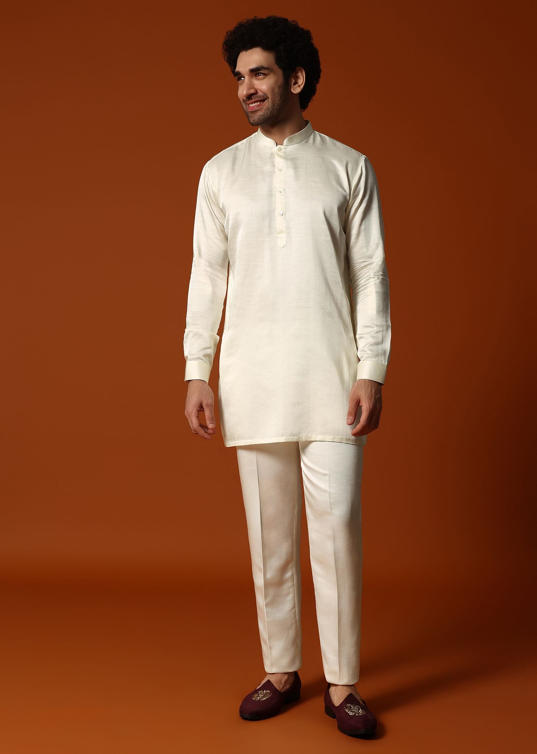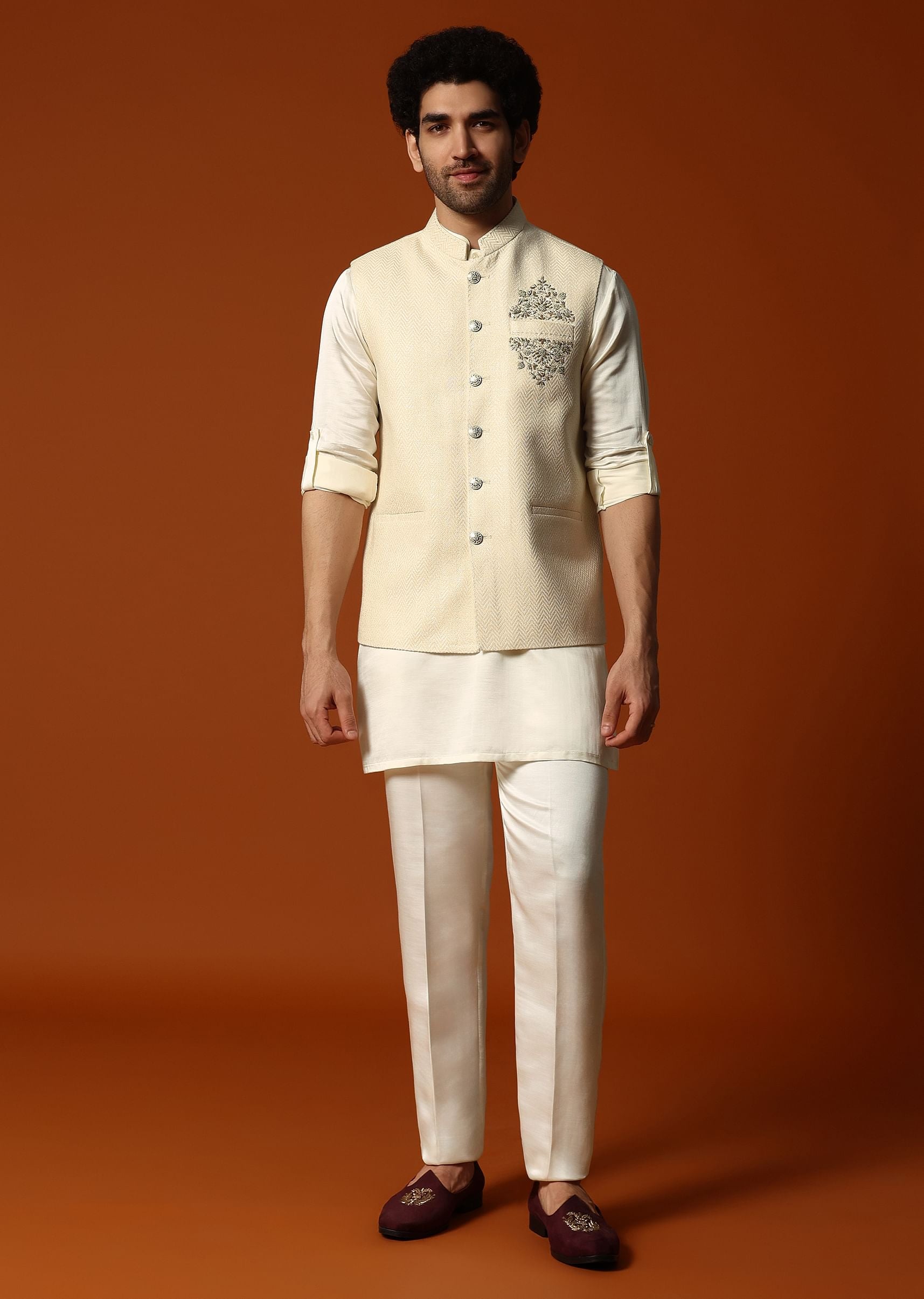 Immerse yourself in luxury with our cream kurta jacket set, thoughtfully created for sangeet and wedding gatherings. Fashioned from opulent silk fabric and adorned with intricate embroidery along the pocket... More Product Details