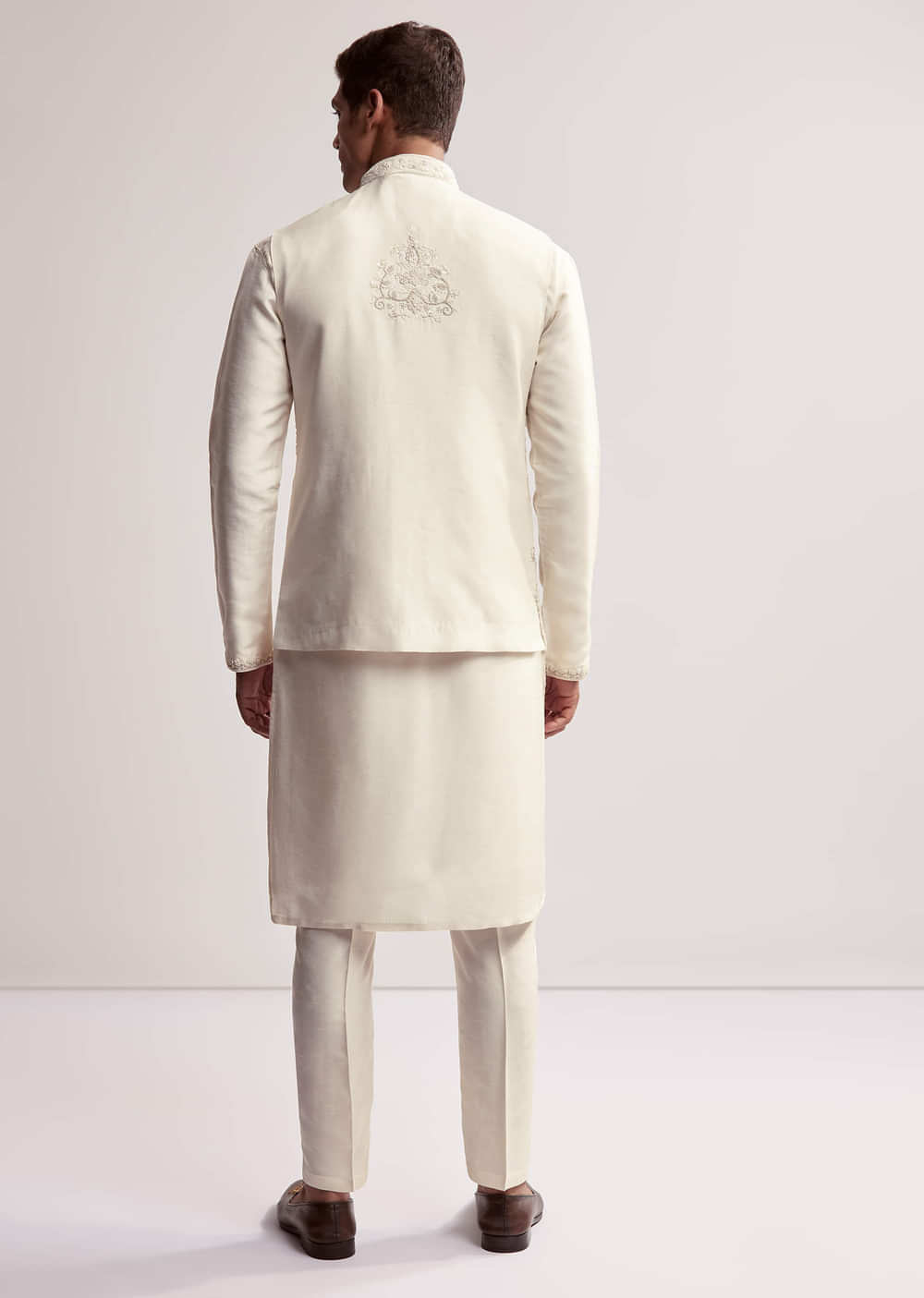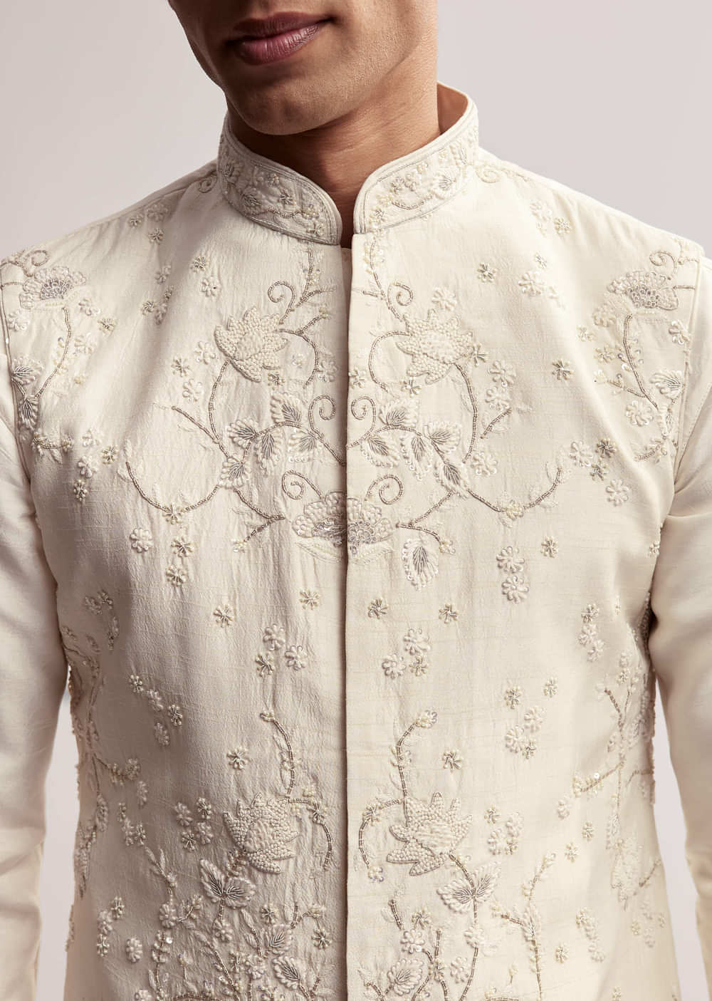 Cream Silk Kurta Jacket Set For Men With Floral Hand Embroidery