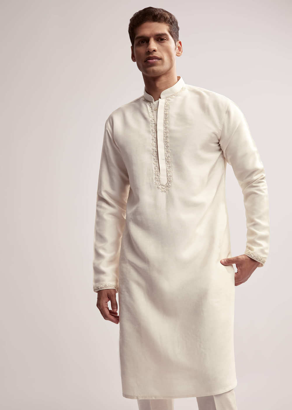 Evening gatherings feel elevated when this cream silk kurta jacket set for men enters the scene. Floral hand embroidery in zardosi, sequins, and resham adds layered detail that reads refined... More Product Details