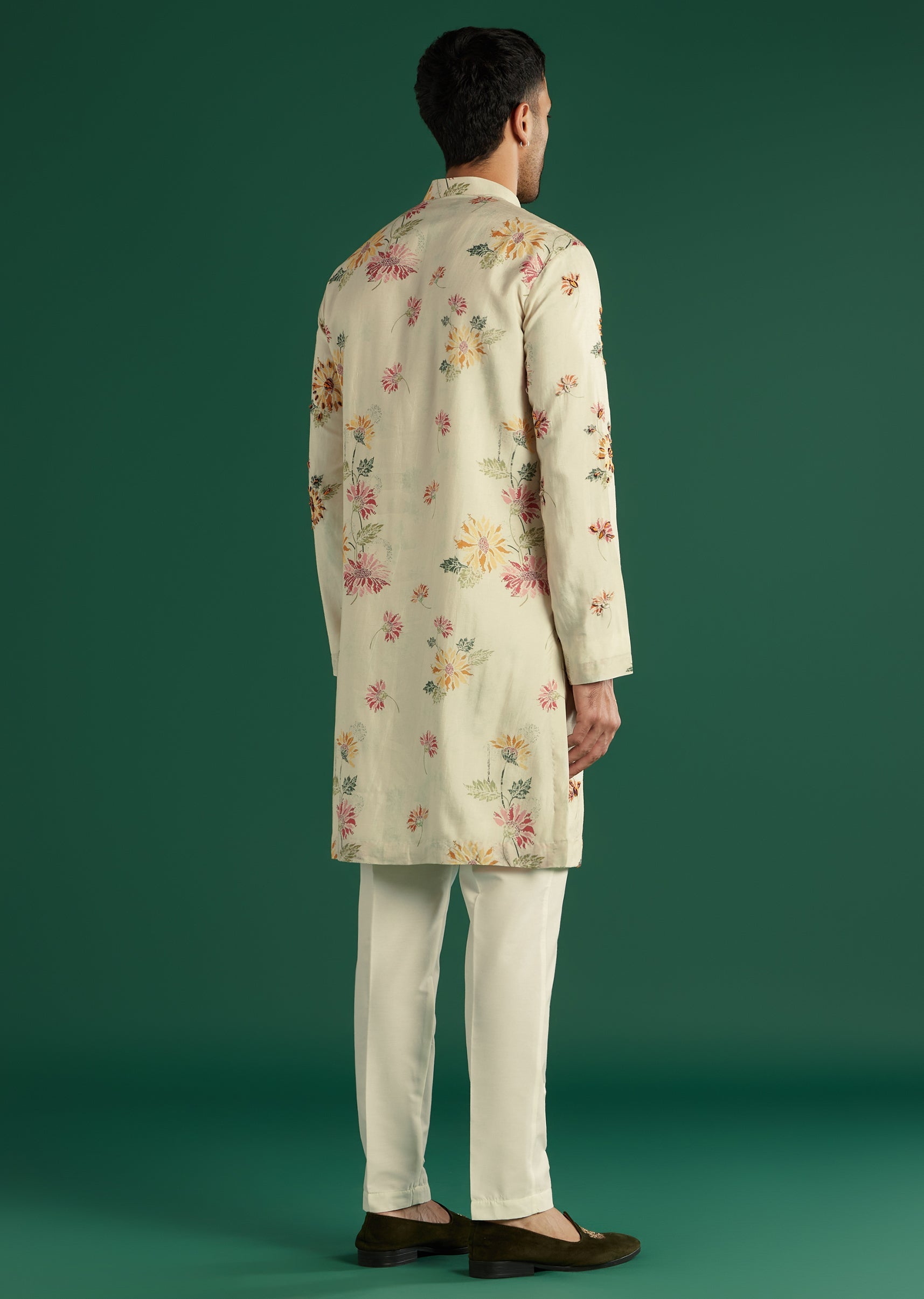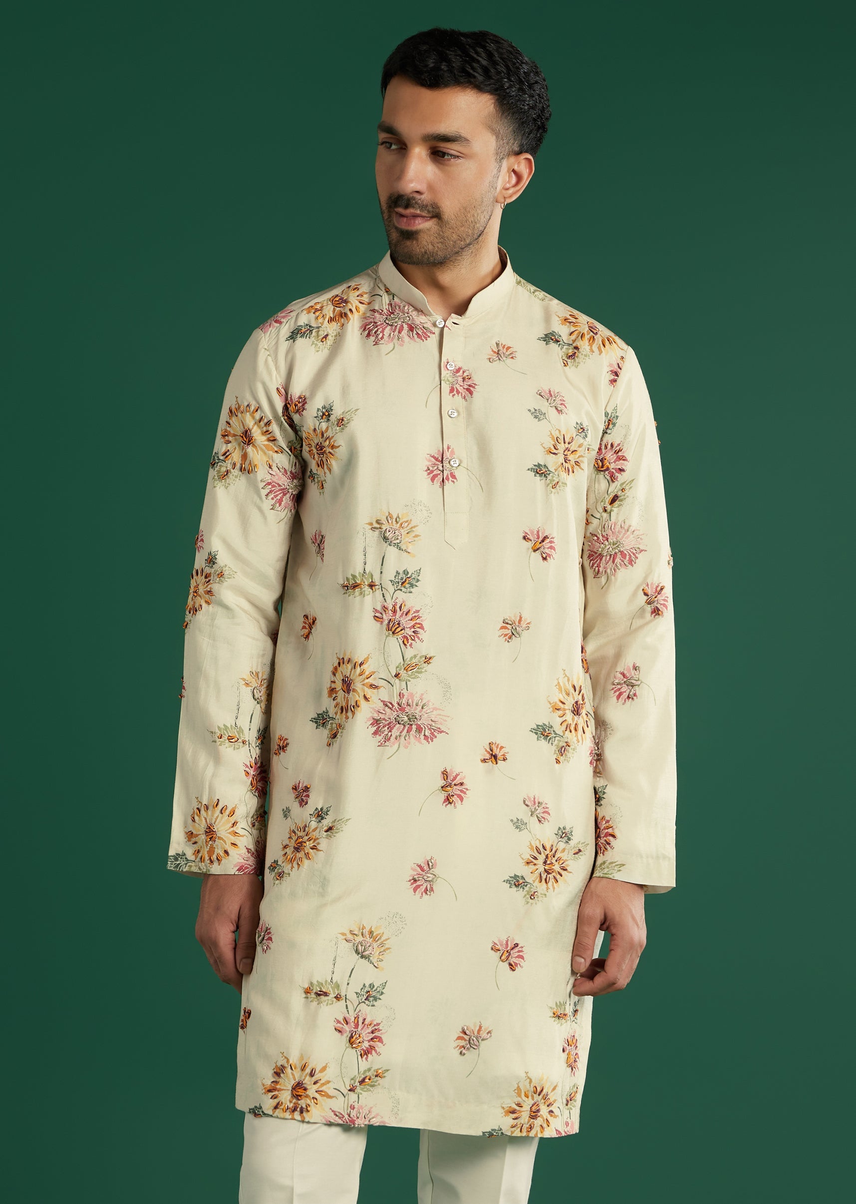 Soft colour and craft align as this cream art silk men’s kurta set places painterly floral resham in pink, yellow, and green for a spring-garden mood. A mandarin collar and... More Product Details