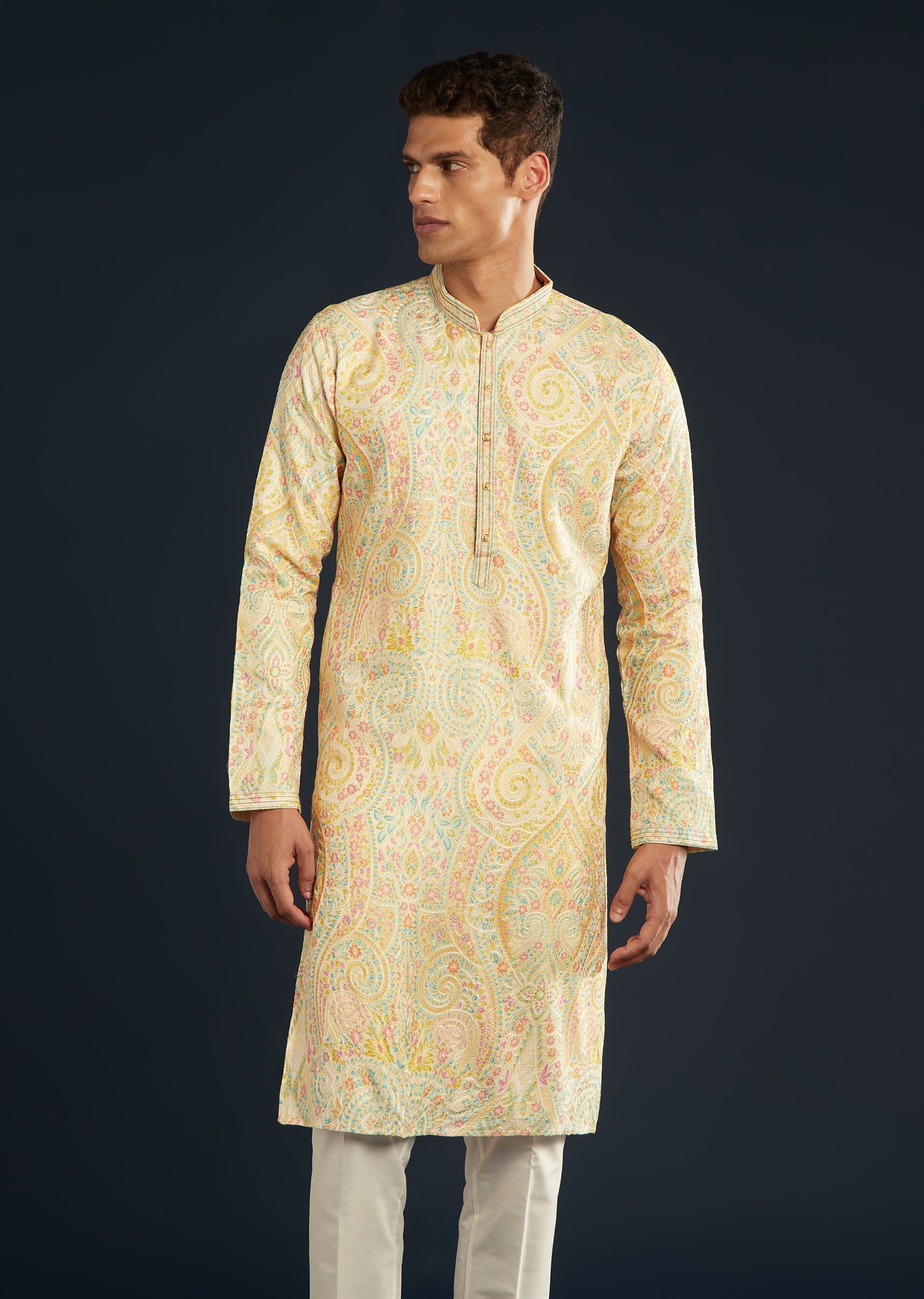 Step into understated elegance with this cream silk men’s kurta set. Adorned with delicate resham thread embroidery that enhances its classic appeal, the soft silk fabric drapes effortlessly, without compromising on style. The set includes matching pants, perfect for festive celebrations, and cultural gatherings. Awarded as the Most Trusted Brand, we're delivering styles you love, just as promised.