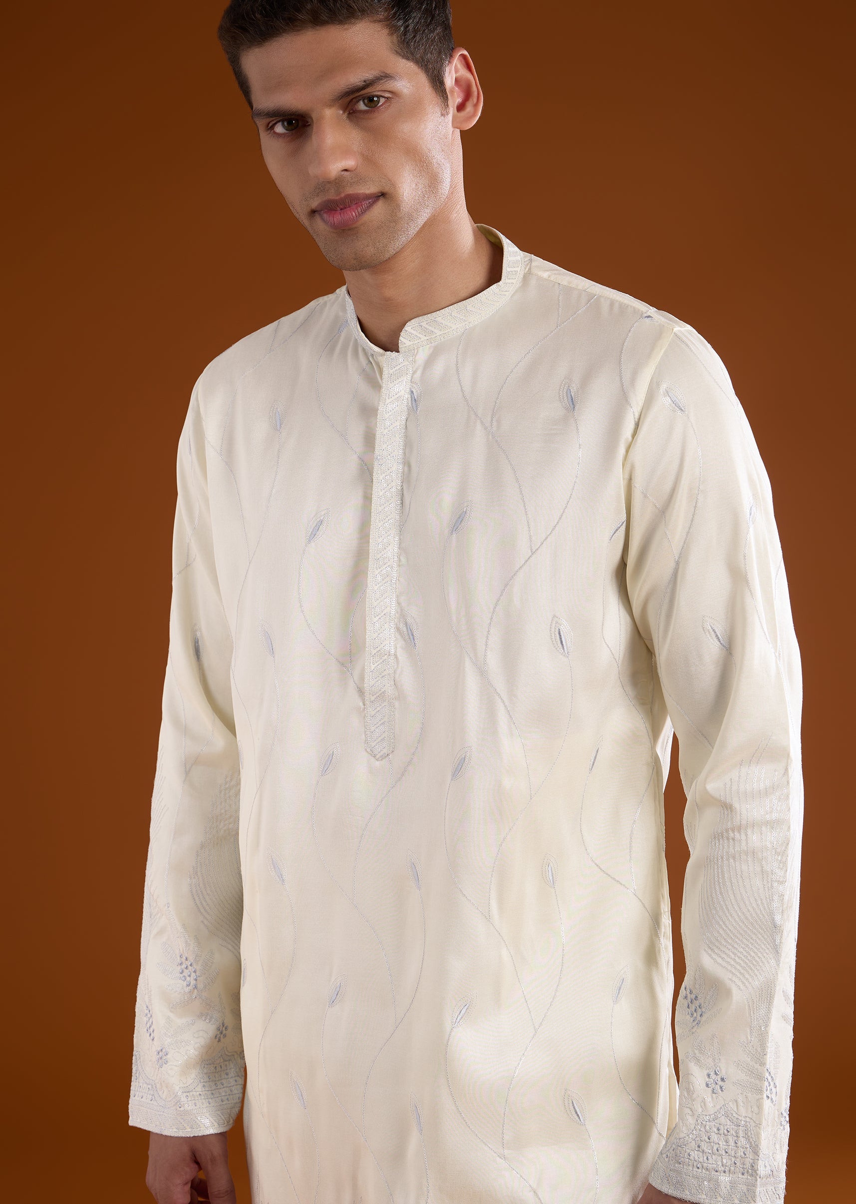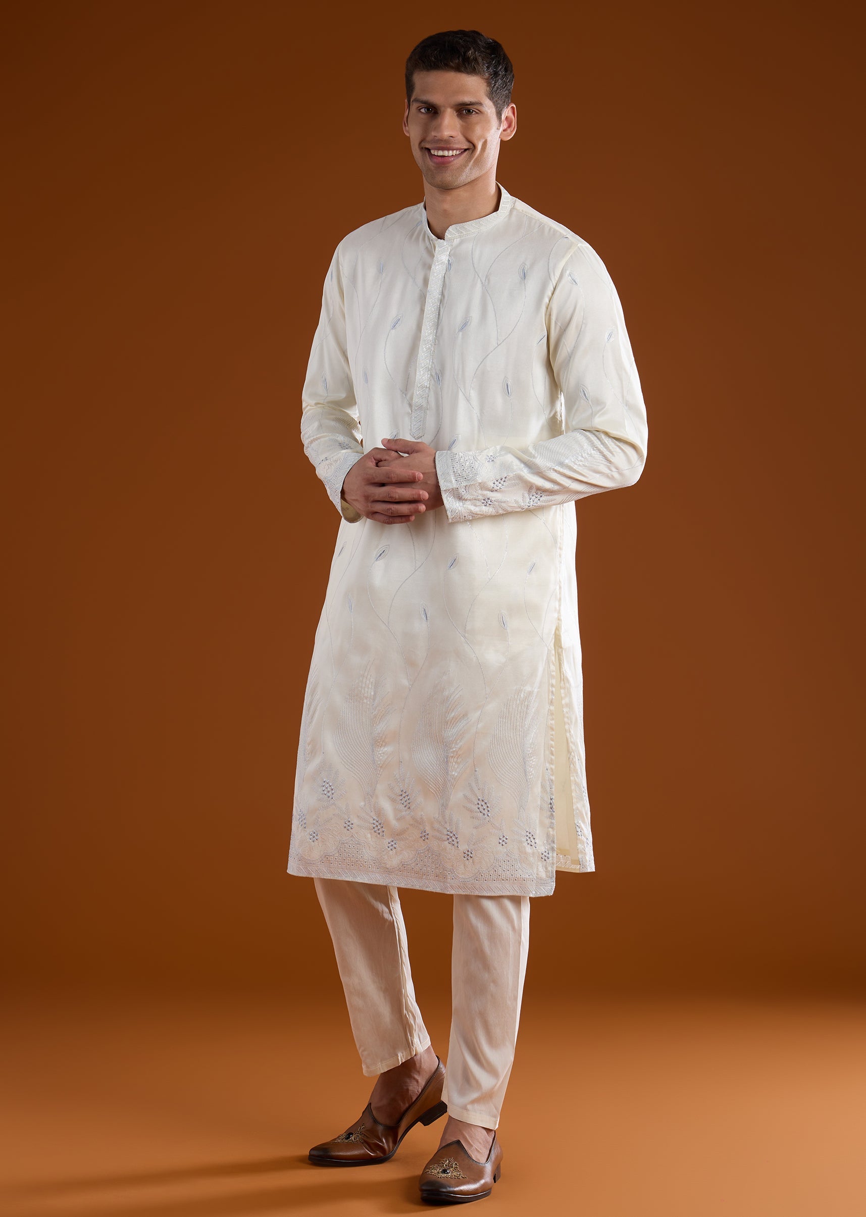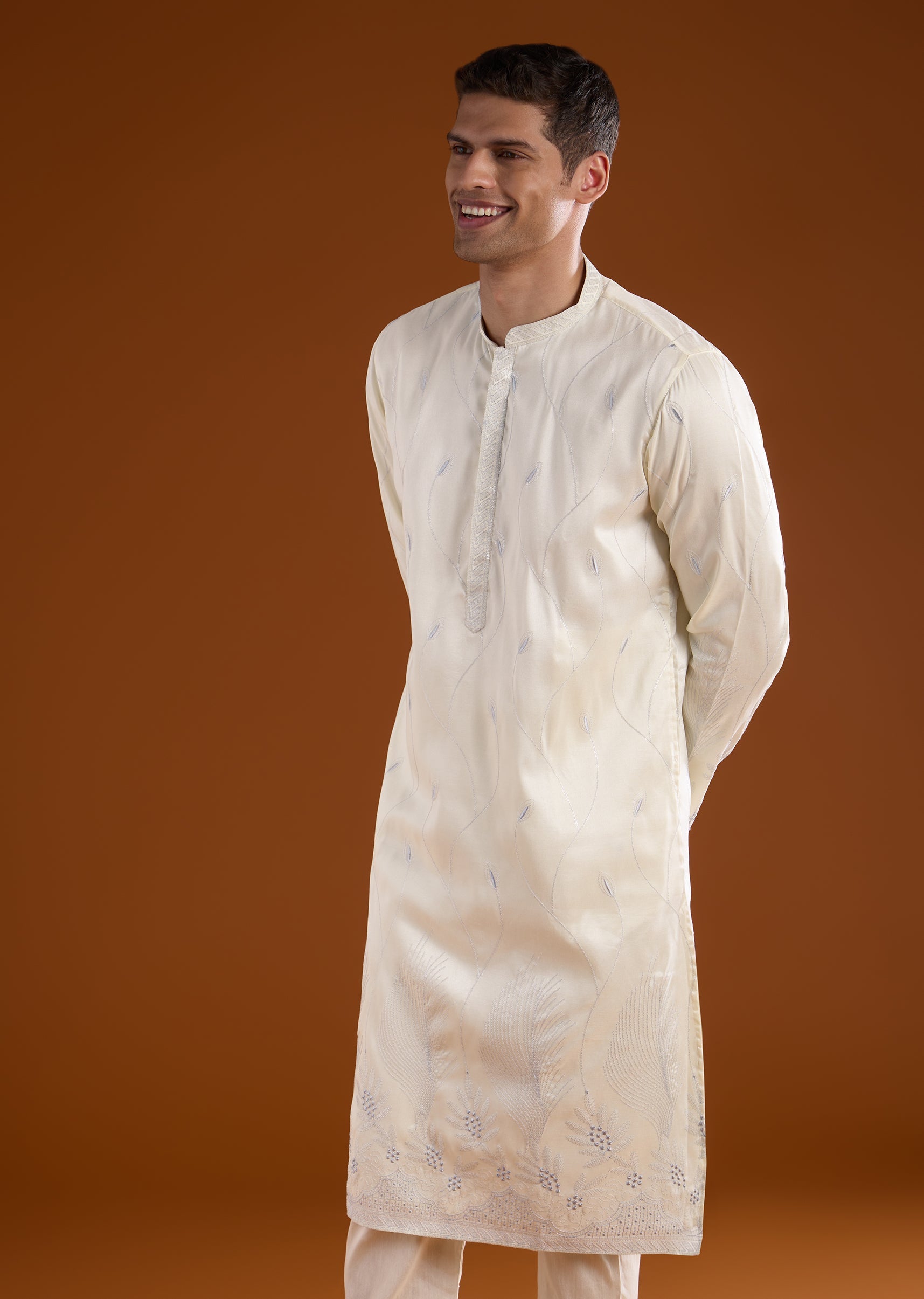 A sophisticated cream silk kurta set crafted for casual and festive occasions, perfect for wedding guests. Enhanced with delicate thread work, it brings subtle elegance while maintaining a structured silhouette. The full sleeves and mandarin collar create a polished and refined traditional look suitable for celebratory events. Awarded as the Most Trusted Brand, we're delivering styles you love, just as promised.