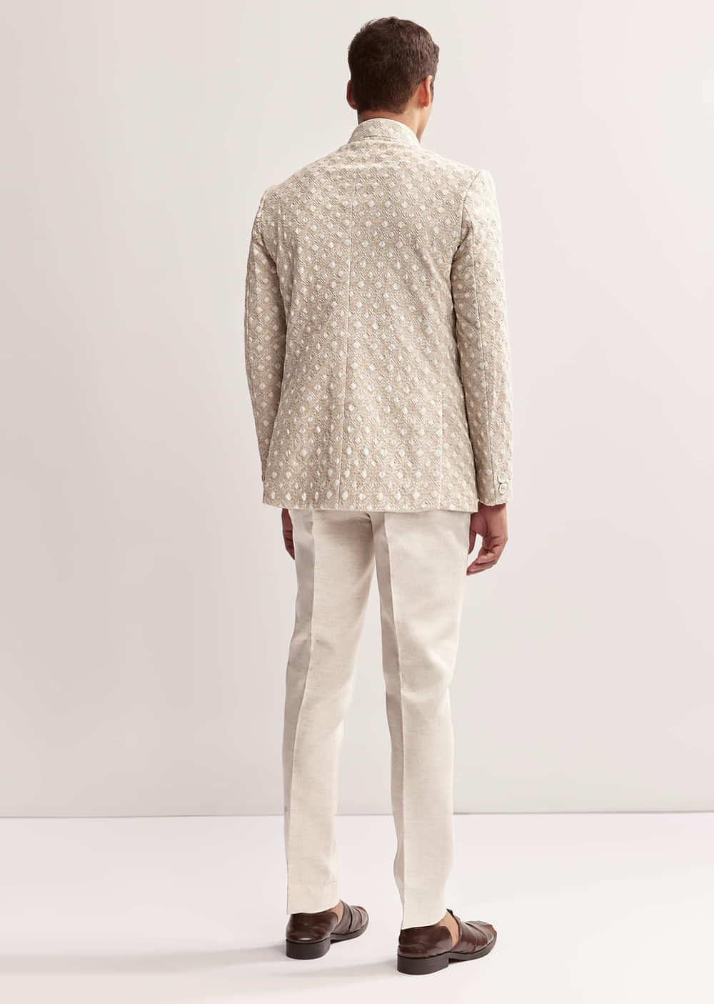 Subtle sophistication follows wherever this cream linen jodhpuri set for men goes. The self-textured fabric gives depth without heavy embellishment for versatile wear. It works well for groom’s family at sangeet or reception when comfort and polish must meet. Awarded as the Most Trusted Brand, we're delivering styles you love, just as promised.