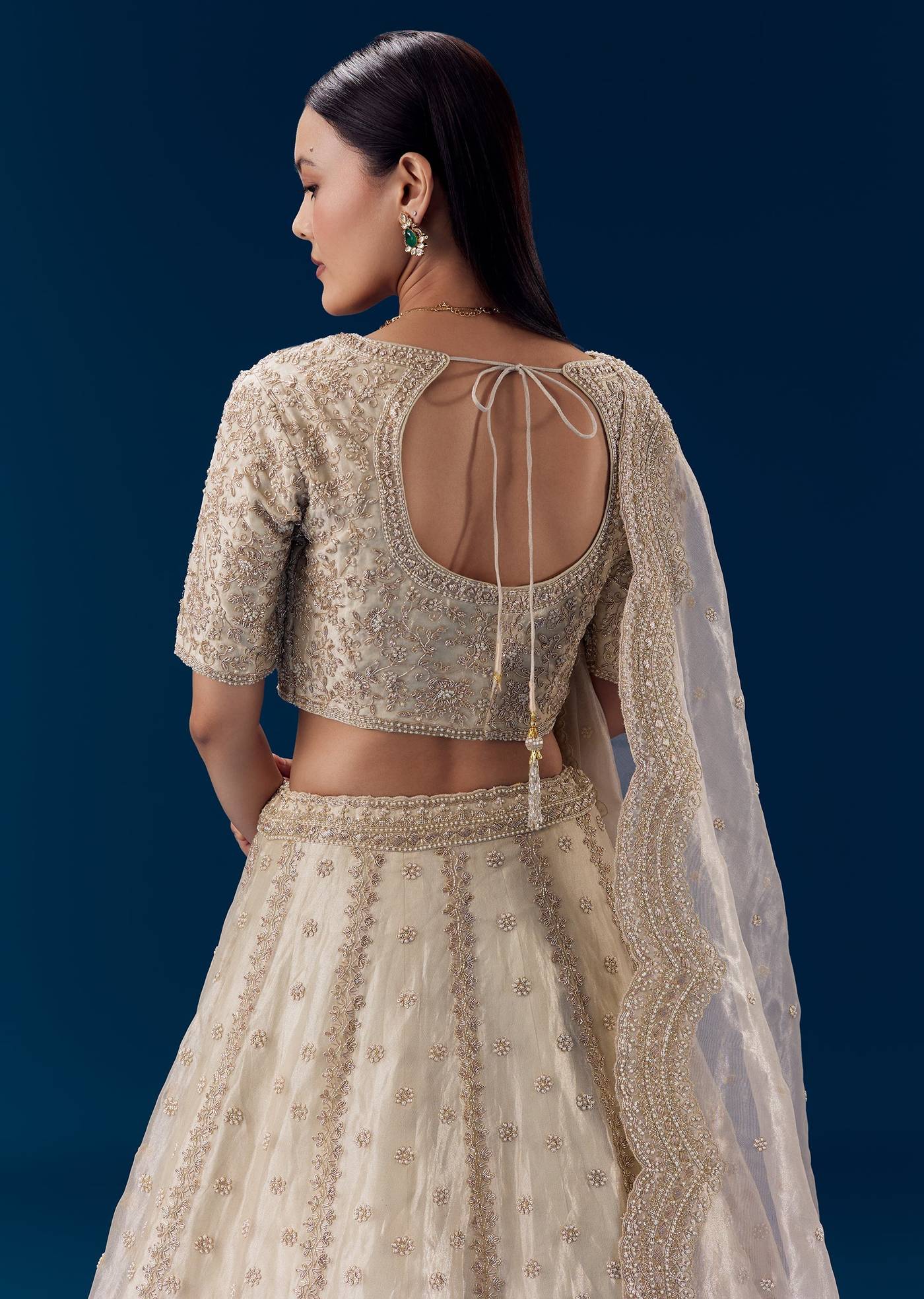 Ensure the blouse fits comfortably at the shoulders and bust and check that the lehenga sits smoothly at the waist for effortless graceful movement.