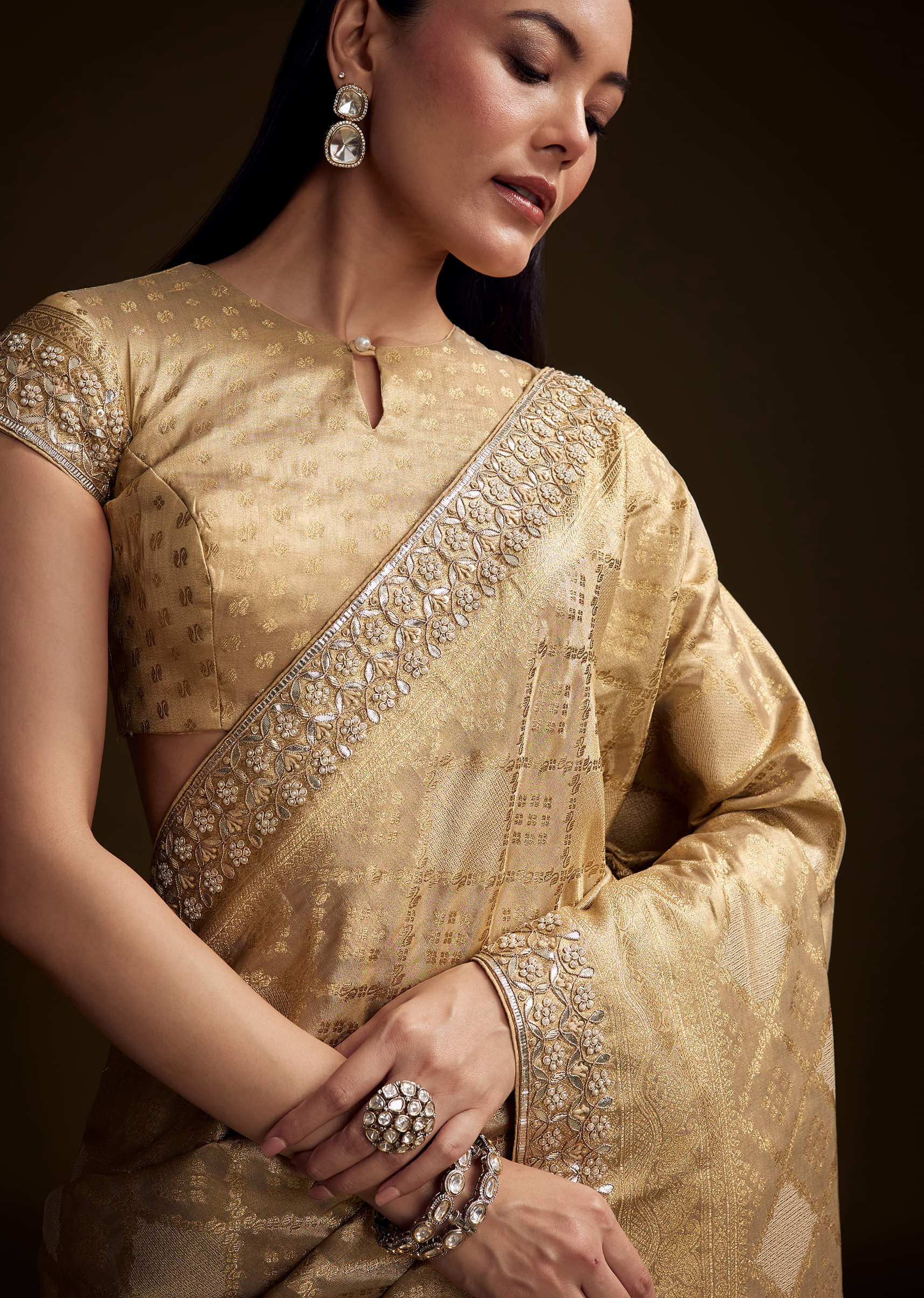 Cream Tissue Brocade Saree With Gotapatti And Moti Embroidery
