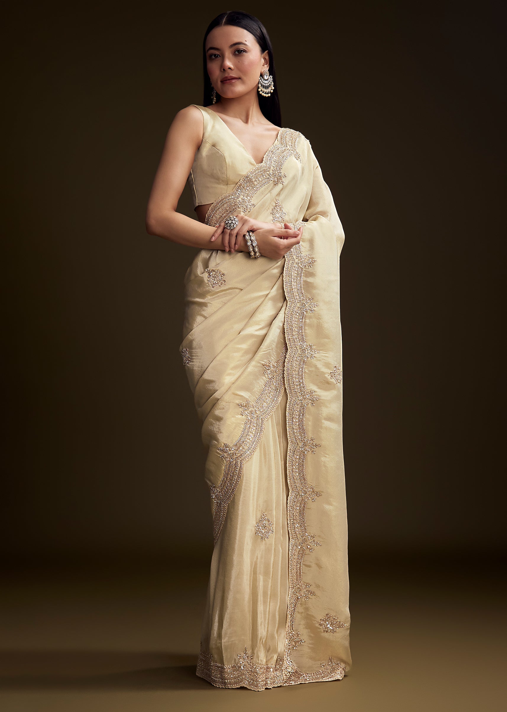 Cream Tissue Saree With Zardosi And Bead Embroidery