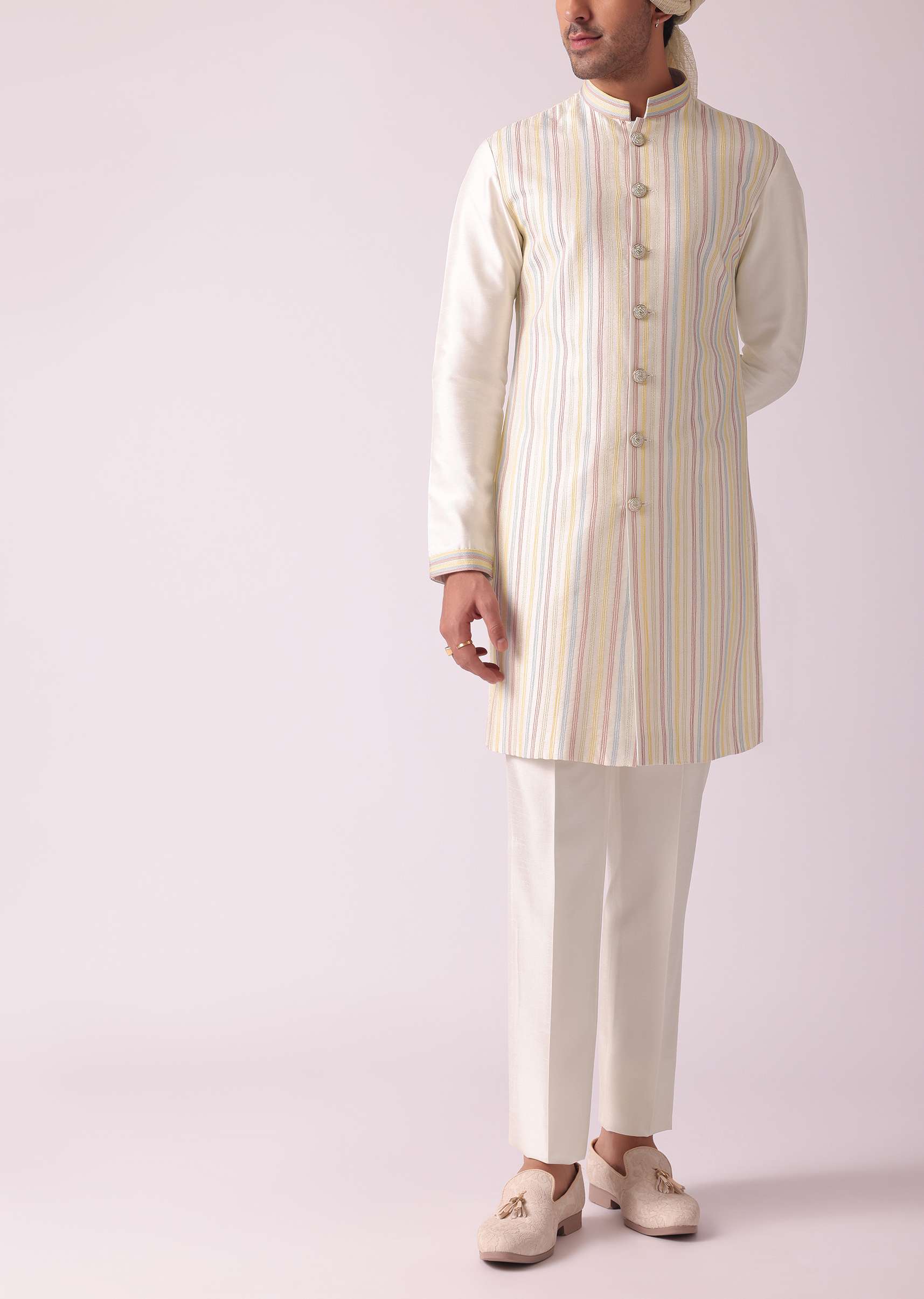 Elevate your style with our cream-white printed indowestern in dupion silk a fusion of classic charm and contemporary flair. The set includes a kurta adorned with a stylish stripe design perfectly paired with trousers. EVENT - This ensemble is the ideal choice for sangeet ceremonies.Change folds regularly. Awarded as the Most Trusted Brand, we're delivering styles you love, just as promised.