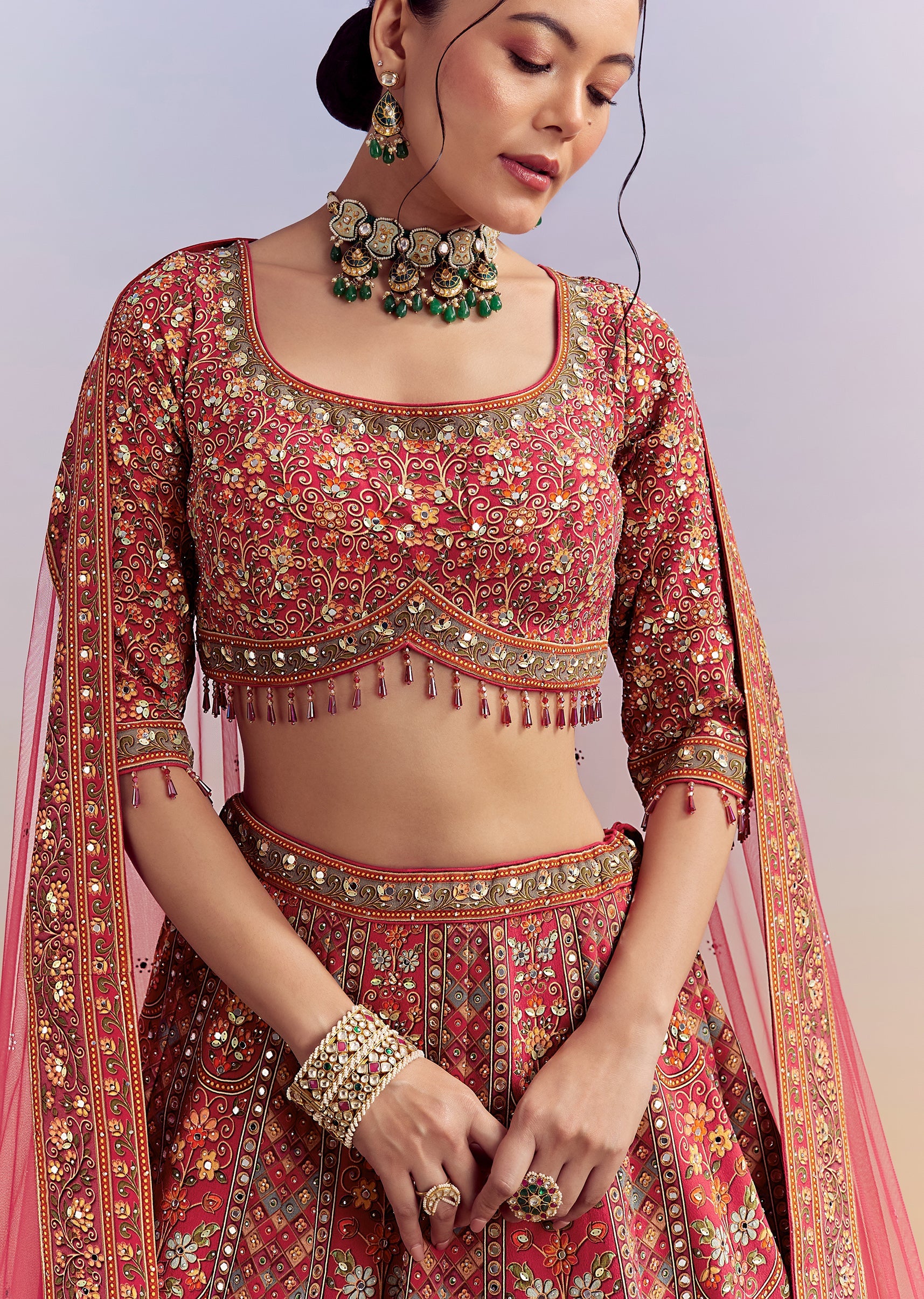 Crimson Red Crepe Printed Bridesmaid Lehenga With Embroidery