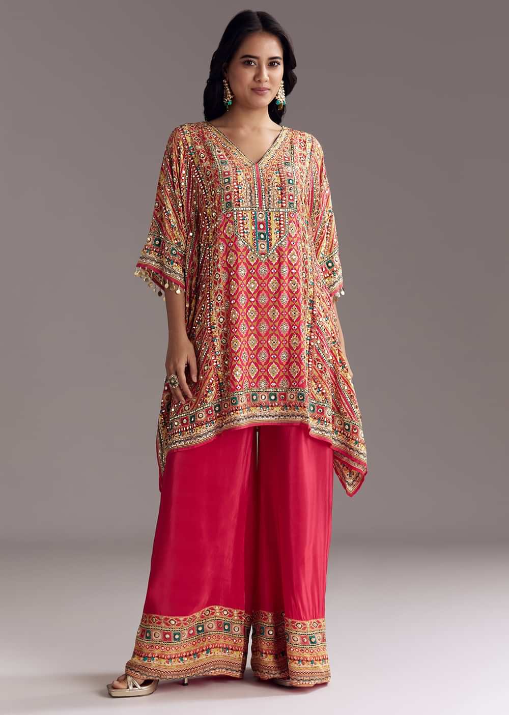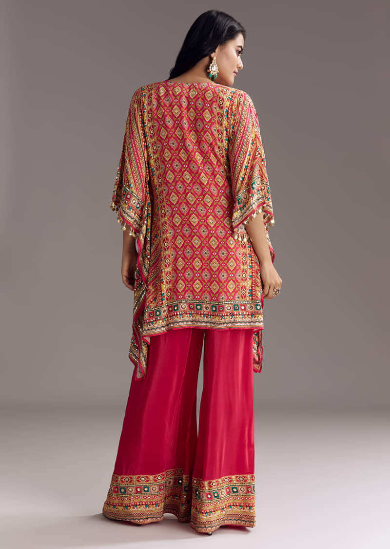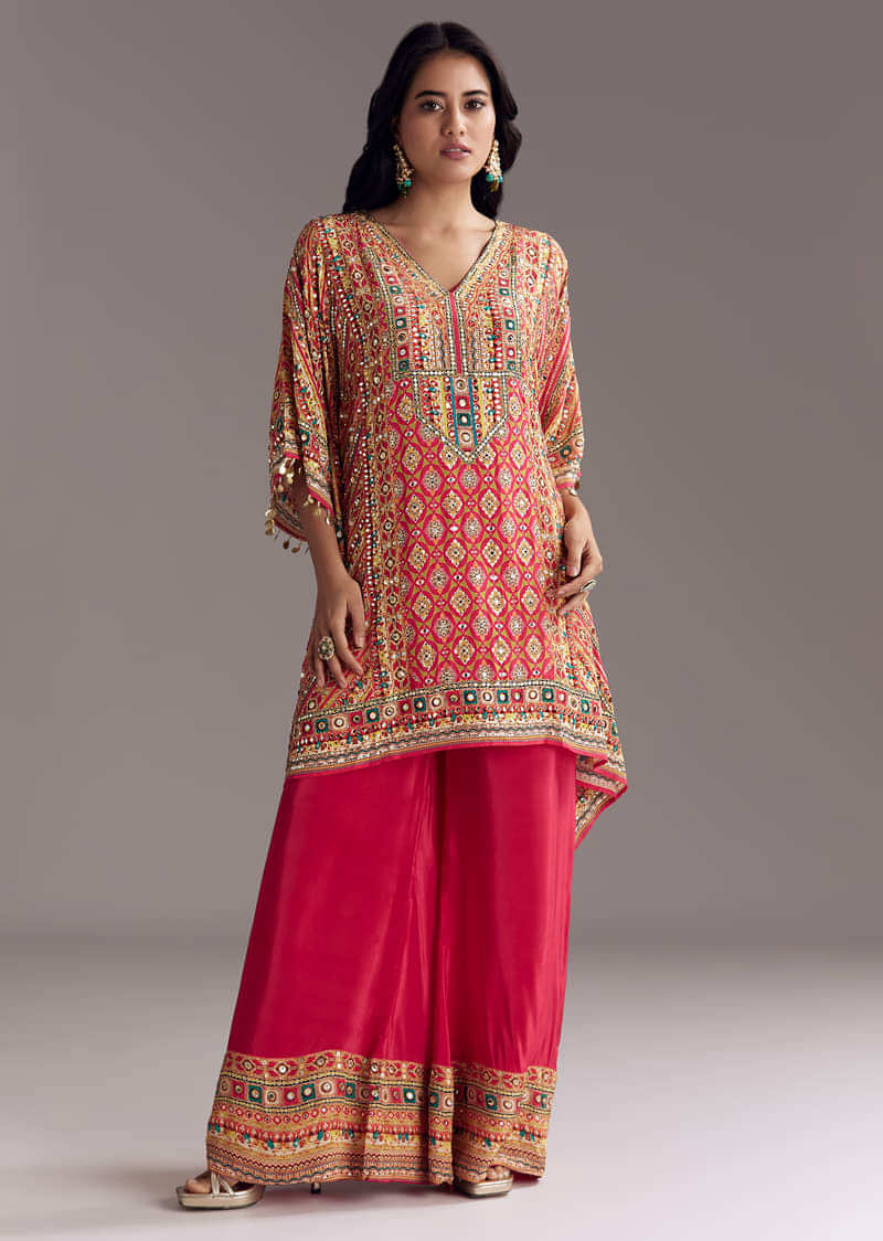 A fusion-style kaftaan in red crepe with prints and fancy sleeves, paired with a matching palazzo and inner lining. Asymmetric hemline gives it a modern edge. Awarded as the Most... More Product Details