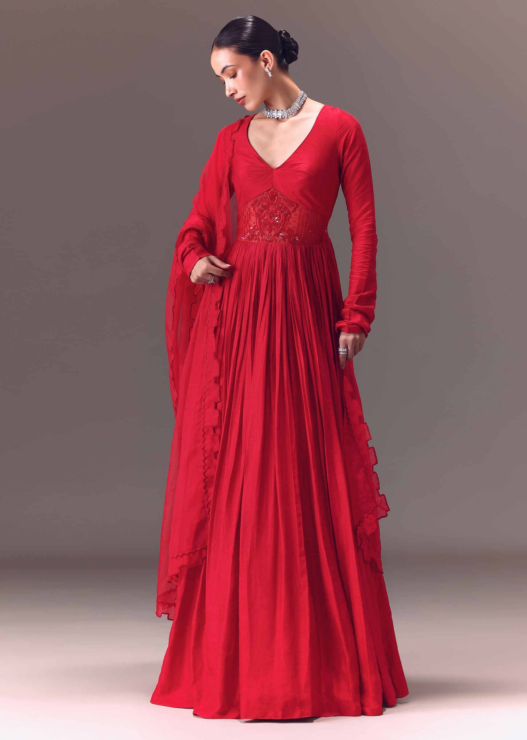 Step into the limelight with this striking crimson red anarkali set. Adorned on an opulent tussar fabric it showcases a classic Vneckline and full sleeves. Enhanced with self hand work... More Product Details
