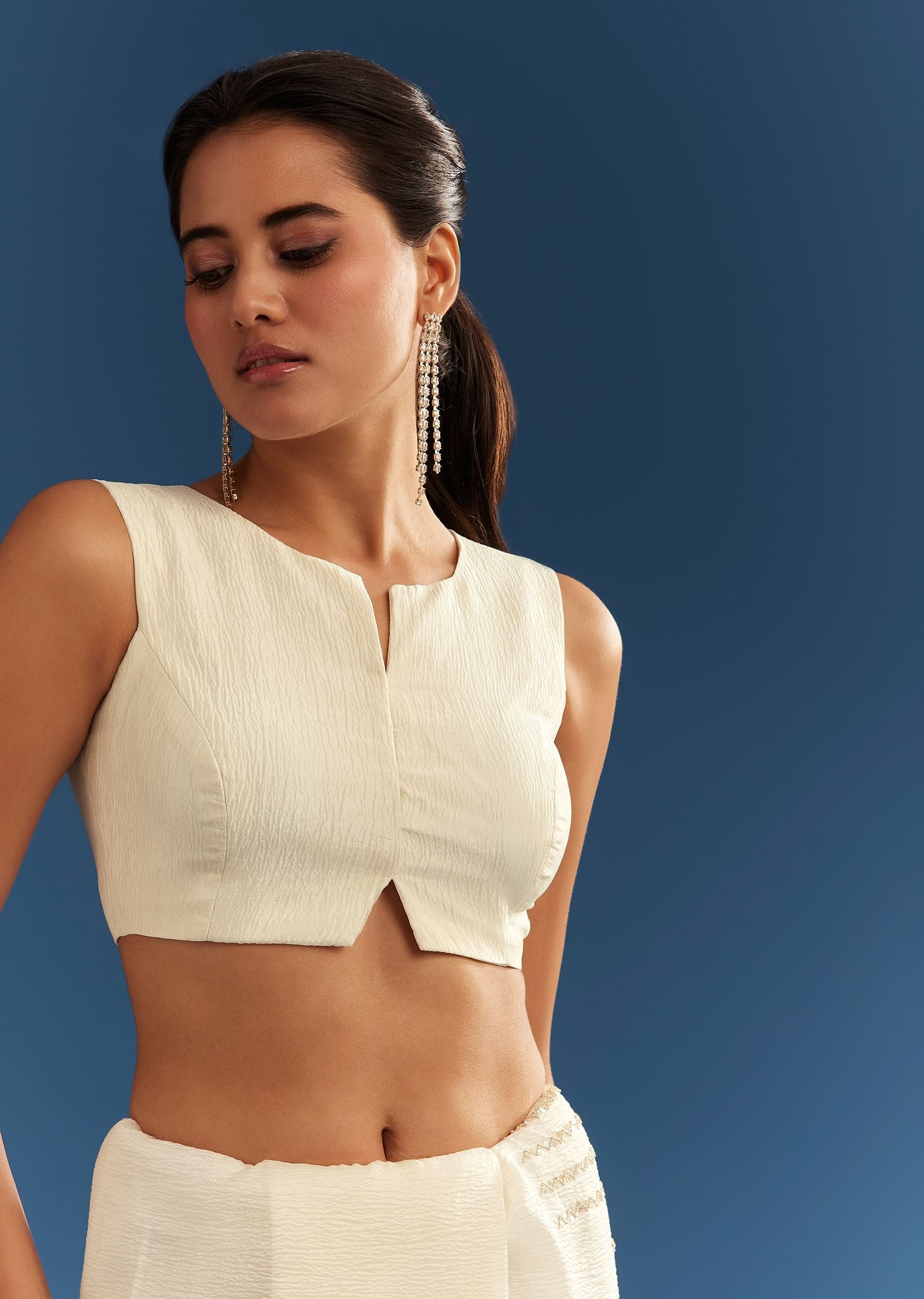 Drape yourself in ethereal elegance with this crushed tissue saree, adorned with shimmering cutdana and sequins embroidery. The delicate craftsmanship accentuates the soft drape, creating a look of timeless sophistication.... More Product Details