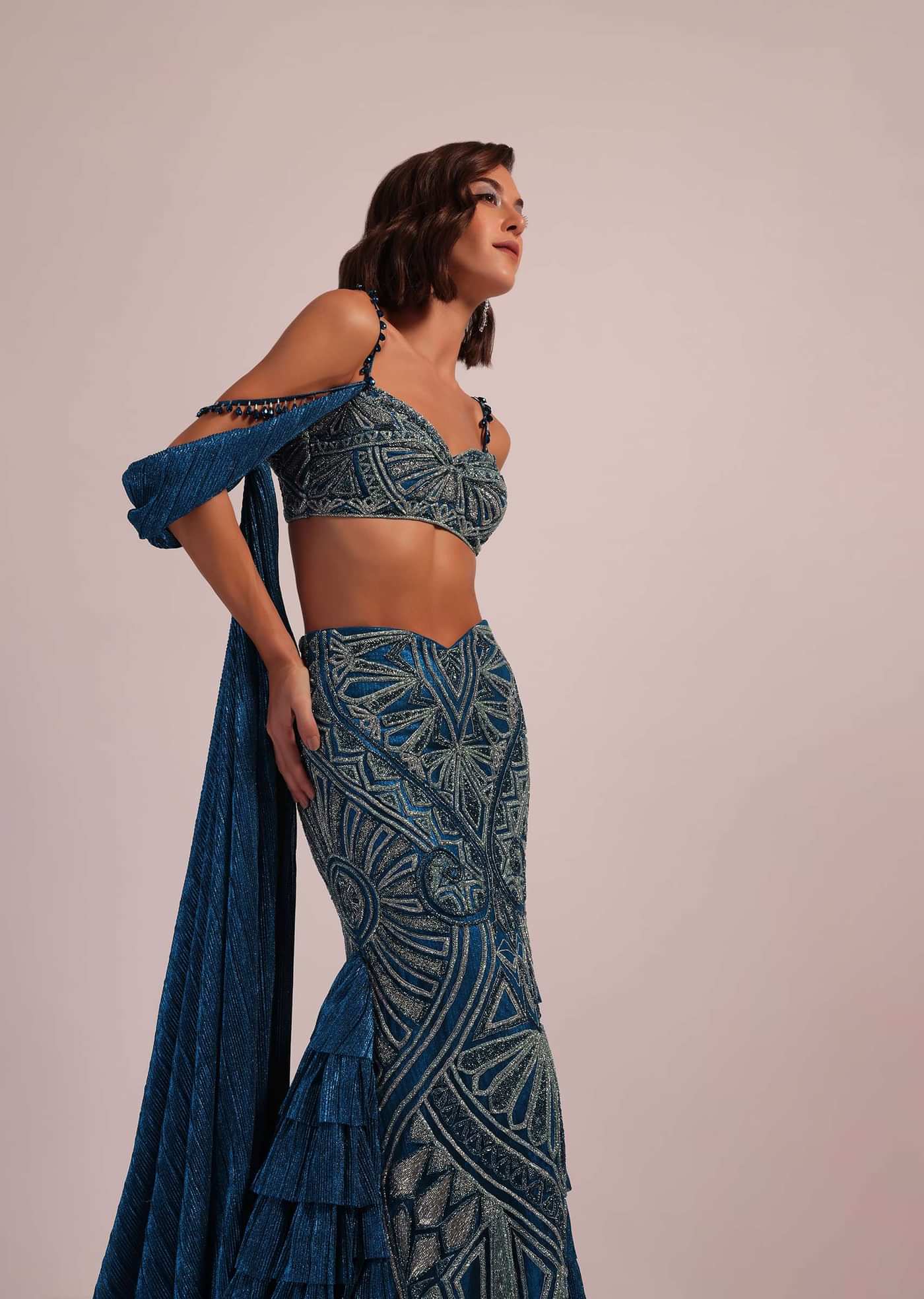 Dark Blue Fish Cut Bridal Lehenga Set In Net With Attached Cape