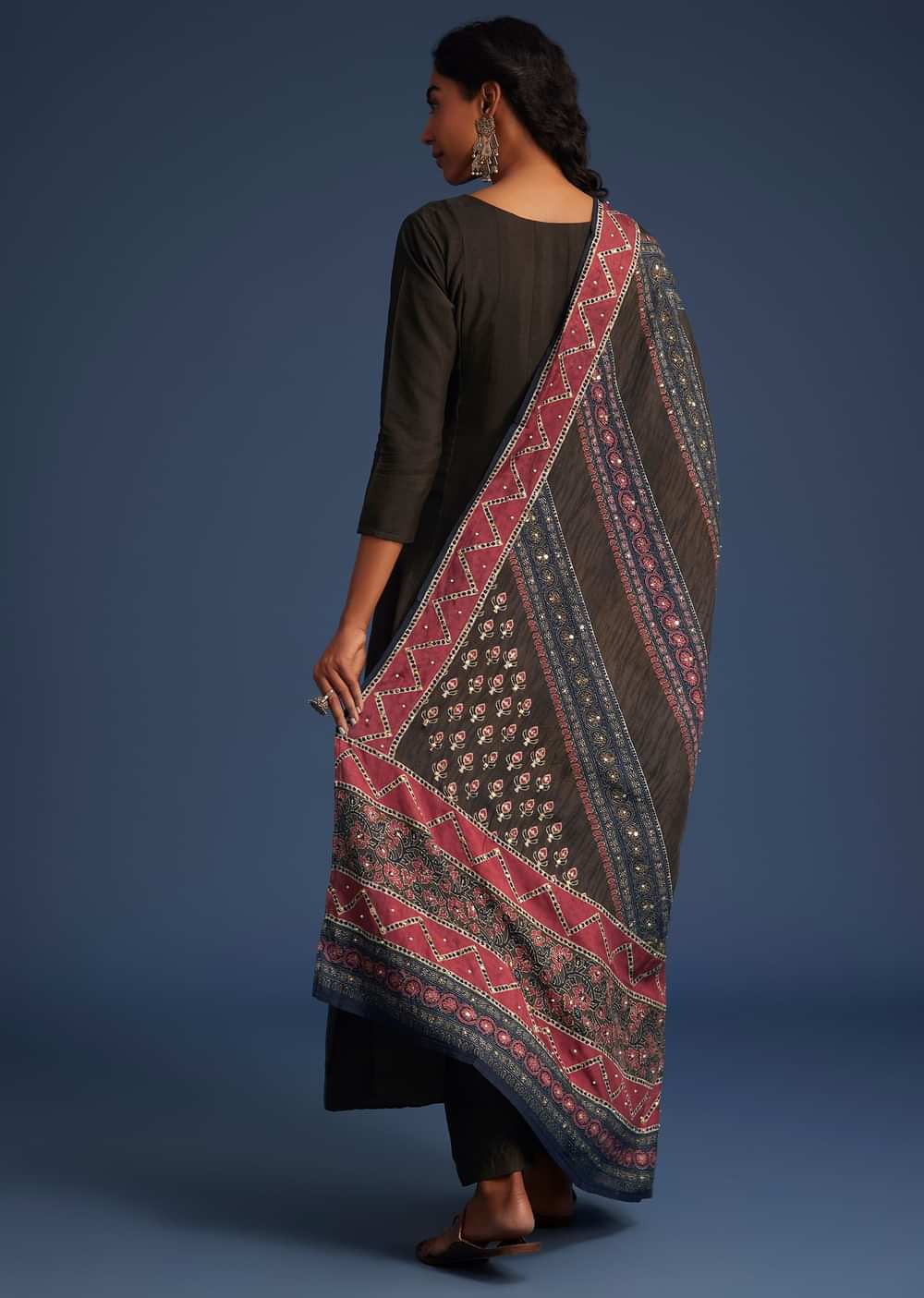 Dark Brown Silk Anarkali Set With Ajrakh Print Dupatta