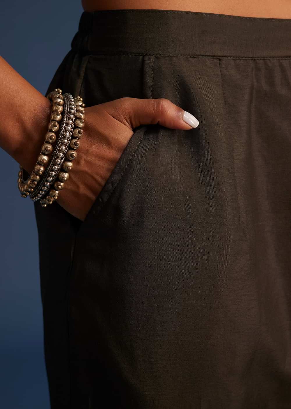 • Immerse Yourself In The Richness Of Heritage With This Dark Brown Silk Anarkali Adorned With Intricate Mirror Work Moti Beads Zardosi And Shimmering Sequins.