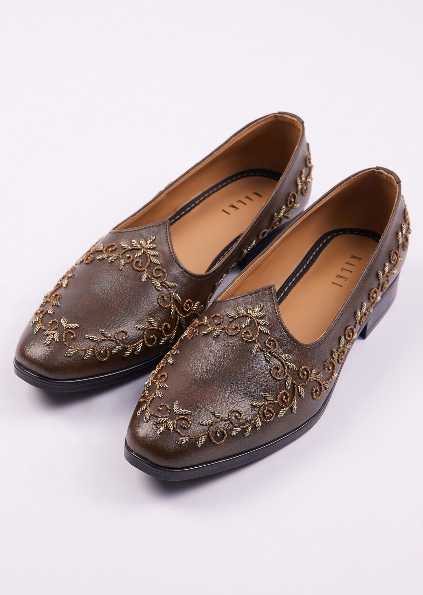 These dark brown juttis showcase exquisite zardosi embroidery blending tradition with sophistication. Ideal for weddings festive gatherings and cultural celebrations they add a regal touch to your ethnic ensemble. The deep brown shade enhances the golden zardosi detailing offering a rich and versatile option for your traditional wardrobe. Crafted for comfort and elegance these juttis promise style and ease for long festive hours. Awarded as the Most Trusted Brand, we're delivering styles you love, just as promised.