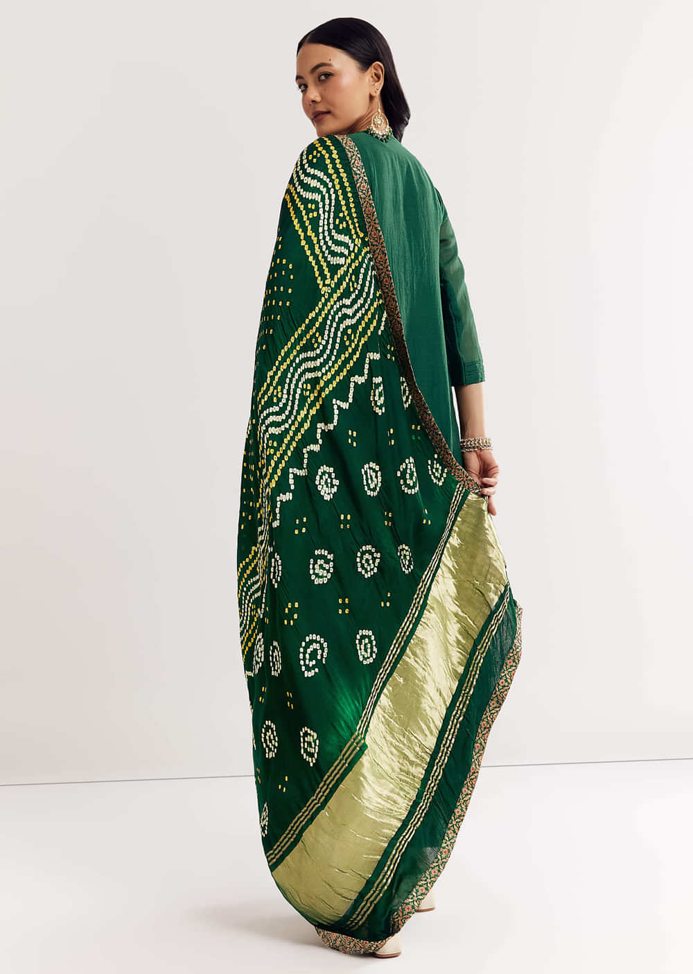 Dark Green Angrakha Kurta Set With Bandhani Dupatta