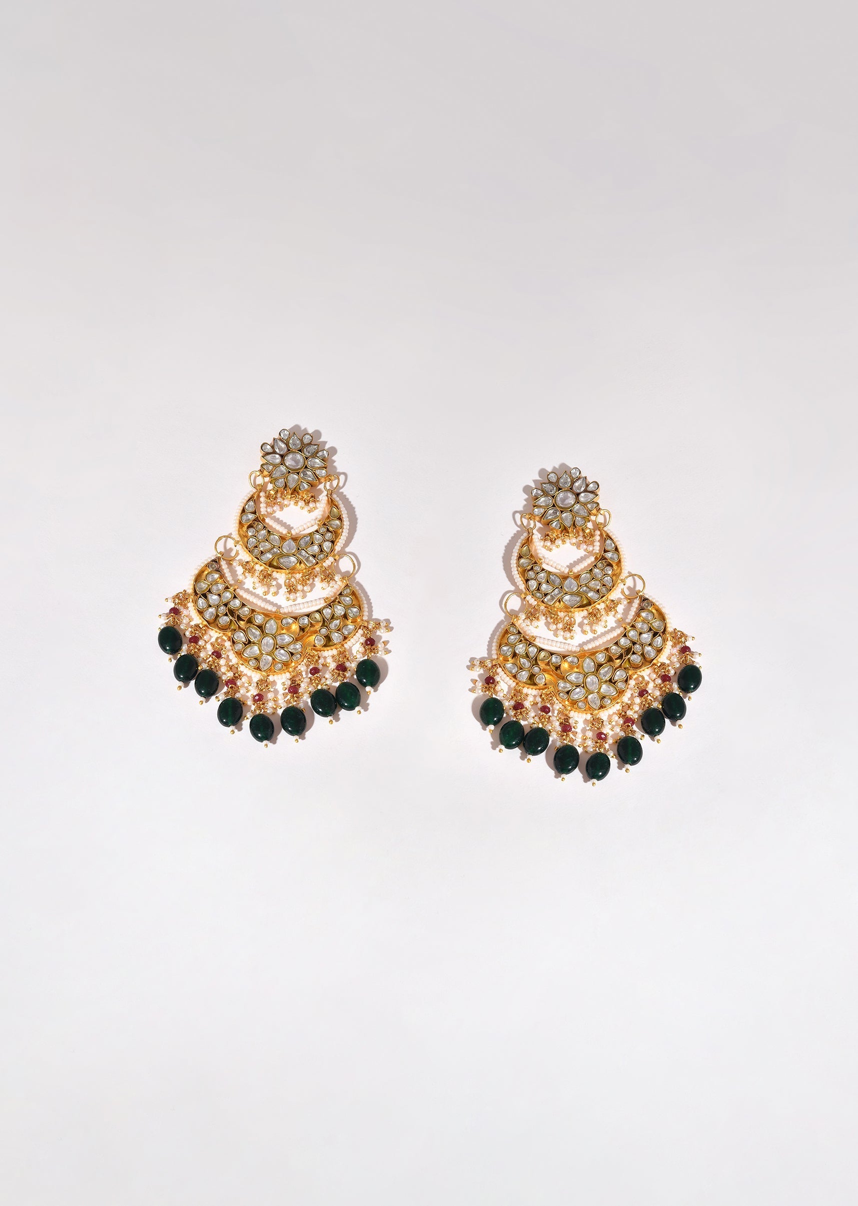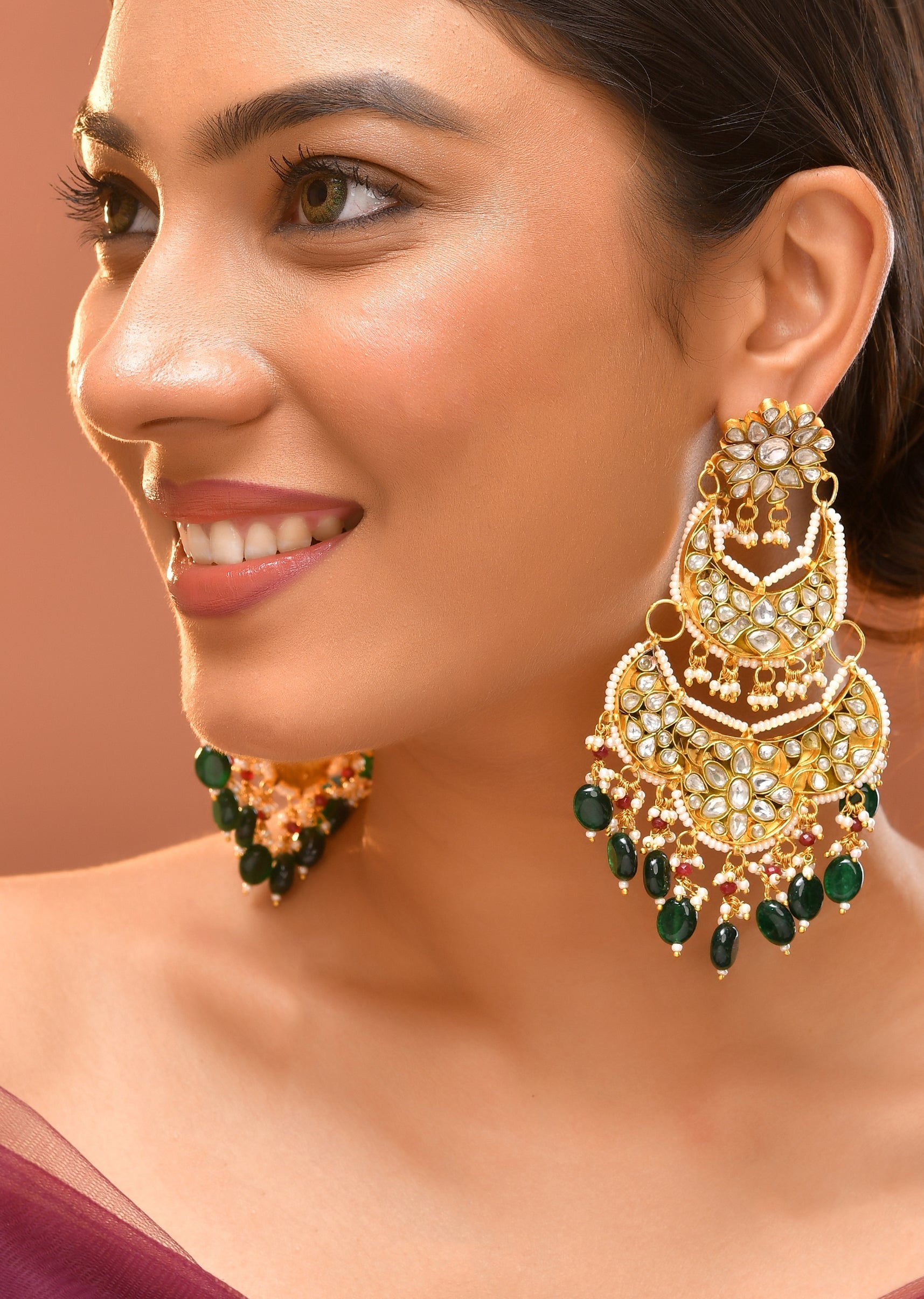 These dark green and gold earrings feature intricate pachi kundan work with detailed kundan embellishments for a festive and elegant look. Perfect for mehendi celebrations, they are ideal for bridesmaids... More Product Details