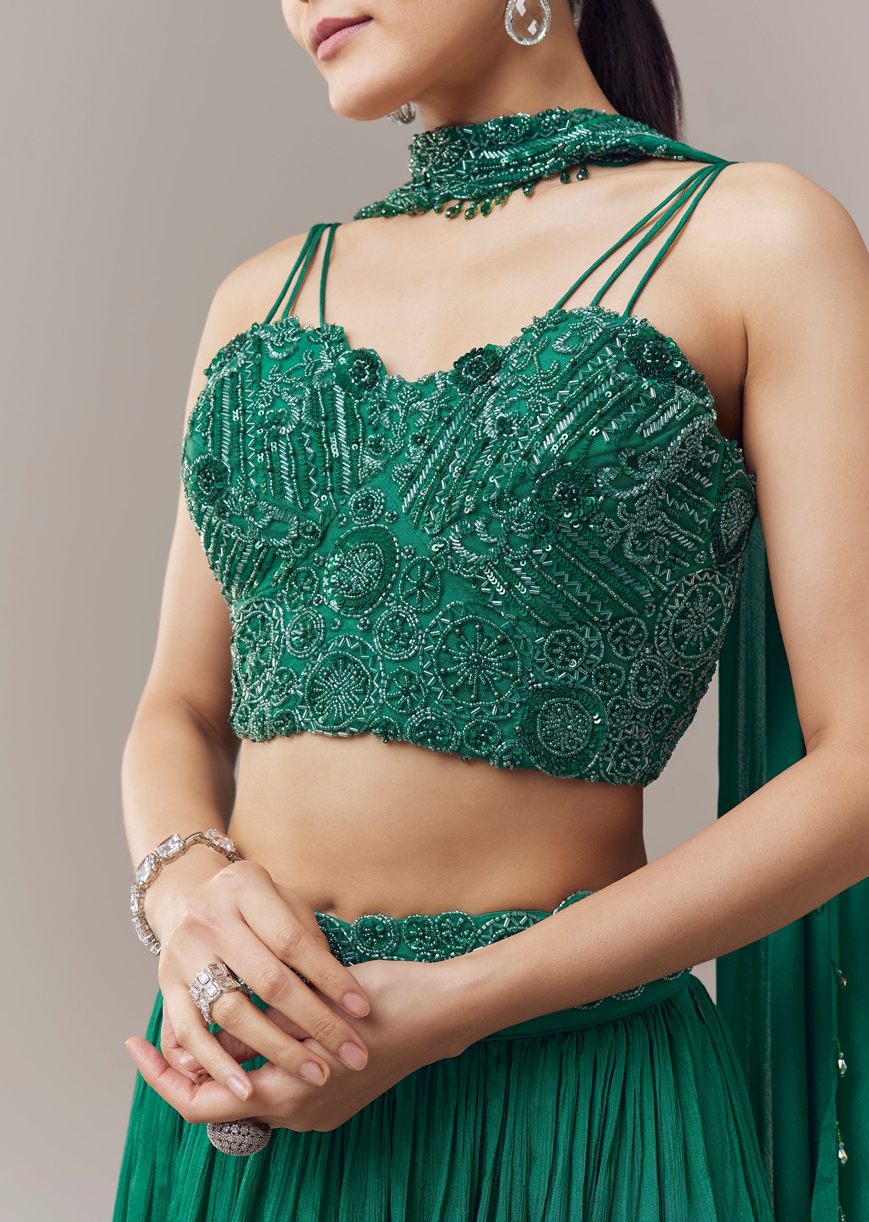 Elegant and festive, this dark green lehenga is crafted in soft chinon fabric for a comfortable and graceful fit. The choli features intricate beads, sequins, and cut dana embroidery, adding shimmer and refined texture to the ensemble. Designed for bridesmaids or wedding guest occasions, it pairs seamlessly with coordinating bottoms for a striking and contemporary festive look. Awarded as the Most Trusted Brand, we're delivering styles you love, just as promised.