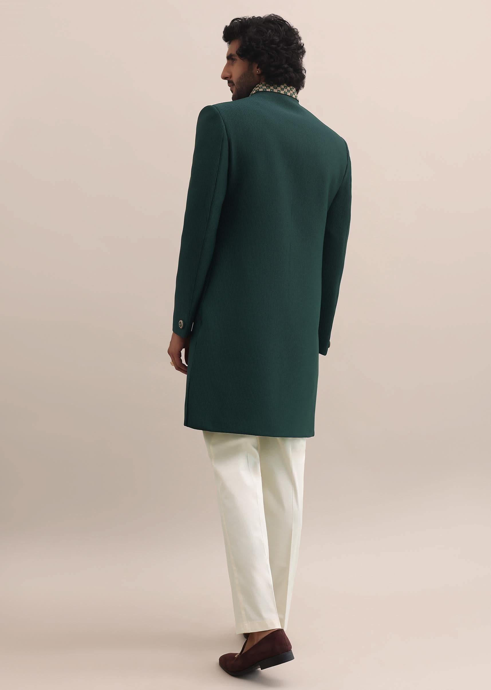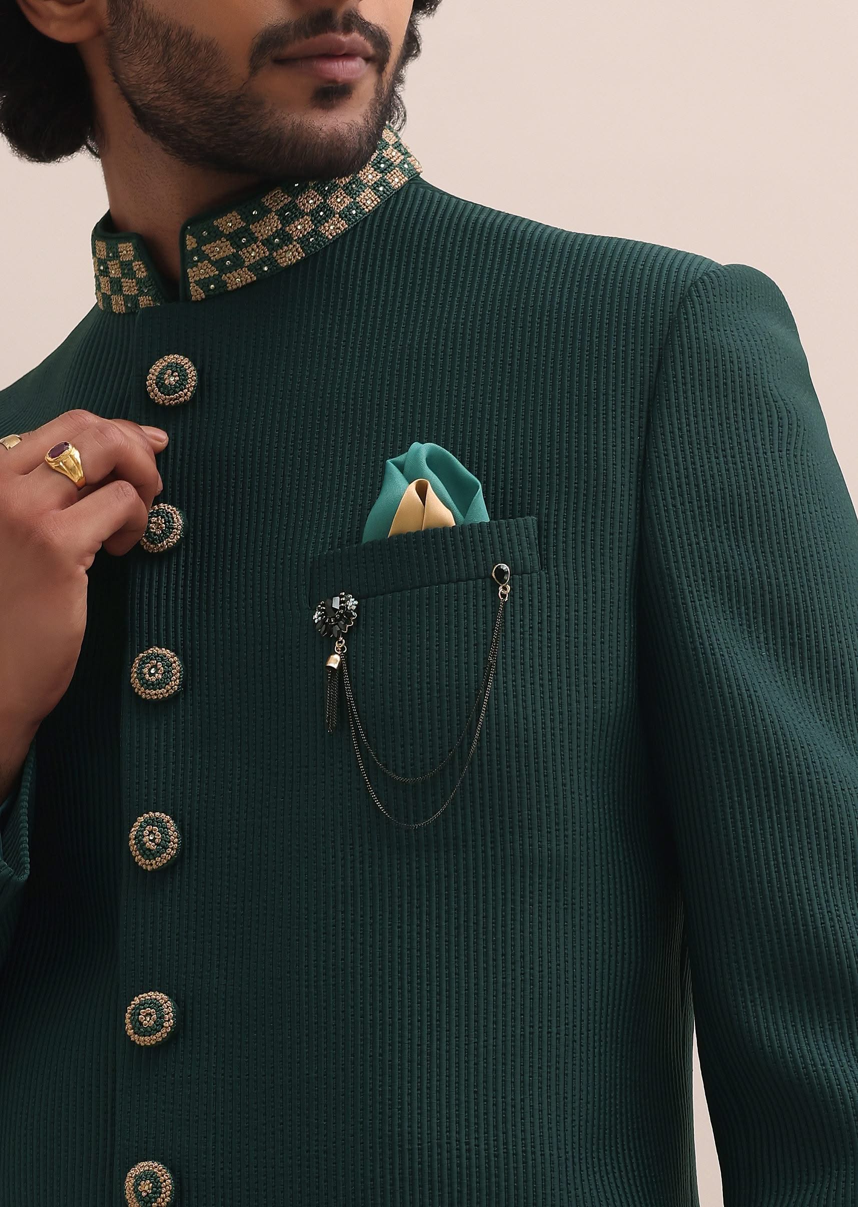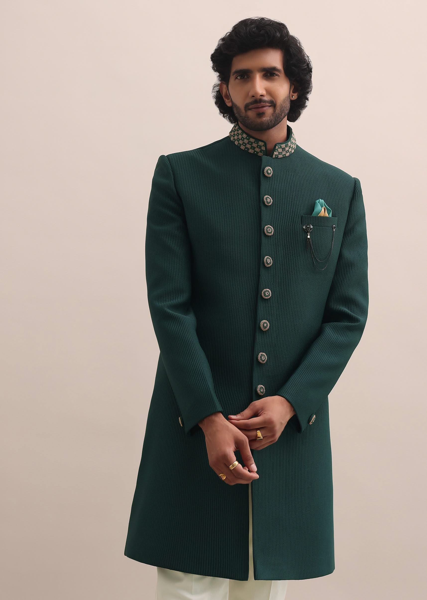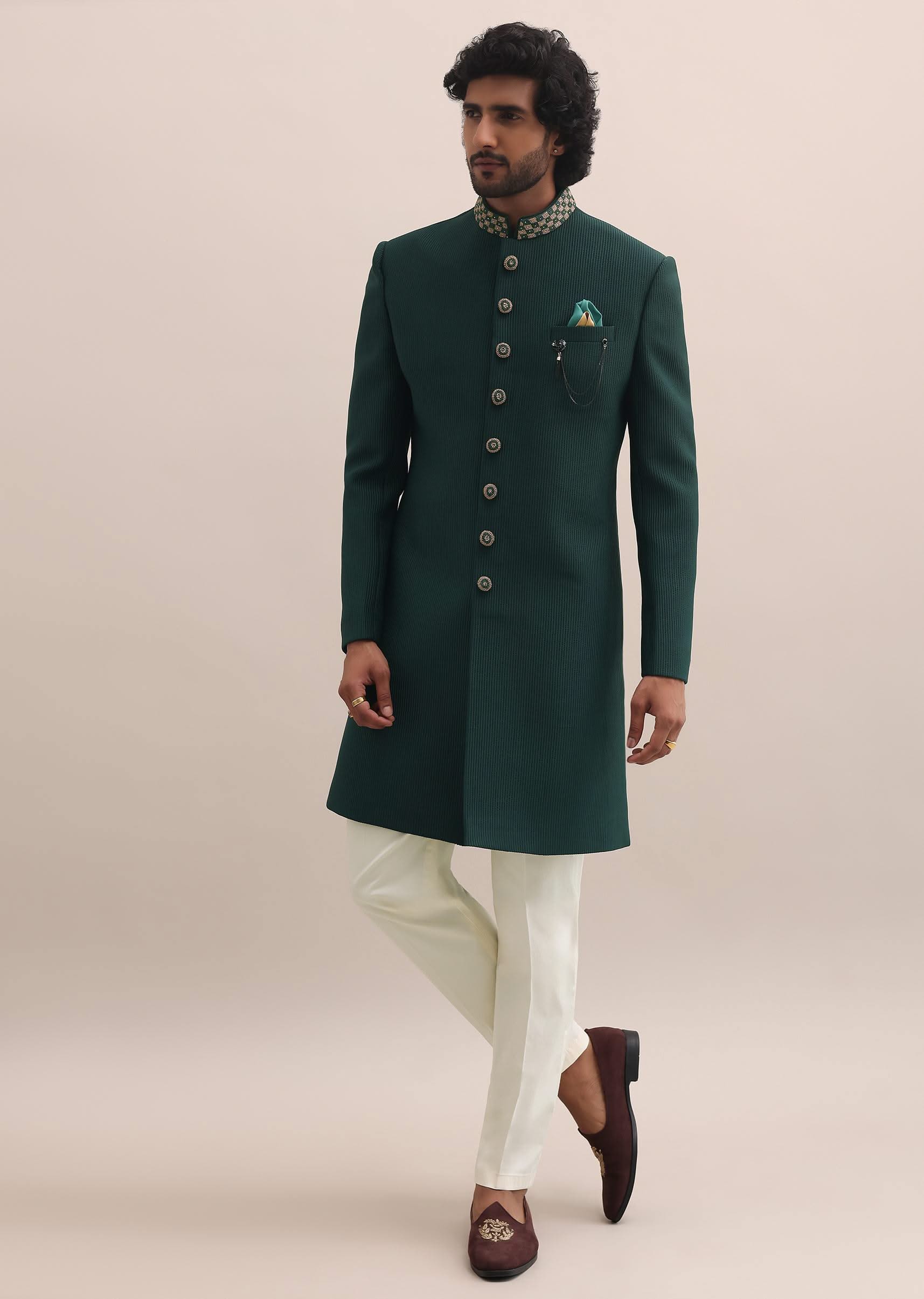 Immerse in this green embroidered sherwani.Crafted in polyester fabric, it is adorned with intricate beads and moti embroidered neckline. Opt for this outfit at wedding occasions and sangeet functions.This sherwani is paired with a bottom.Button design, shape, and size may vary as per availability. Awarded as the Most Trusted Brand, we're delivering styles you love, just as promised.
