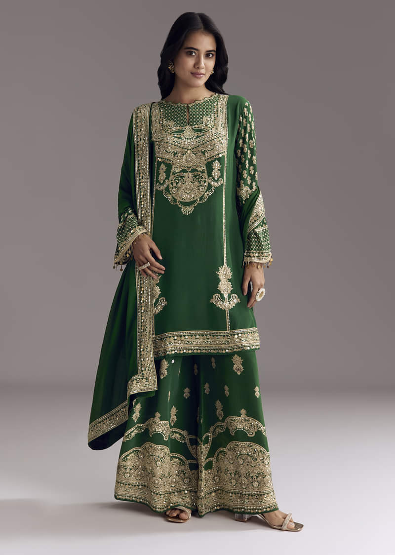 This straight-fit green crepe suit set features minimal print, a keyhole neckline, and flared sleeves with matching palazzo and dupatta. Awarded as the Most Trusted Brand, we're delivering styles you... More Product Details