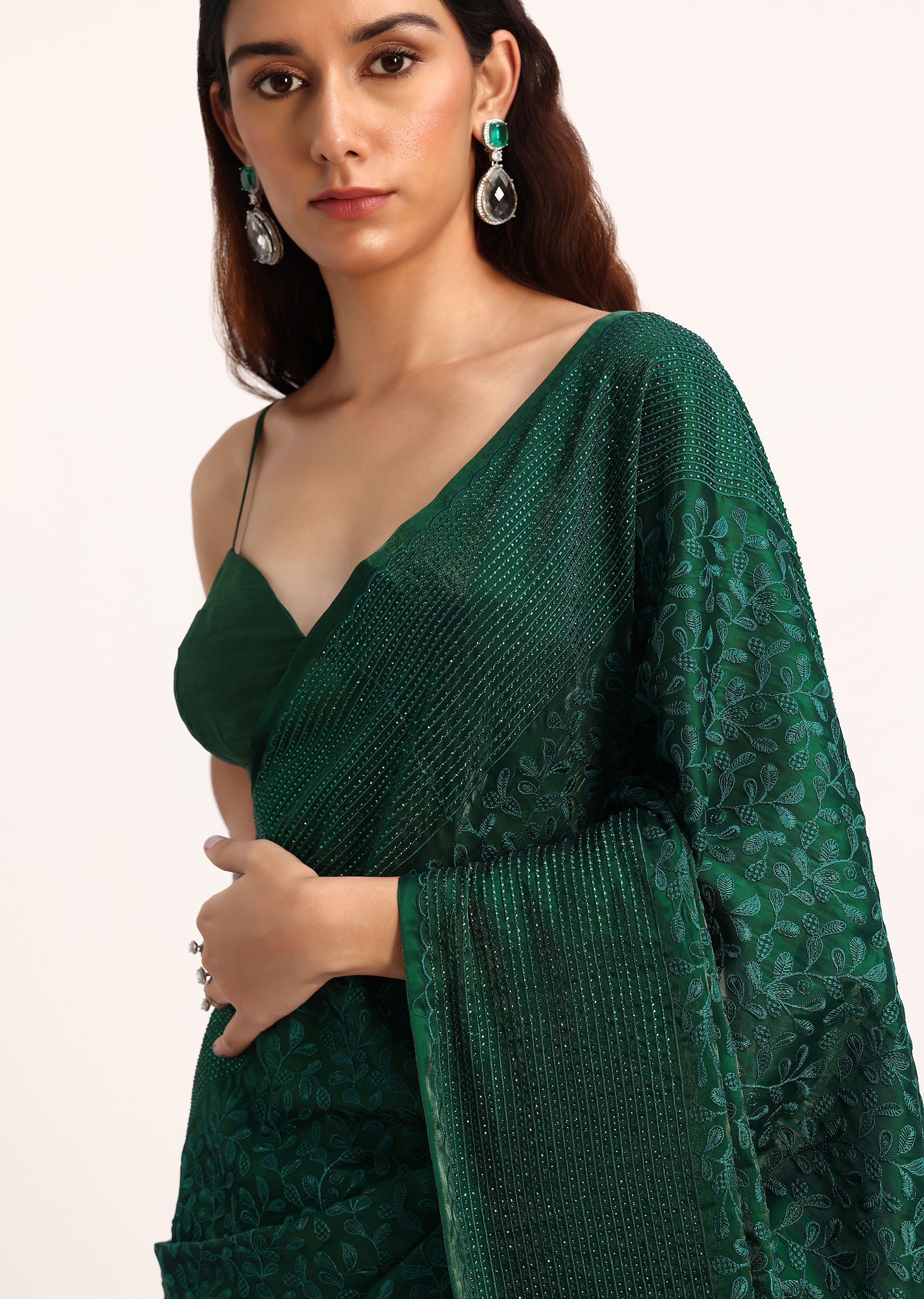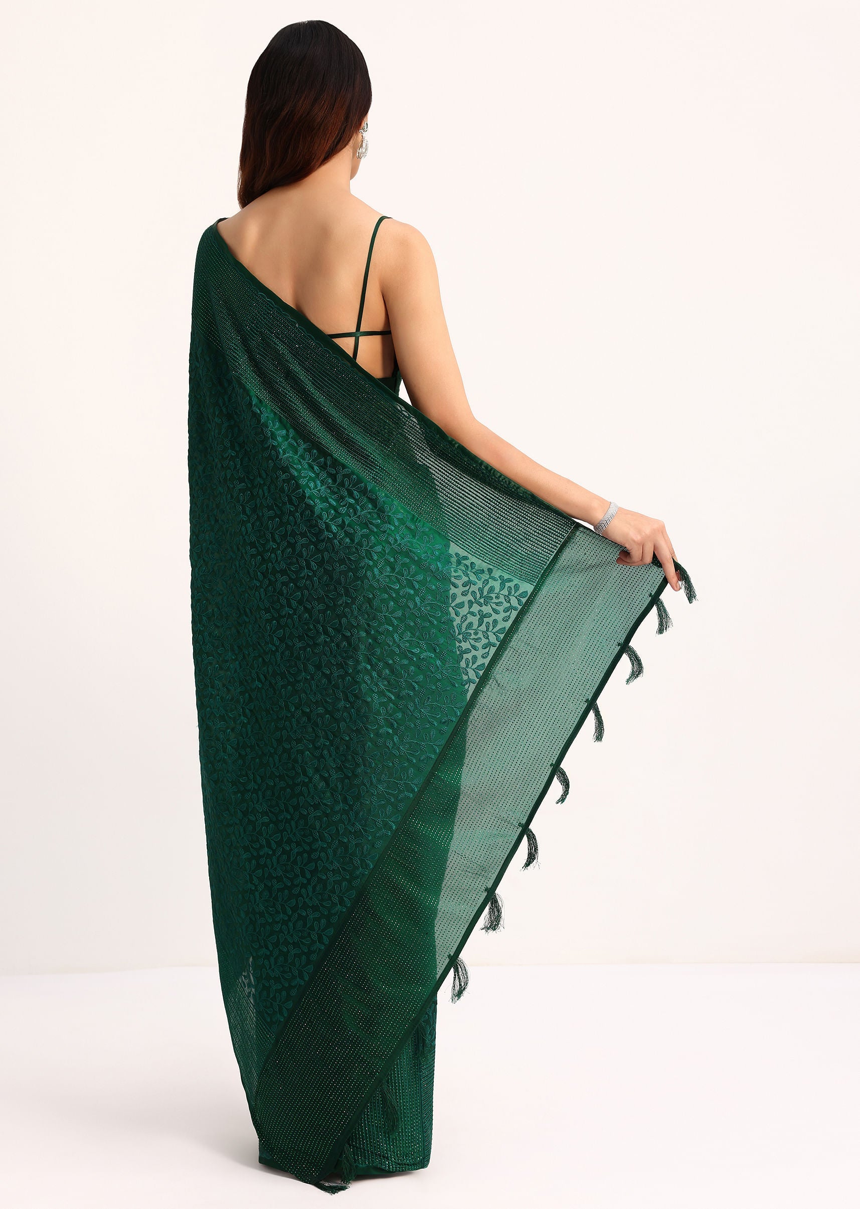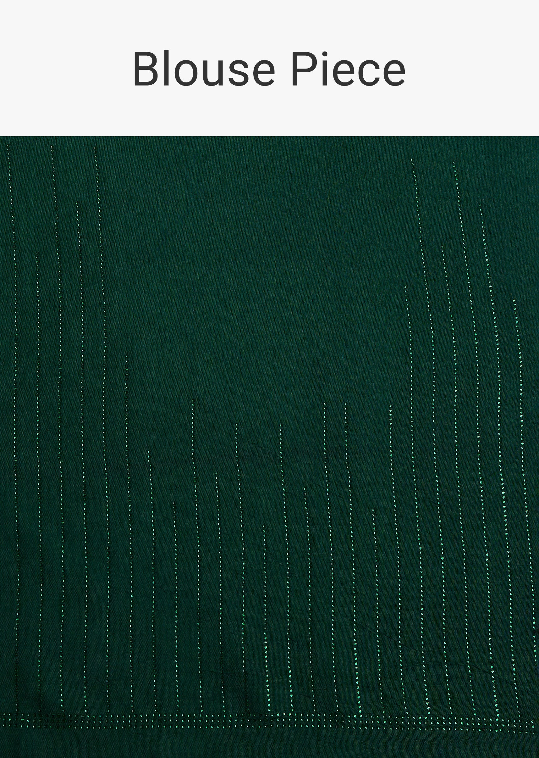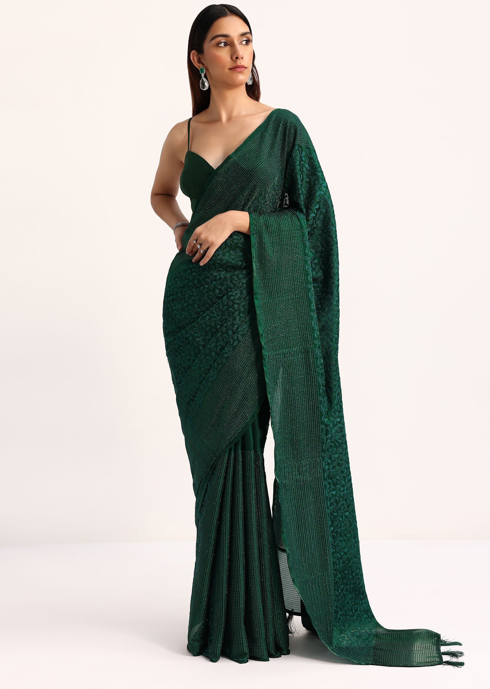 Dark Green Tissue Saree With Thread And Stone Embroidery And Unstitched Blouse
