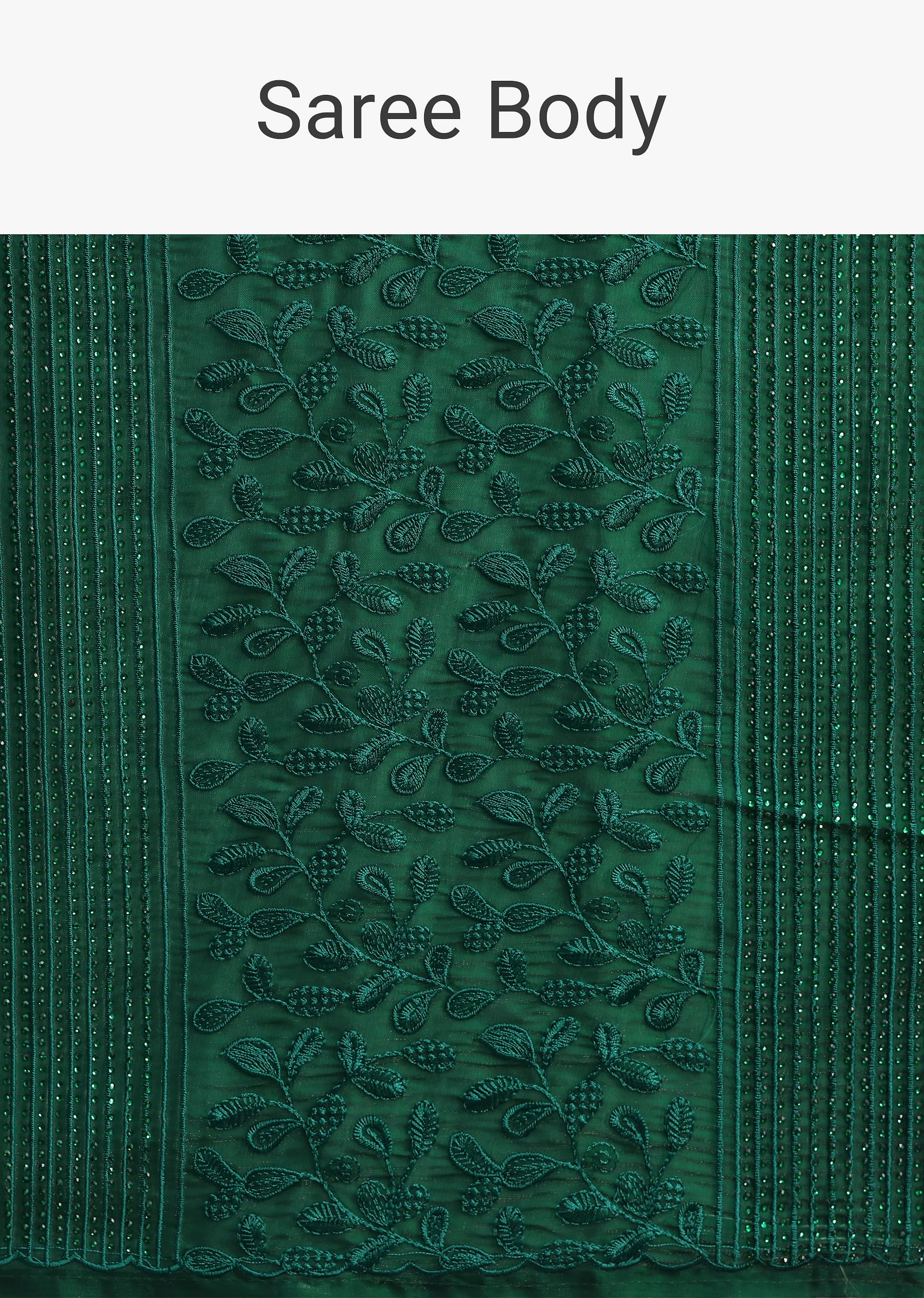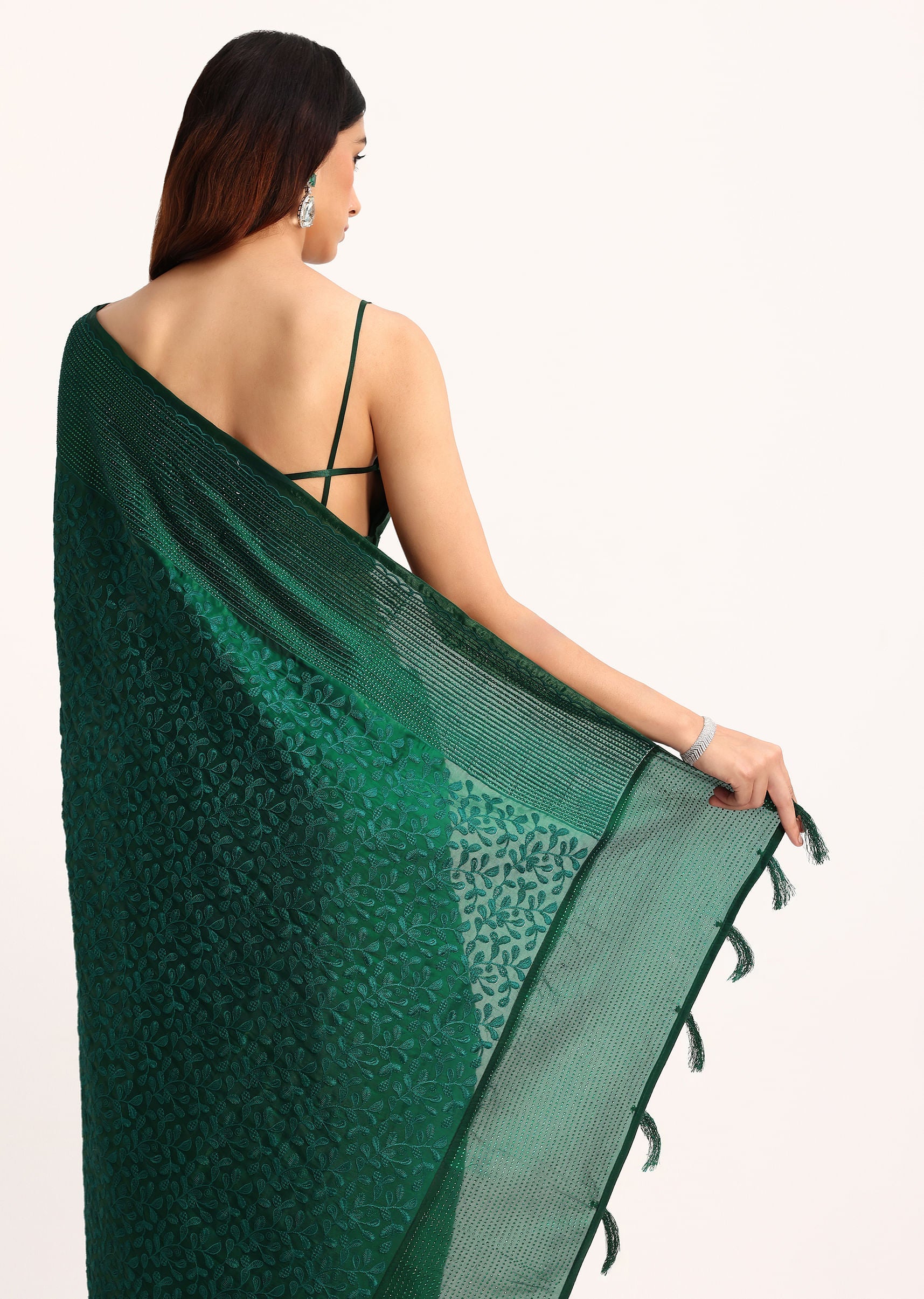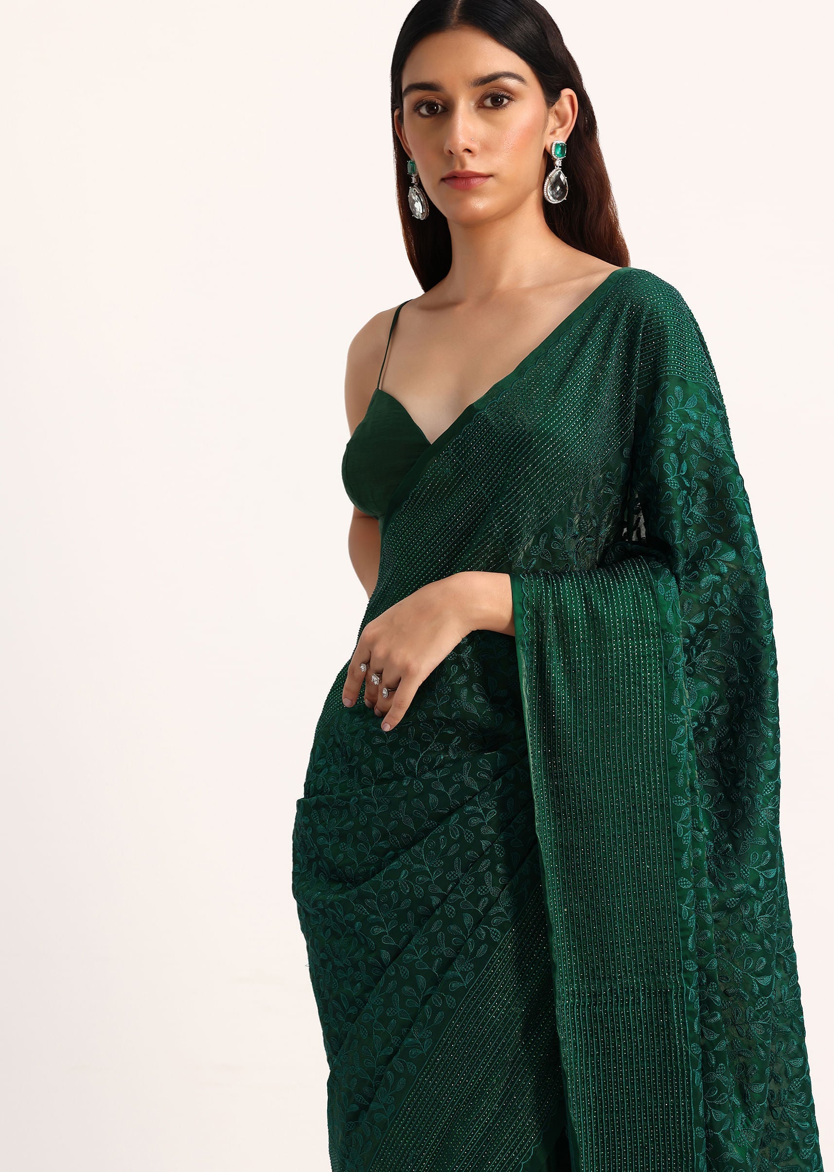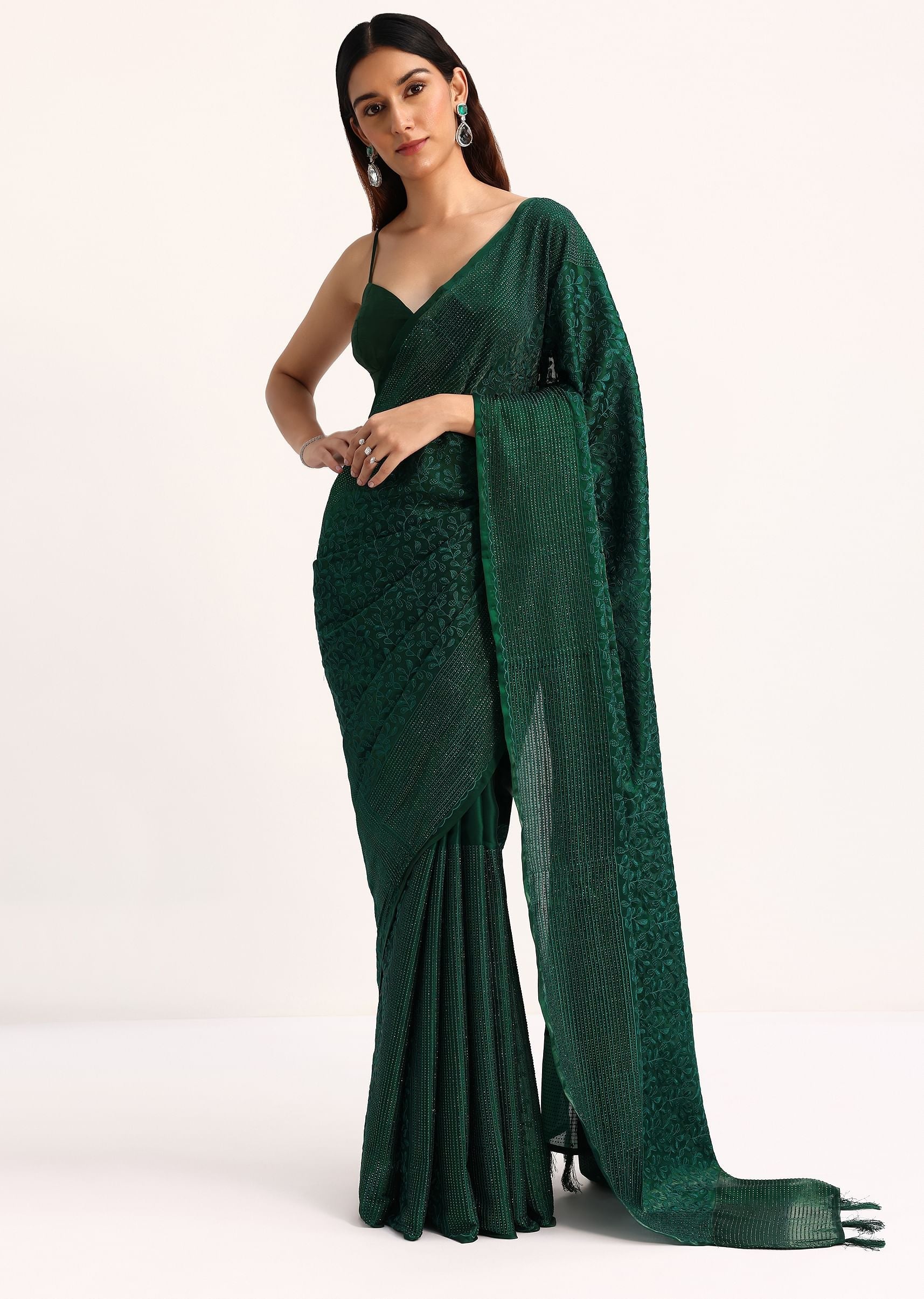 Dark Green Tissue Saree With Thread And Stone Embroidery And Unstitched Blouse