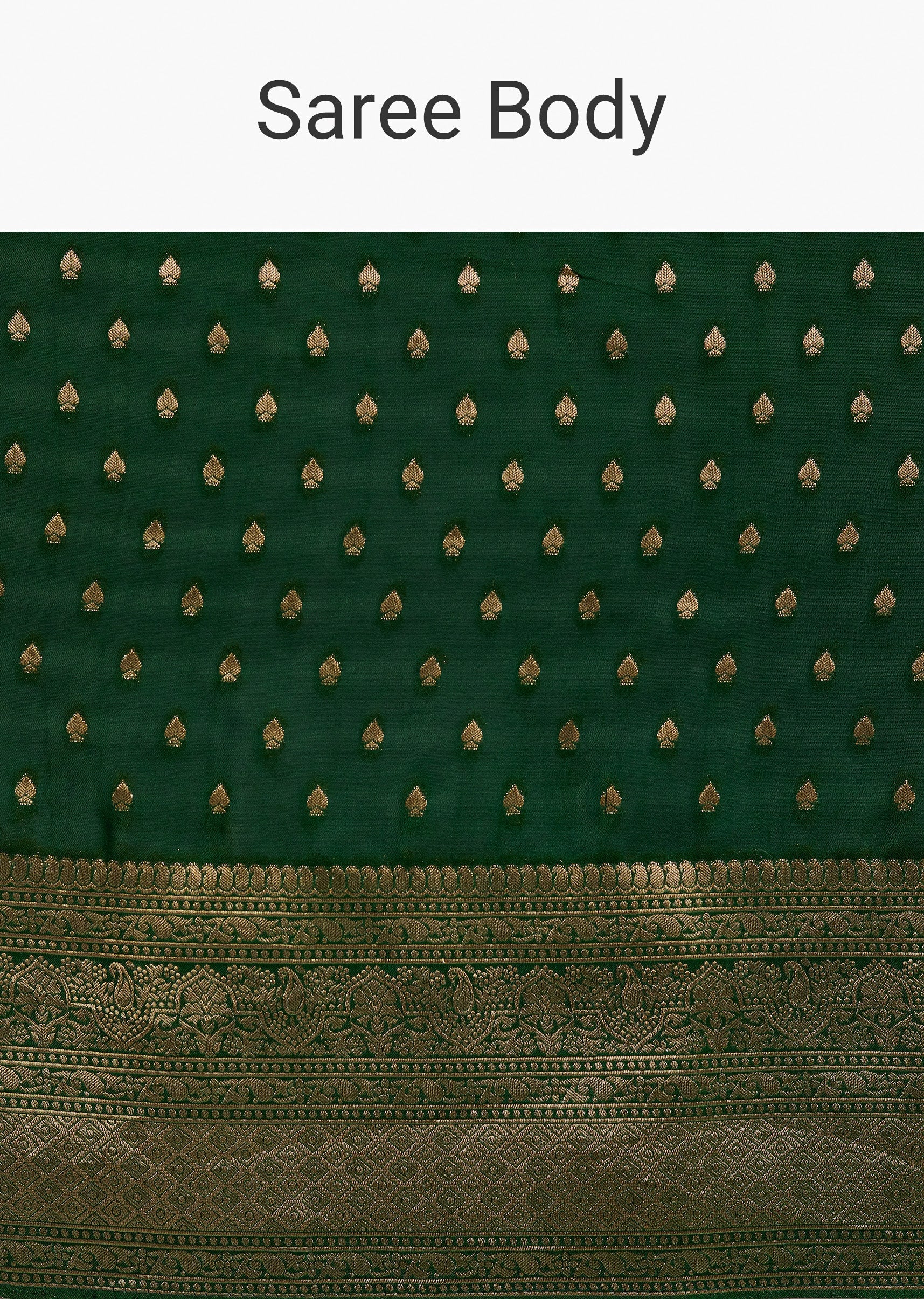- This dark green tissue silk saree radiates sophistication with its glossy texture, adorned with intricate zari work on the border and pallu.
