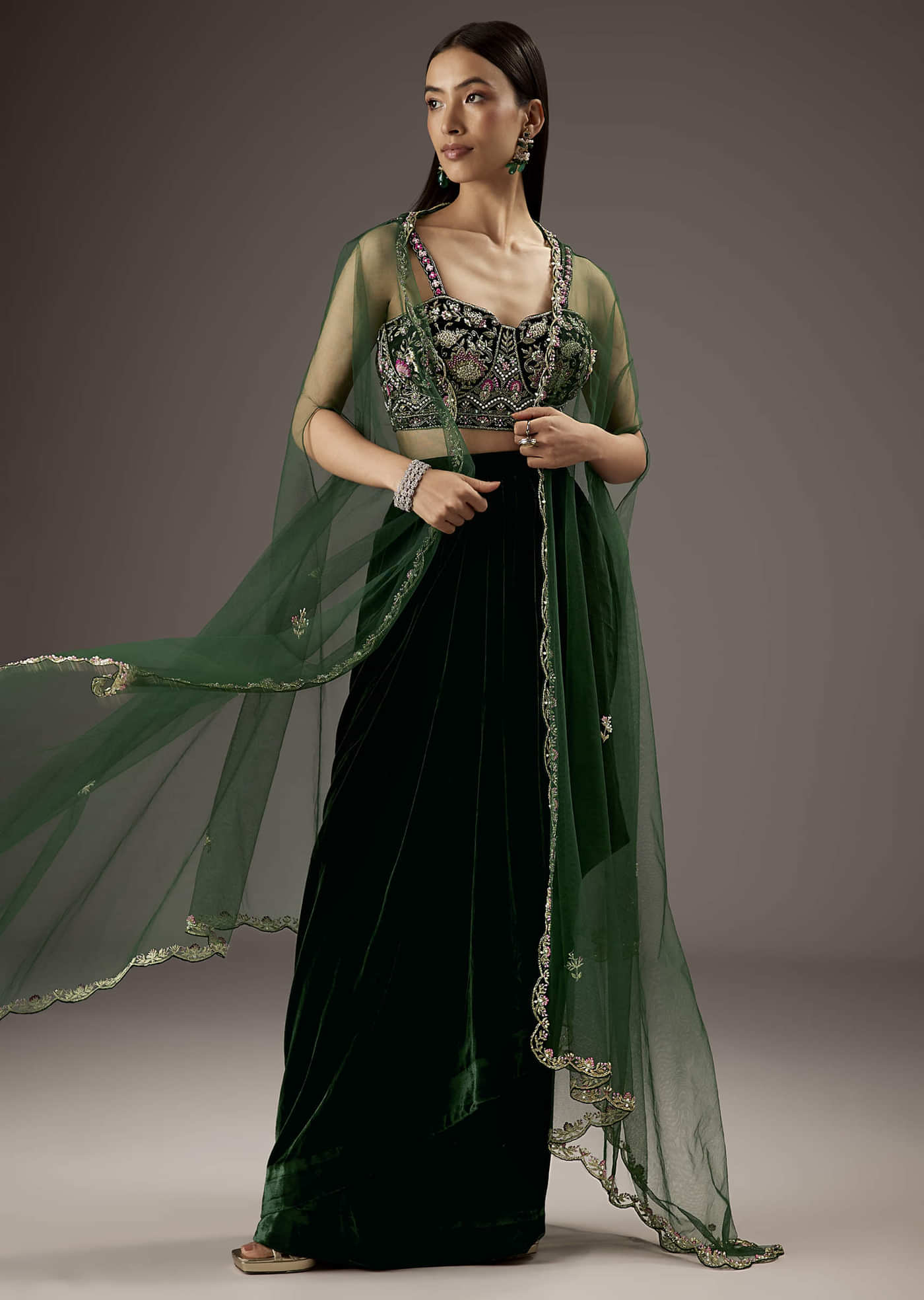 Dark Green Velvet Crop Top Skirt With Heavy Embroidery