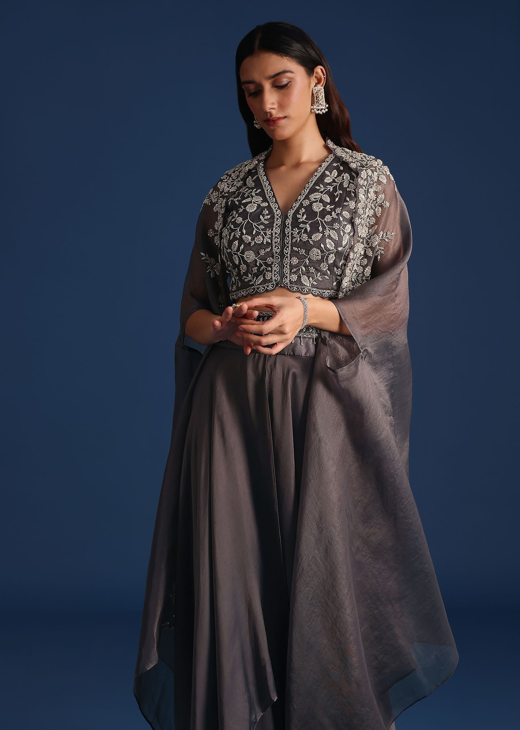 Dark Grey Asymmetric Organza Jacket With Crop Top And Draped Skirt