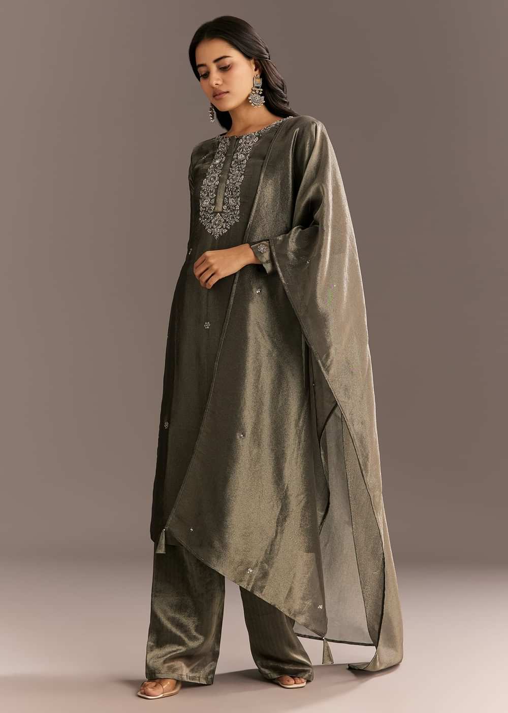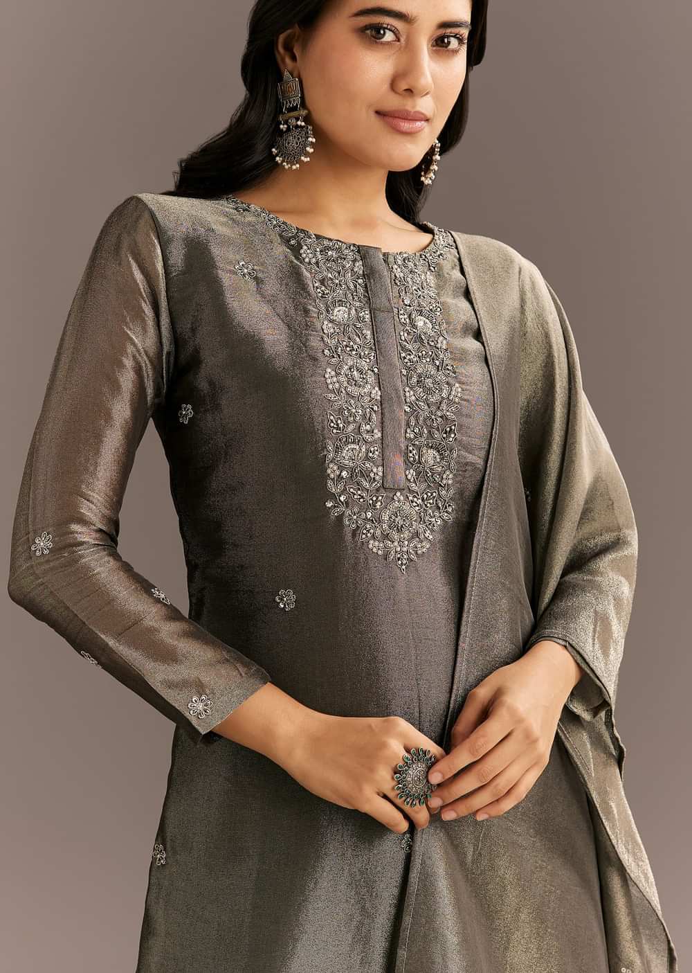 Dark Grey Tissue Kurta Pant Set With Butti Dupatta