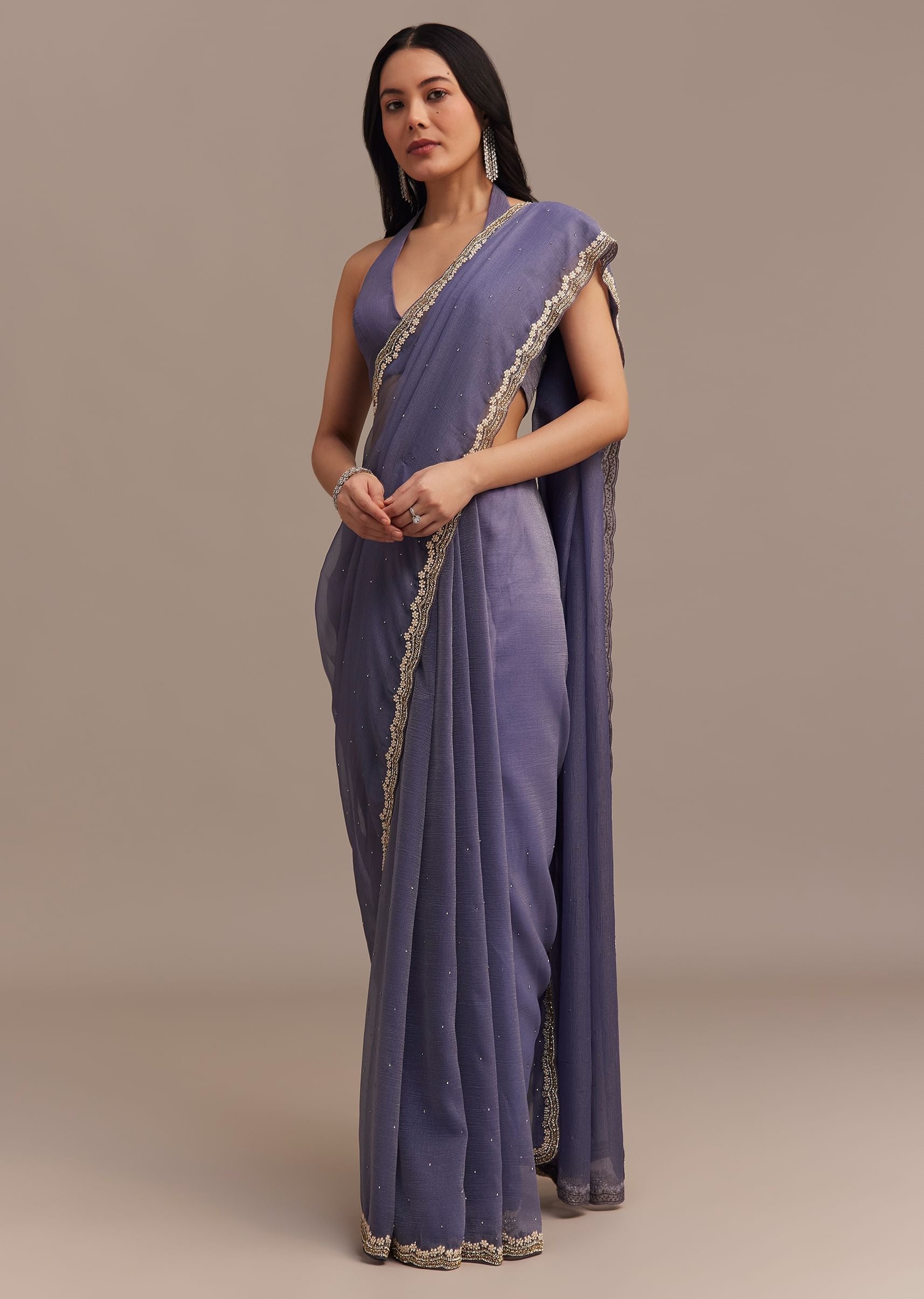 Dark Lavender Crushed Tissue Saree With Stone And Cutdana Embellished Border