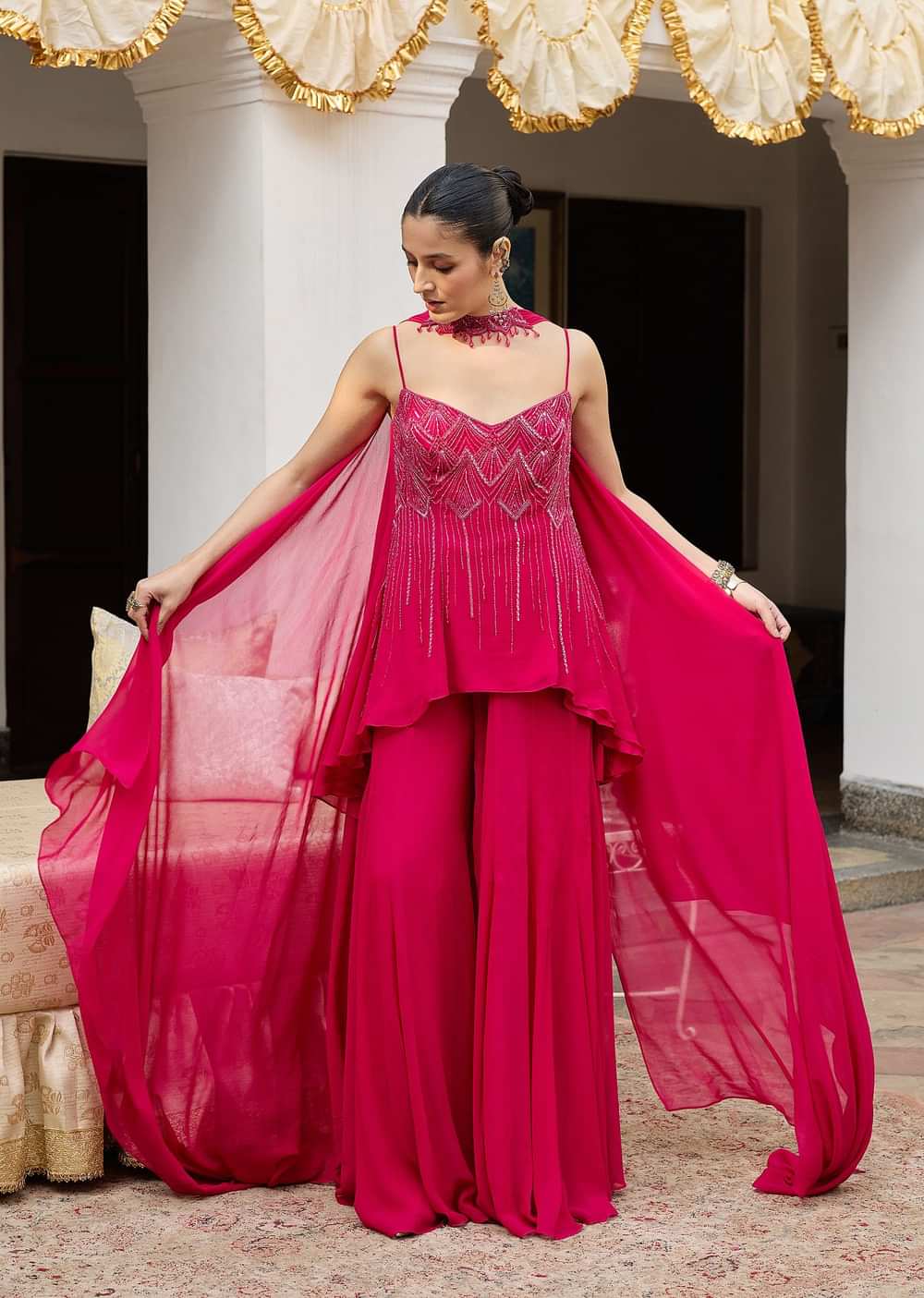 Dark Pink Georgette Sharara Set With Embroidered Kurta And Choker Dupatta