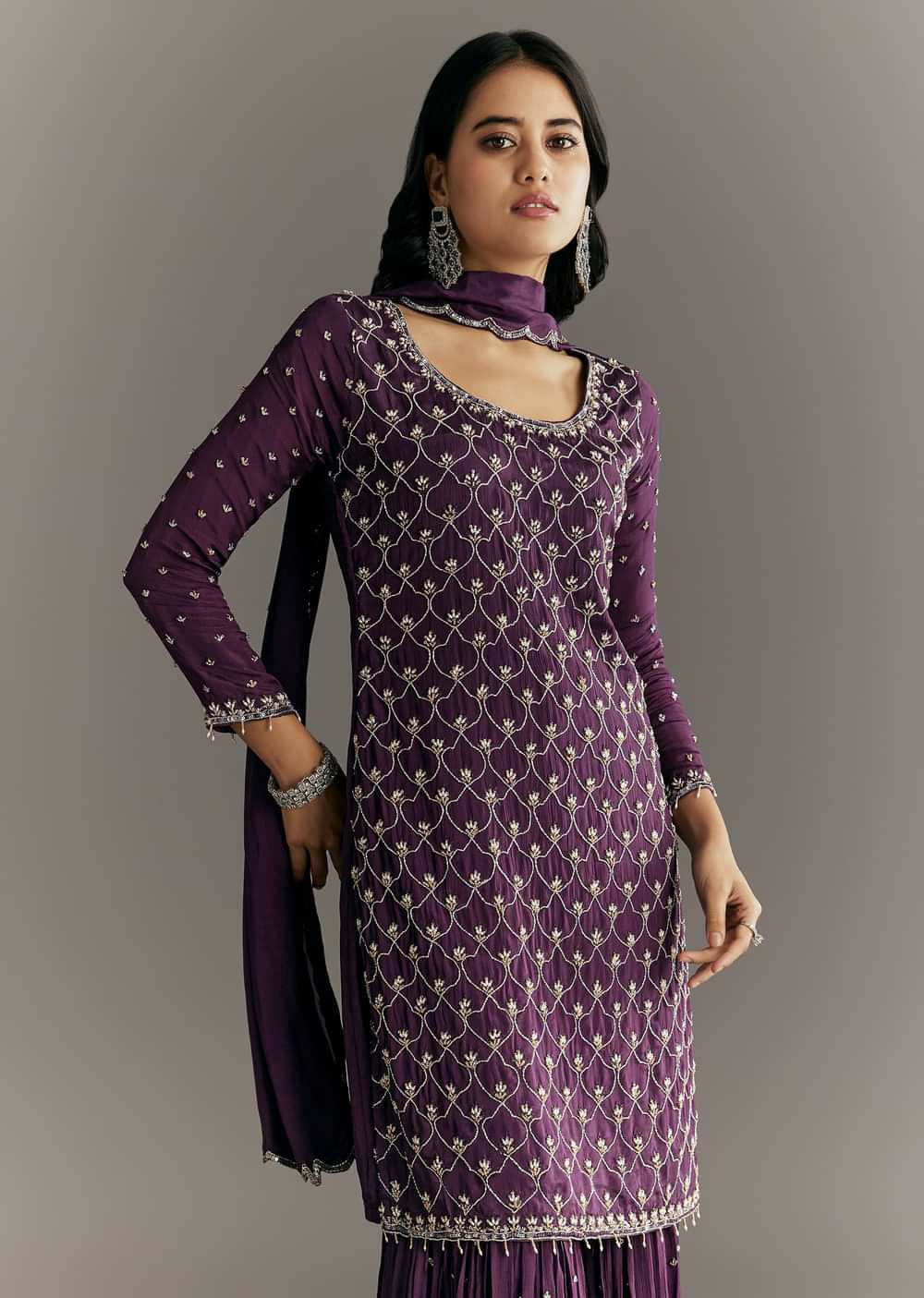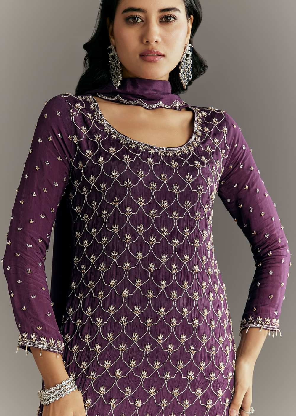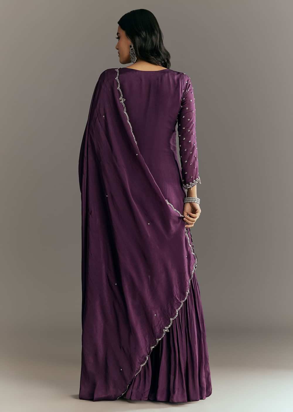 A deep purple chinon set where cut dana and beadwork grace the kurta, while the sharara glows with sequins—crafted for twilight pooja charm.