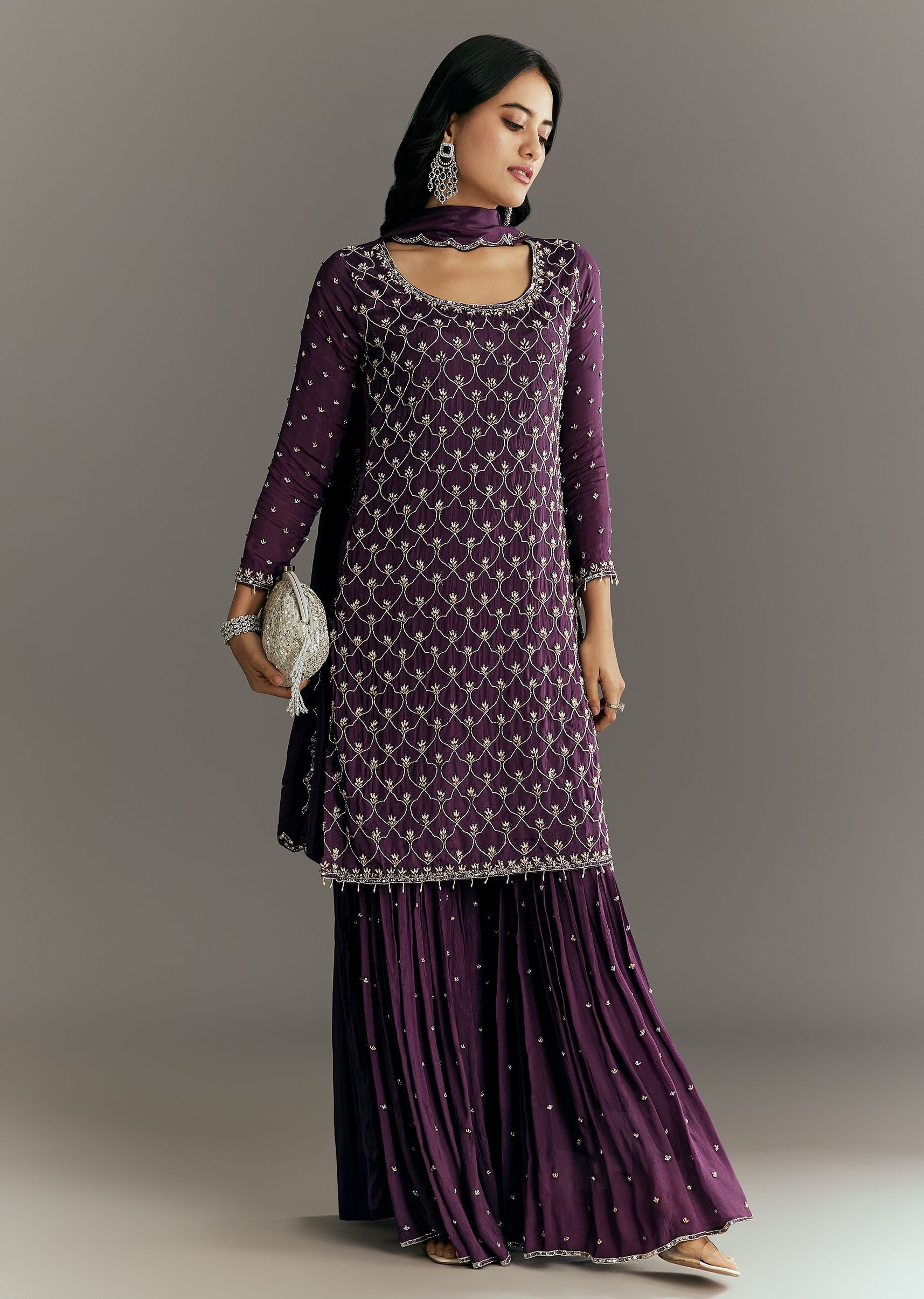 Dark Purple Chinon Sequin Work Kurta Sharara With Dupatta