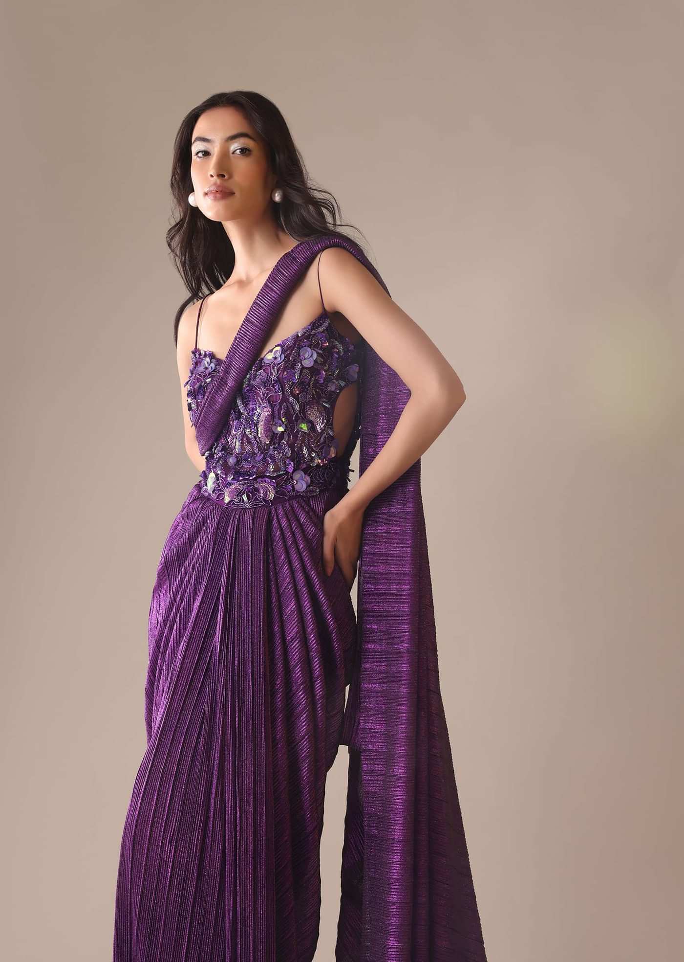 Dark Purple Heavy Embroidered Saree In Crushed Shimmer