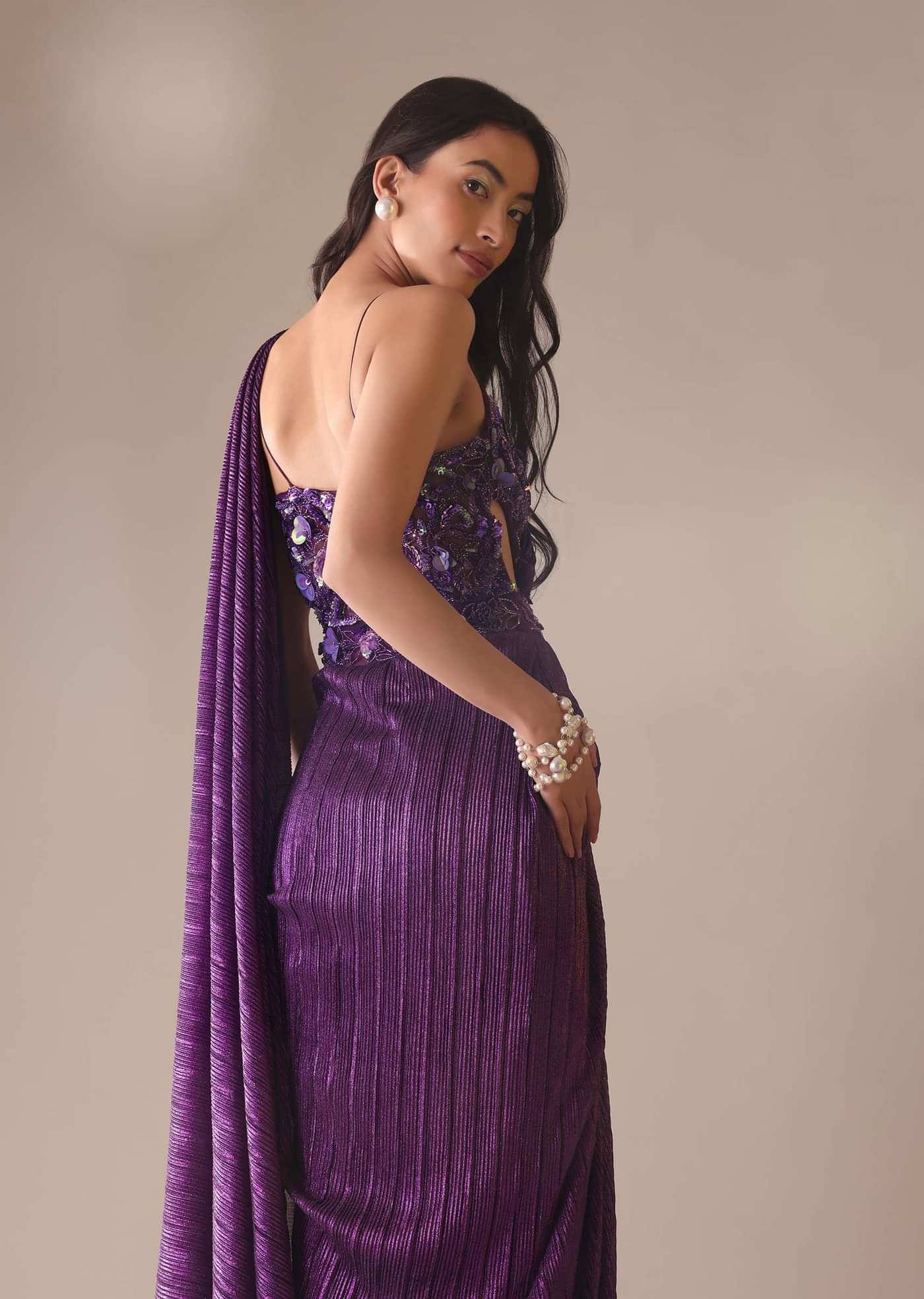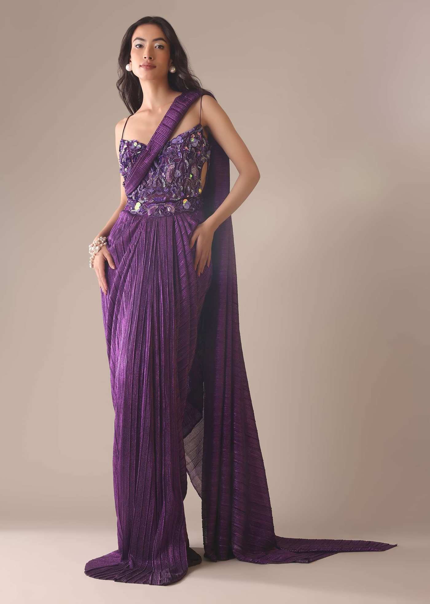 Step into a world of enchantment with our dark purple saree and blouse in crushed shimmer.The intricate handwork in cutdana sequins and beads on the set enhances its beauty.The blouse... More Product Details