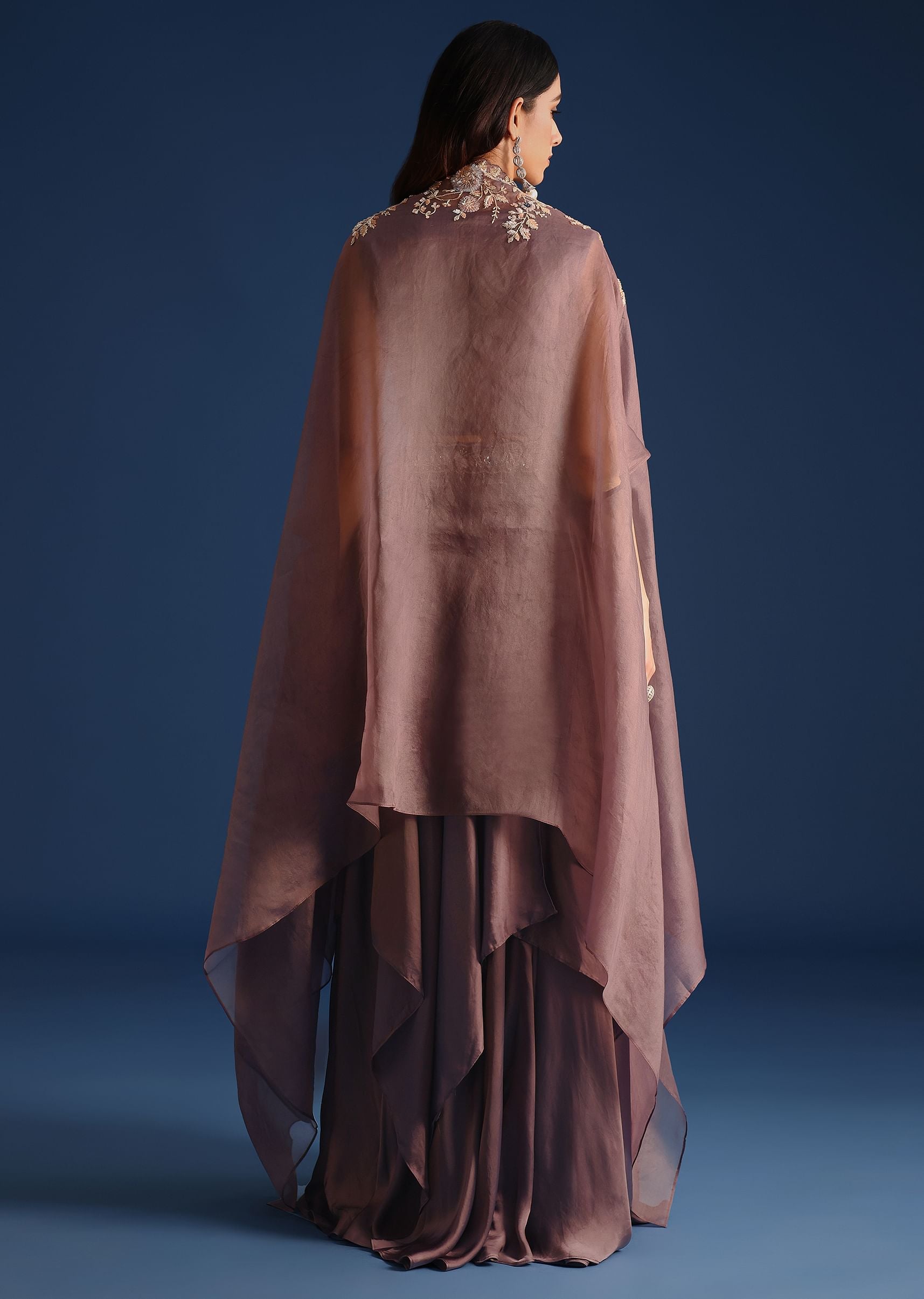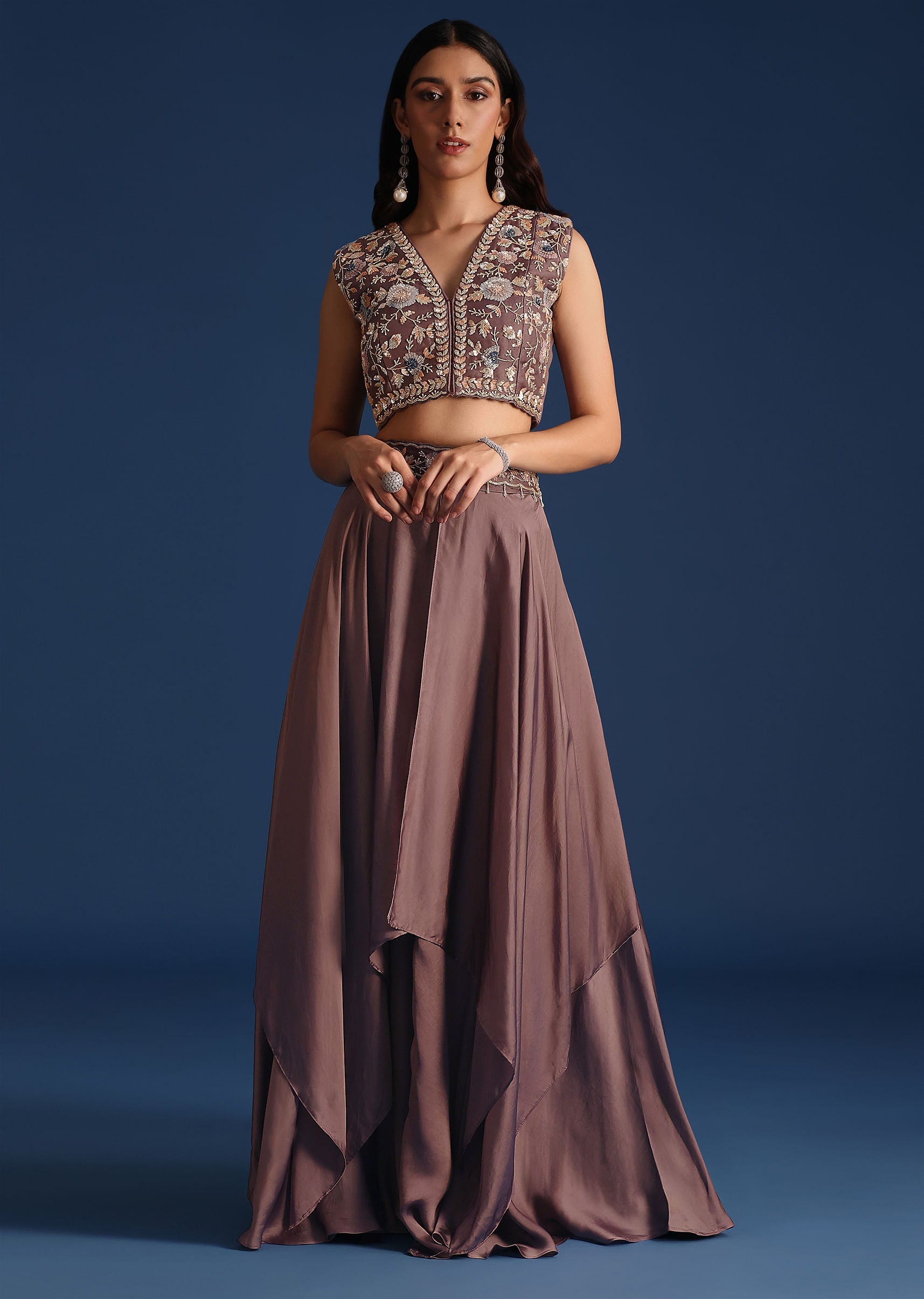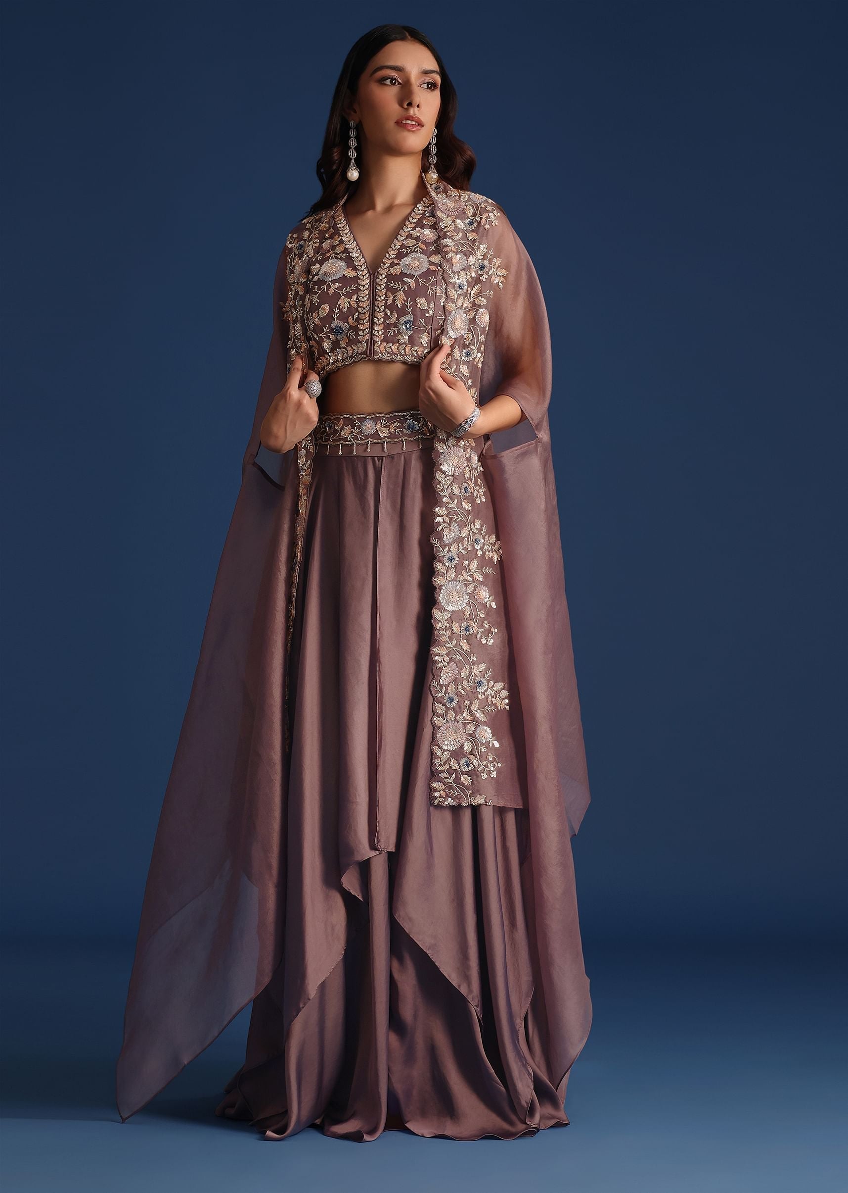 Dark Purple Jacket With Sequin Crop Top And Skirt
