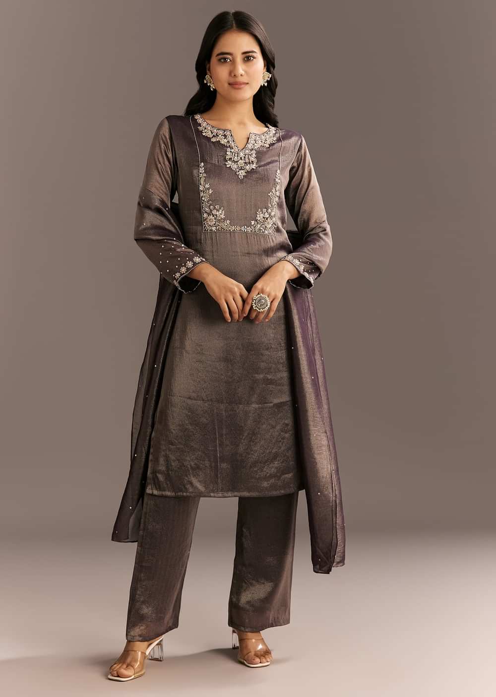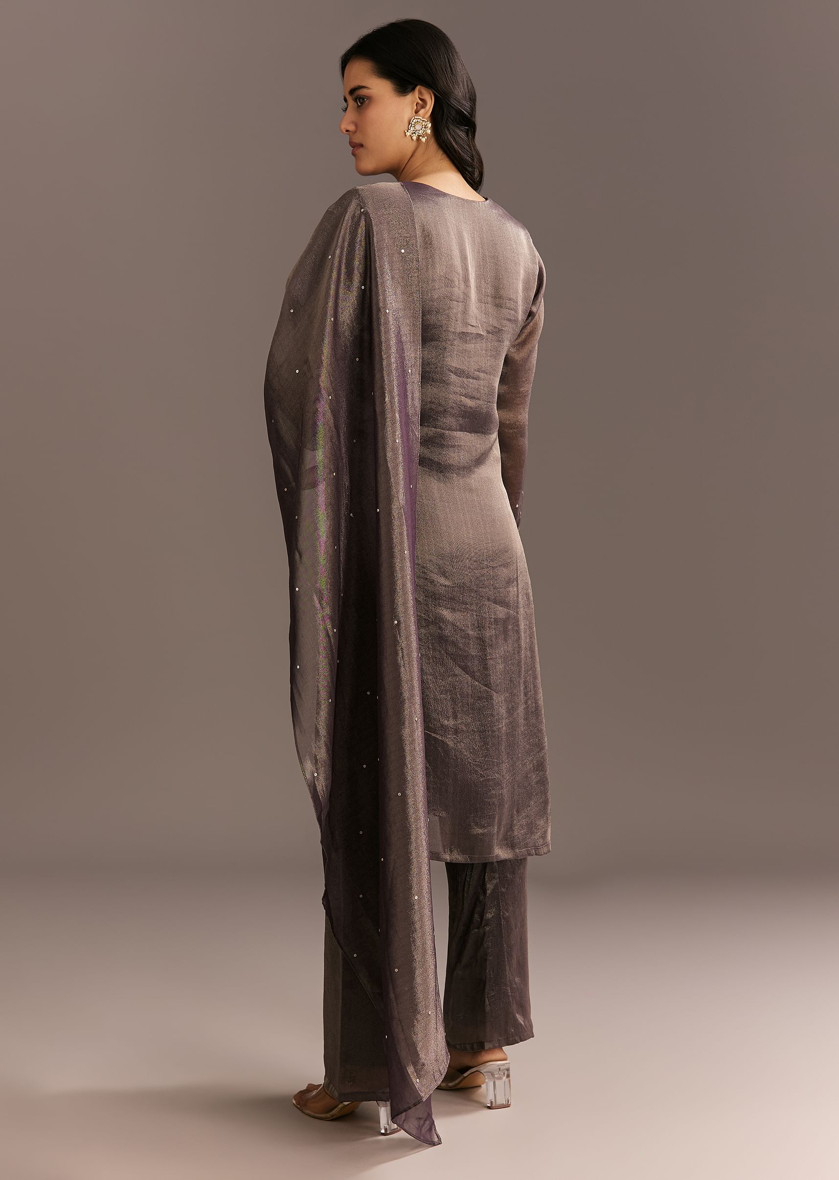 Dark Purple Organza Tissue Embroidered Kurta Pant With Embroidered Dupatta