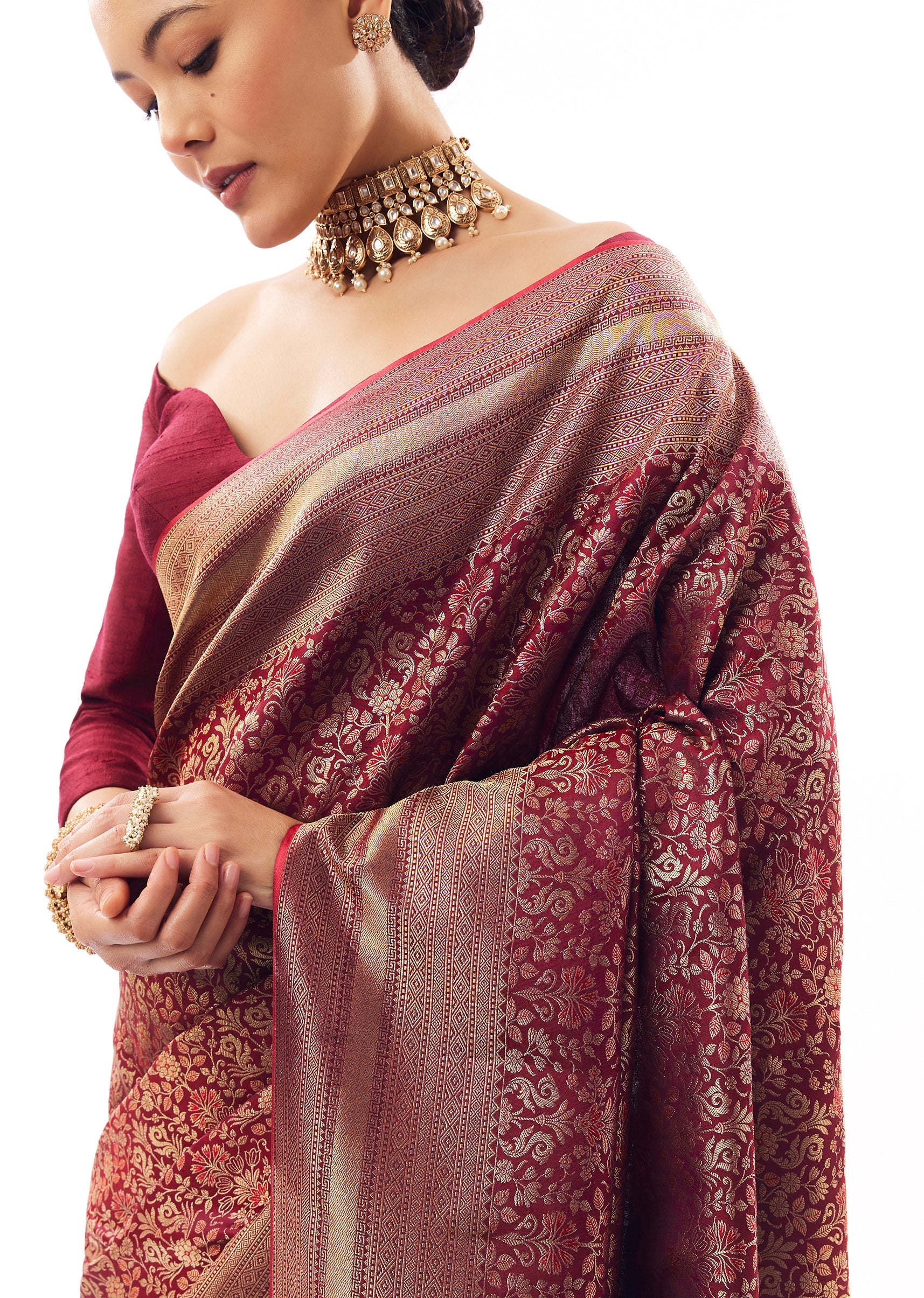 Elegant with a hint of drama—this dark purple tissue silk saree has a luminous, airy finish that looks stunning under wedding lights. The jacquard weave and floral detailing keep it... More Product Details