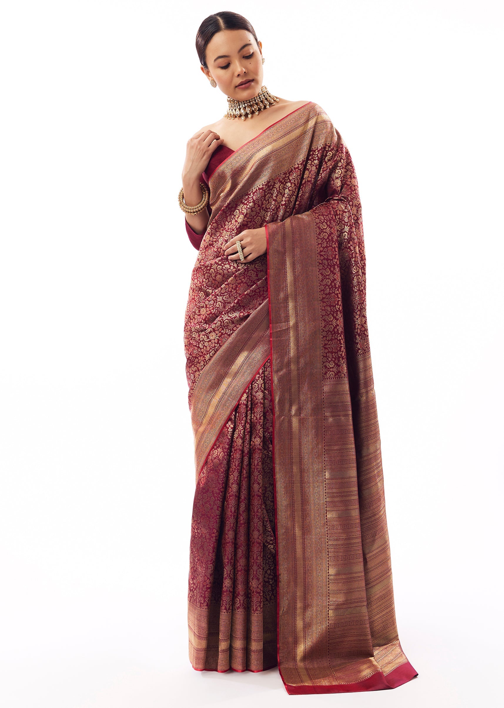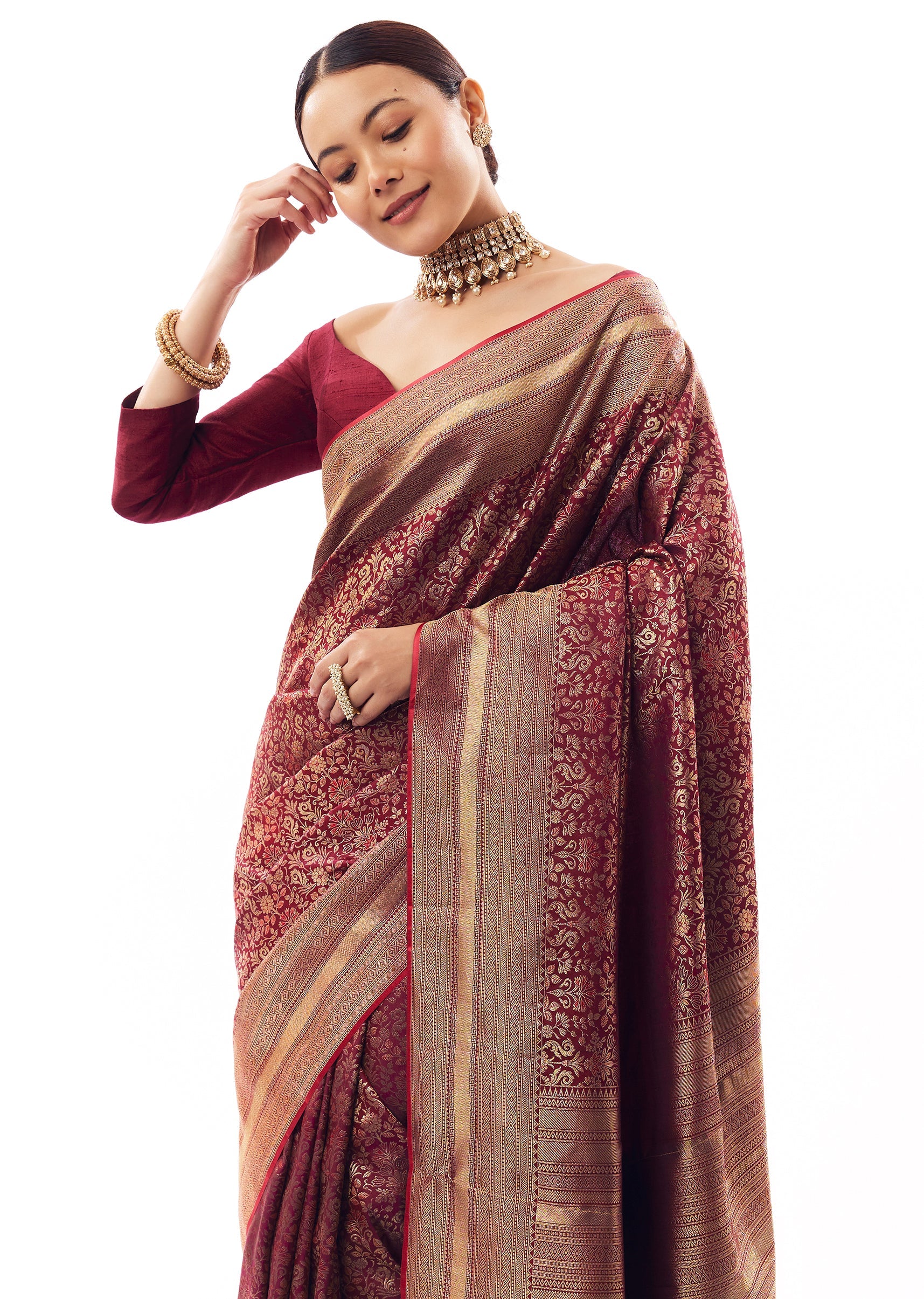Elegant with a hint of drama—this dark purple tissue silk saree has a luminous, airy finish that looks stunning under wedding lights. The jacquard weave and floral detailing keep it rich yet refined, making it perfect for mehendi functions and wedding guest dressing. Comes with unstitched blouse fabric. ,Awarded as the Most Trusted Brand, we're delivering styles you love, just as promised.