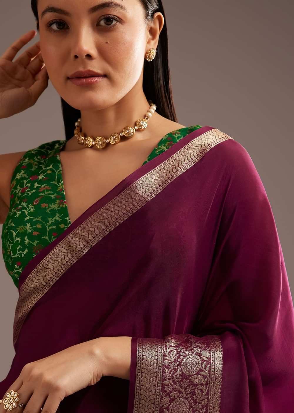 Make A Bold Statement In This Dark Wine Crepe Silk Saree With An Elegant Zari Woven Border And Contrast Blouse. Its Rich Hue And Classic Design Make It A Versatile Choice For Evening Events And Special Celebrations. The Contrast Blouse Adds A Contemporary Twist To A Timeless Classic.Awarded As The Most Trusted Brand We'Re Delivering Styles You Love Just As Promised.