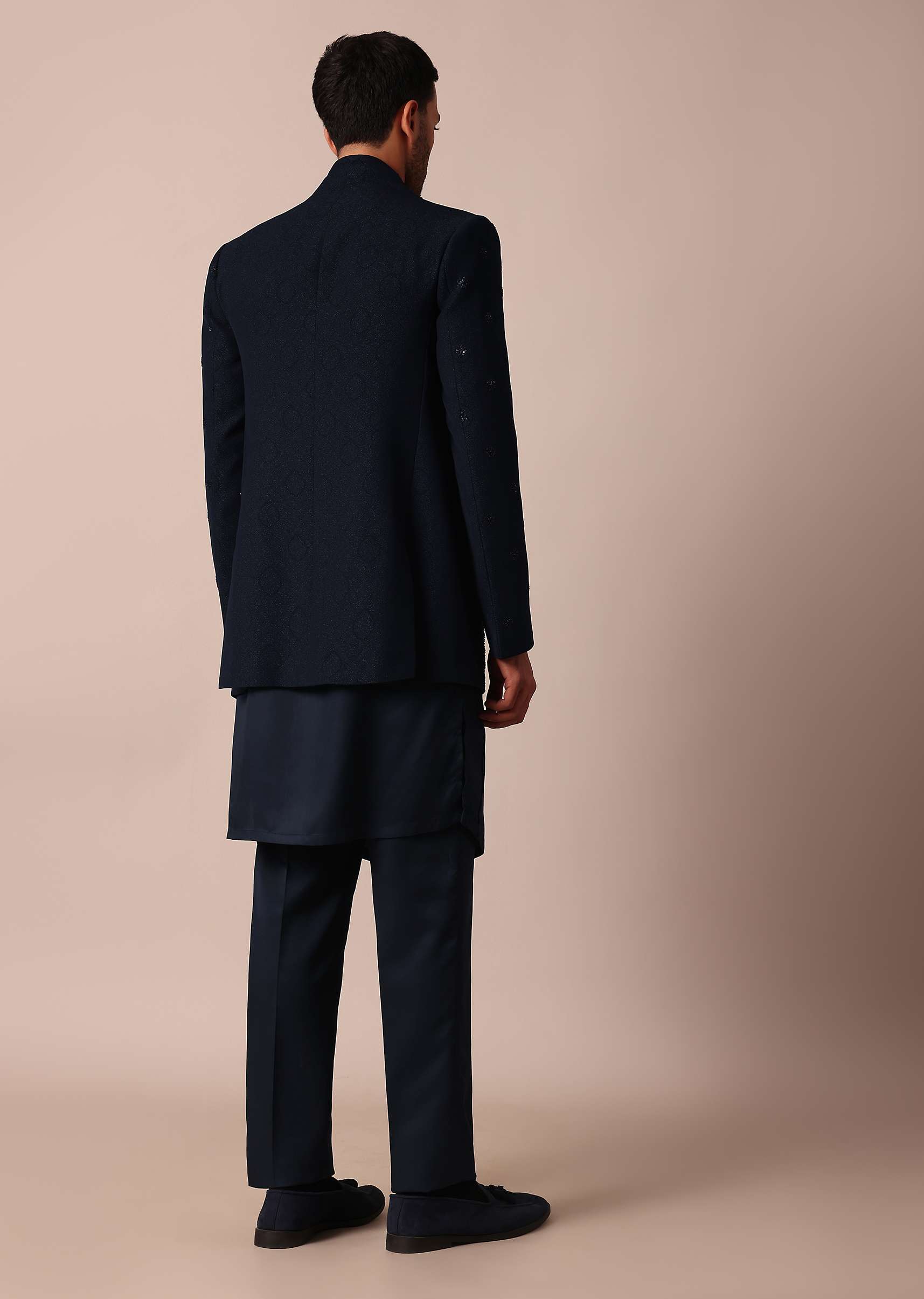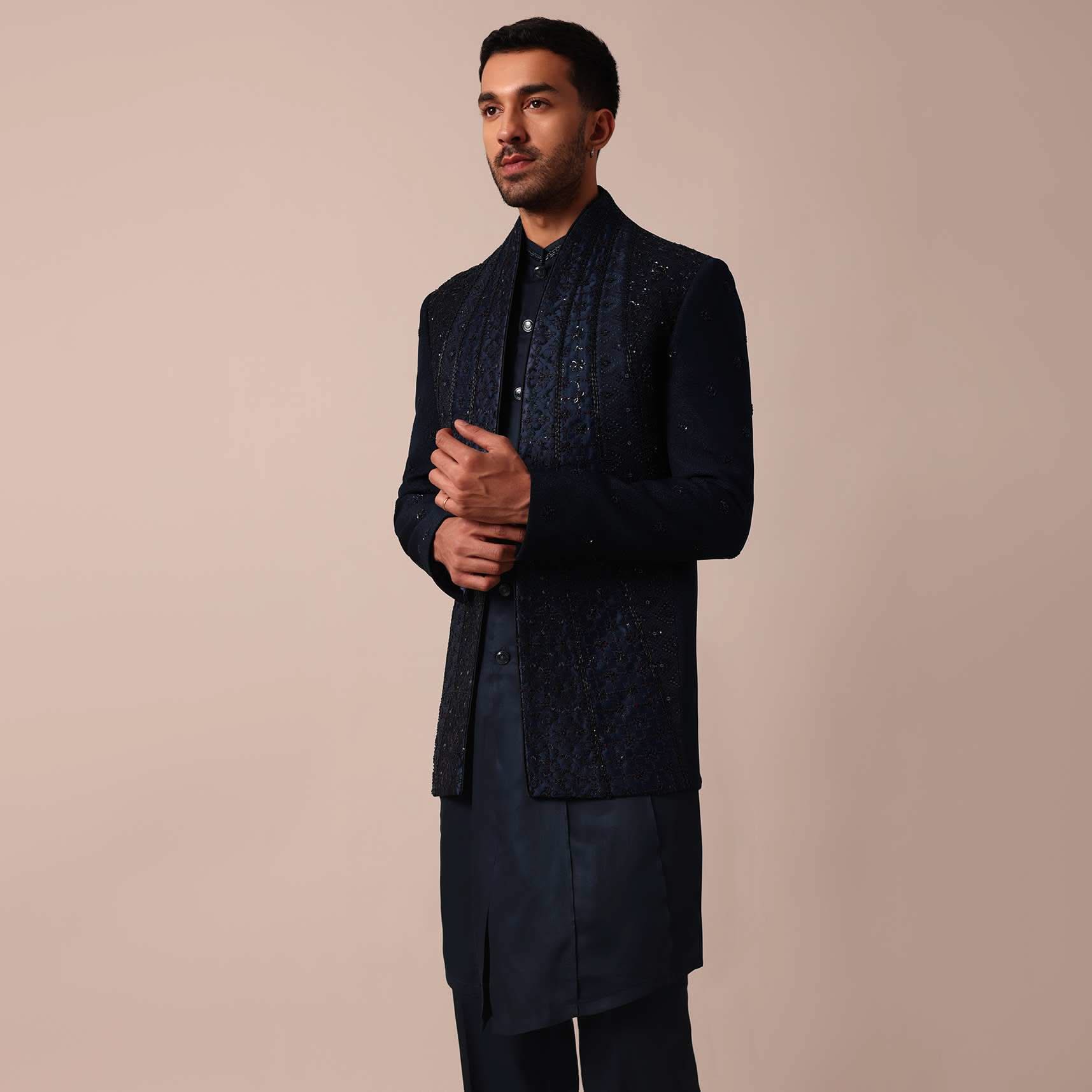 Style Tips: Enhance the regal appeal by pairing this Indowestern with complementing navy blue accessories and polished leather shoes.