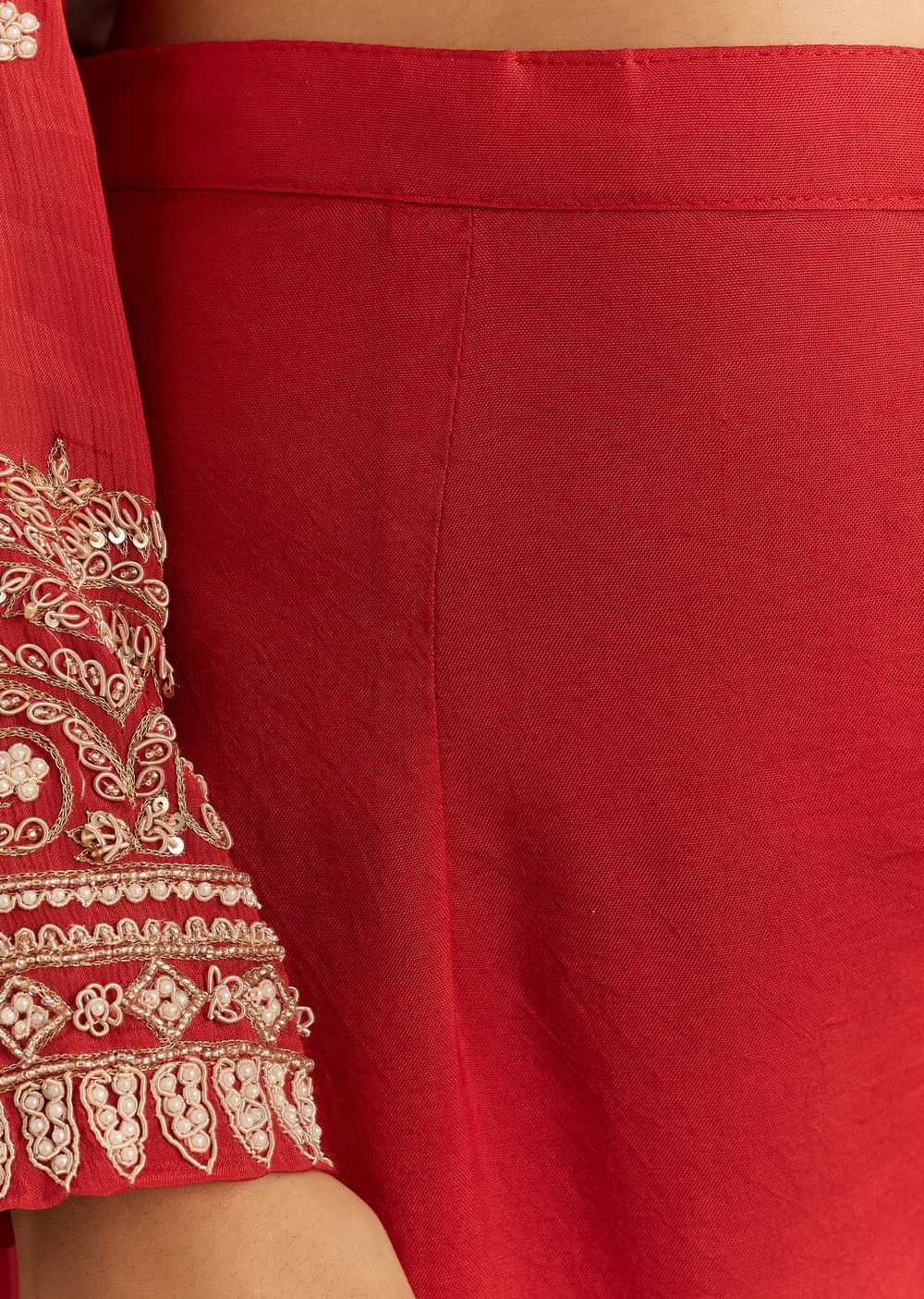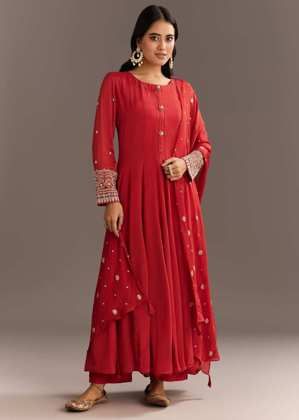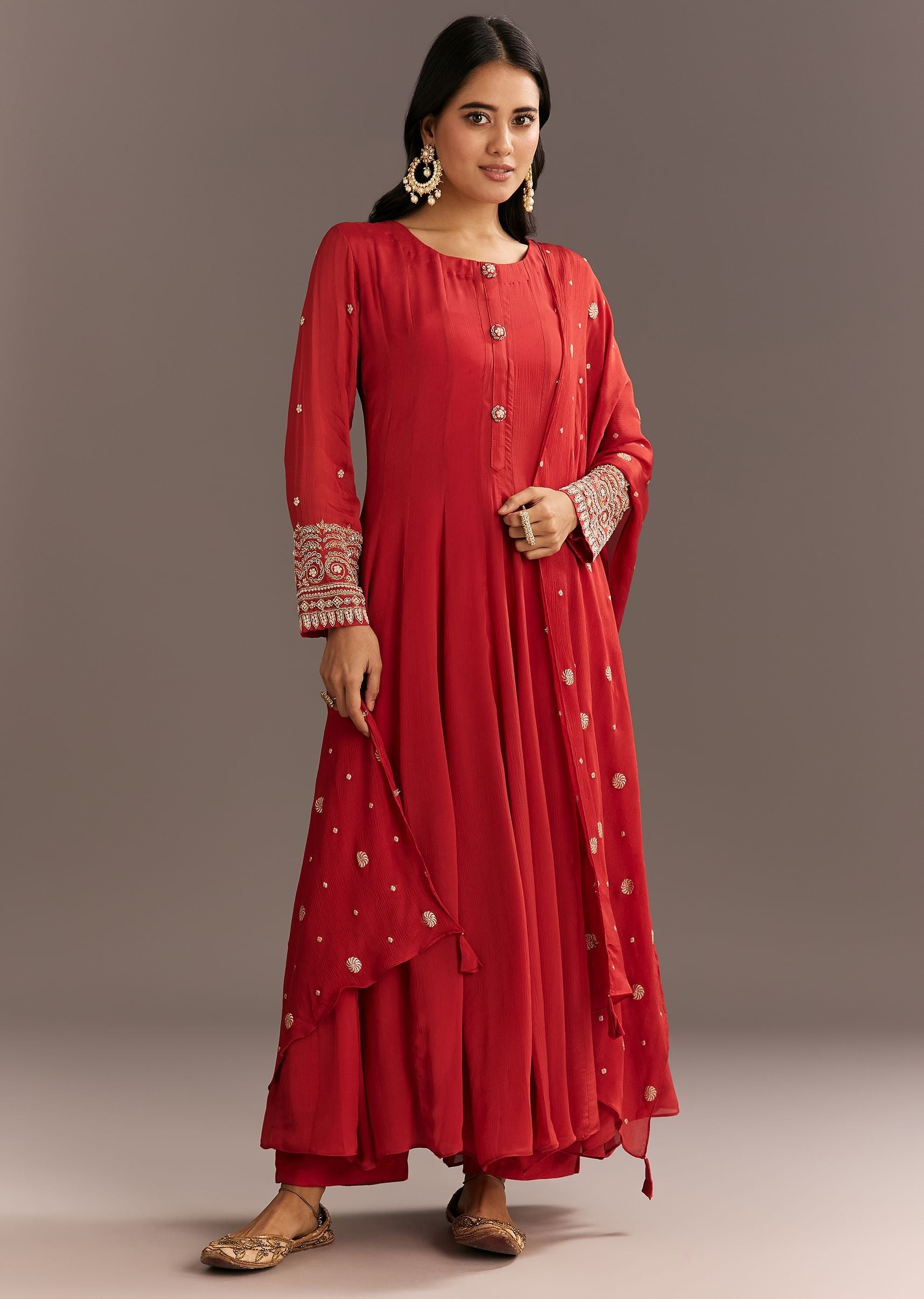 Deep Orange Chinon Kurta With Zardosi Sleeves And Butti Dupatta
