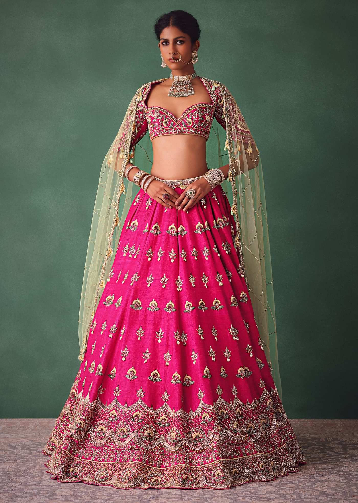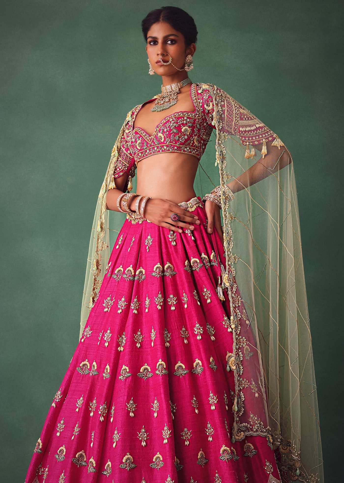 Deep Pink Bridal Butti Work Lehenga With Tassels on Blouse And Dupatta