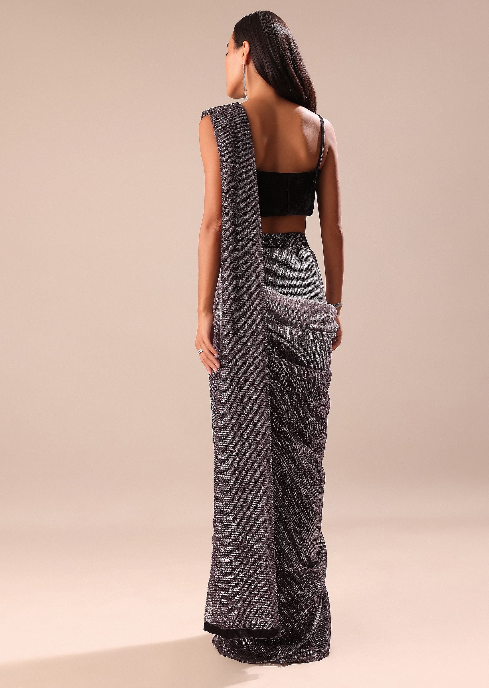 Exude the height of elegance in our deep purple ombre saree. This saree is crafted and adorned with sequenced fabric. The saree is paired with a velvet blouse. Style this outfit for your sangeet and mehendi events. Awarded as the Most Trusted Brand, we're delivering styles you love, just as promised.