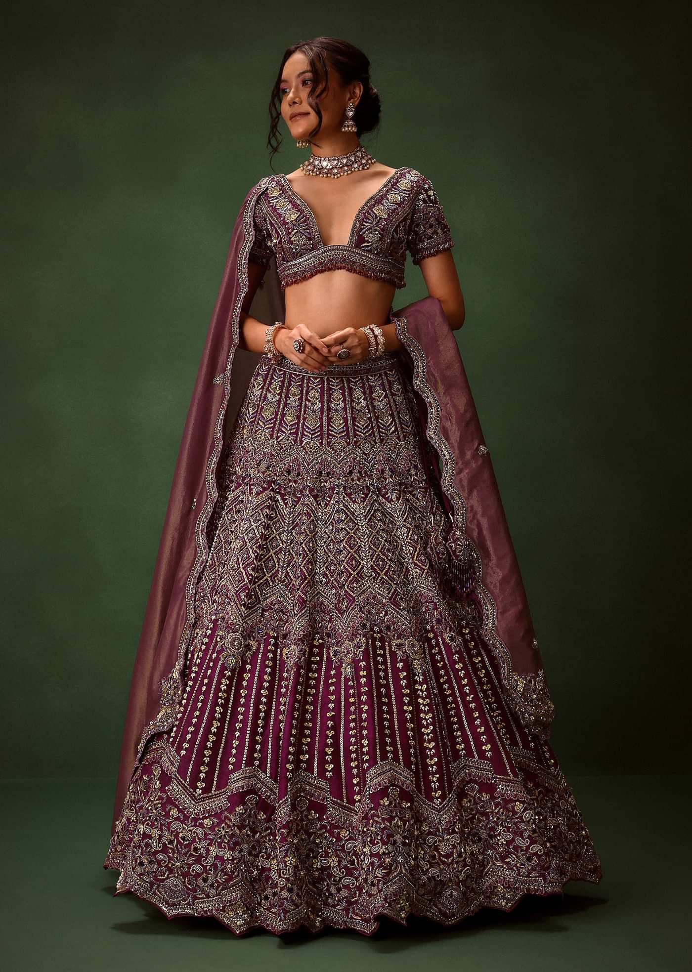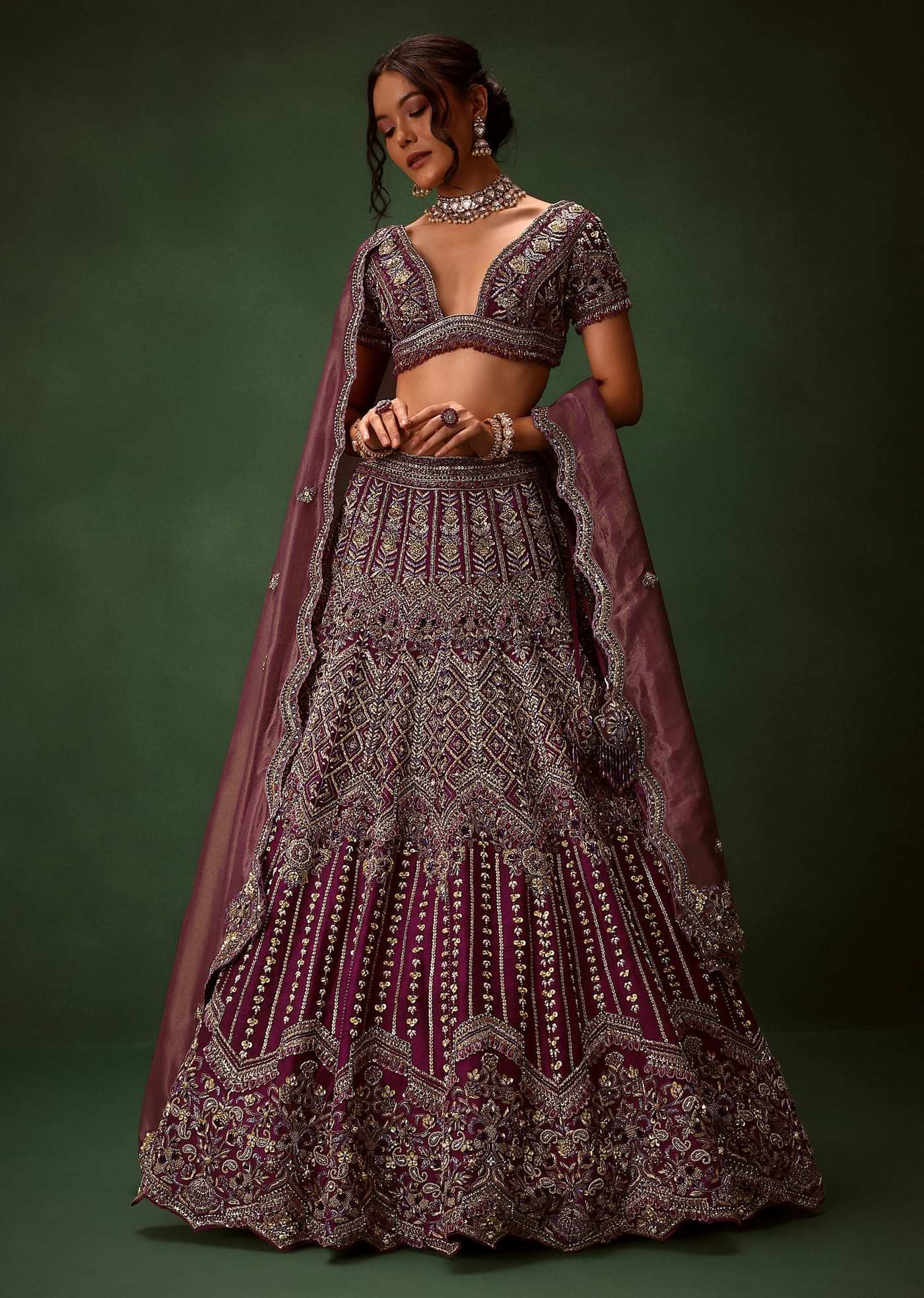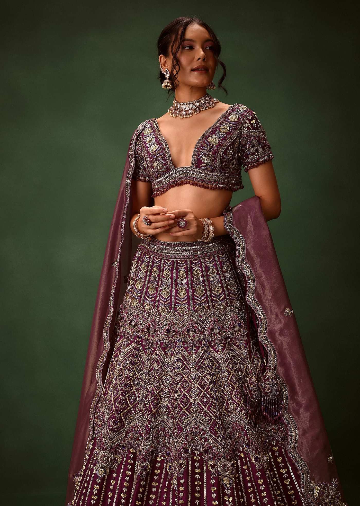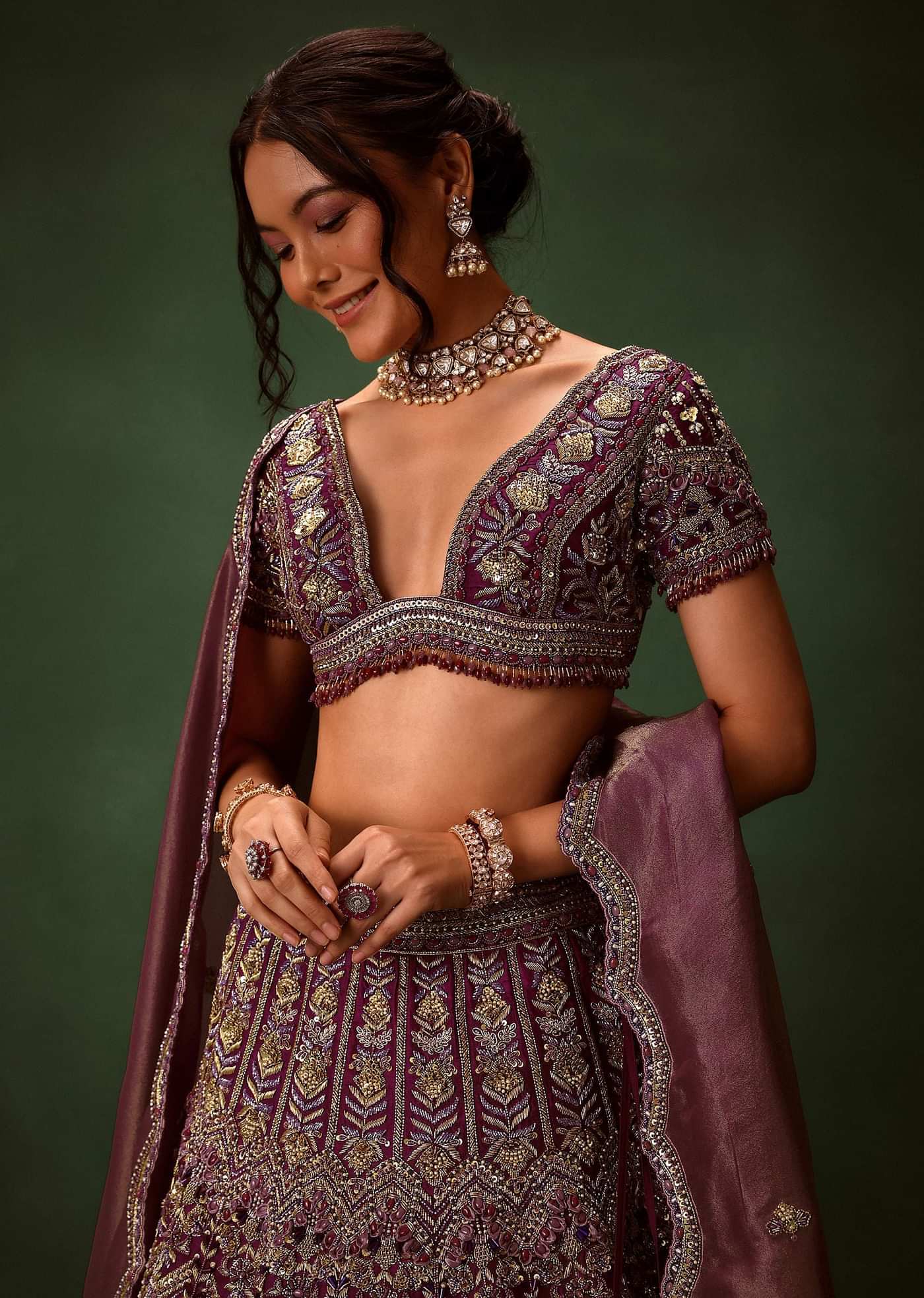 • Unleash Your Inner Royalty With This Deep Purple Raw Silk Lehenga Set Featuring Exquisite Floral And Geometric Embroidery Crafted With Cutdana Zardosi And Beadwork.