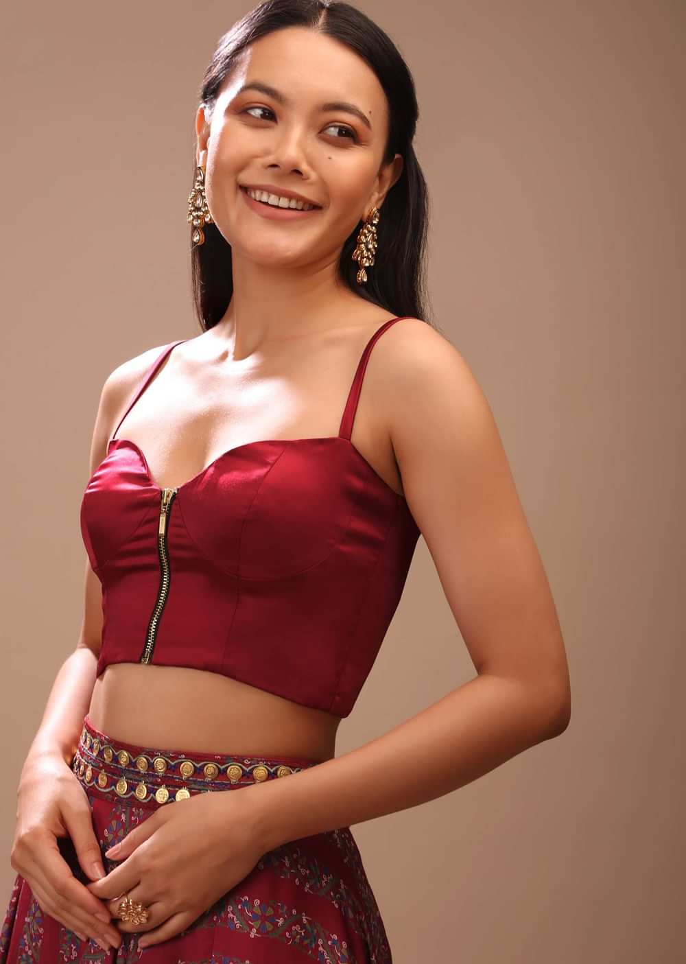 Deep red blouse in satin with front zip closure and corset neckline.It is crafted with strap sleeves and padding. Awarded as the Most Trusted Brand, we're delivering styles you love, just as promised.