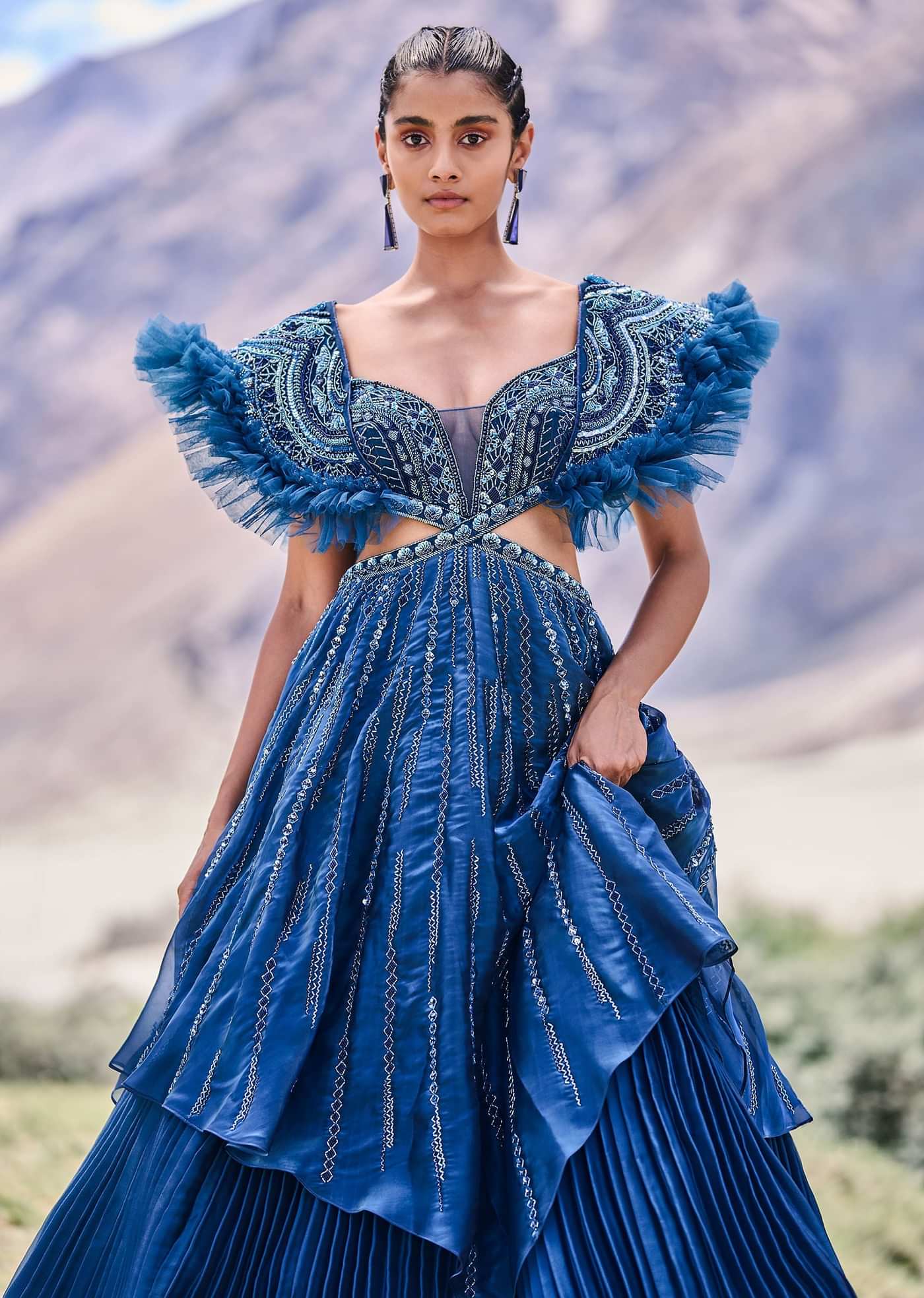 Deep Teal Blue Embroidered Layered Flared Gown With Fancy Sleeves