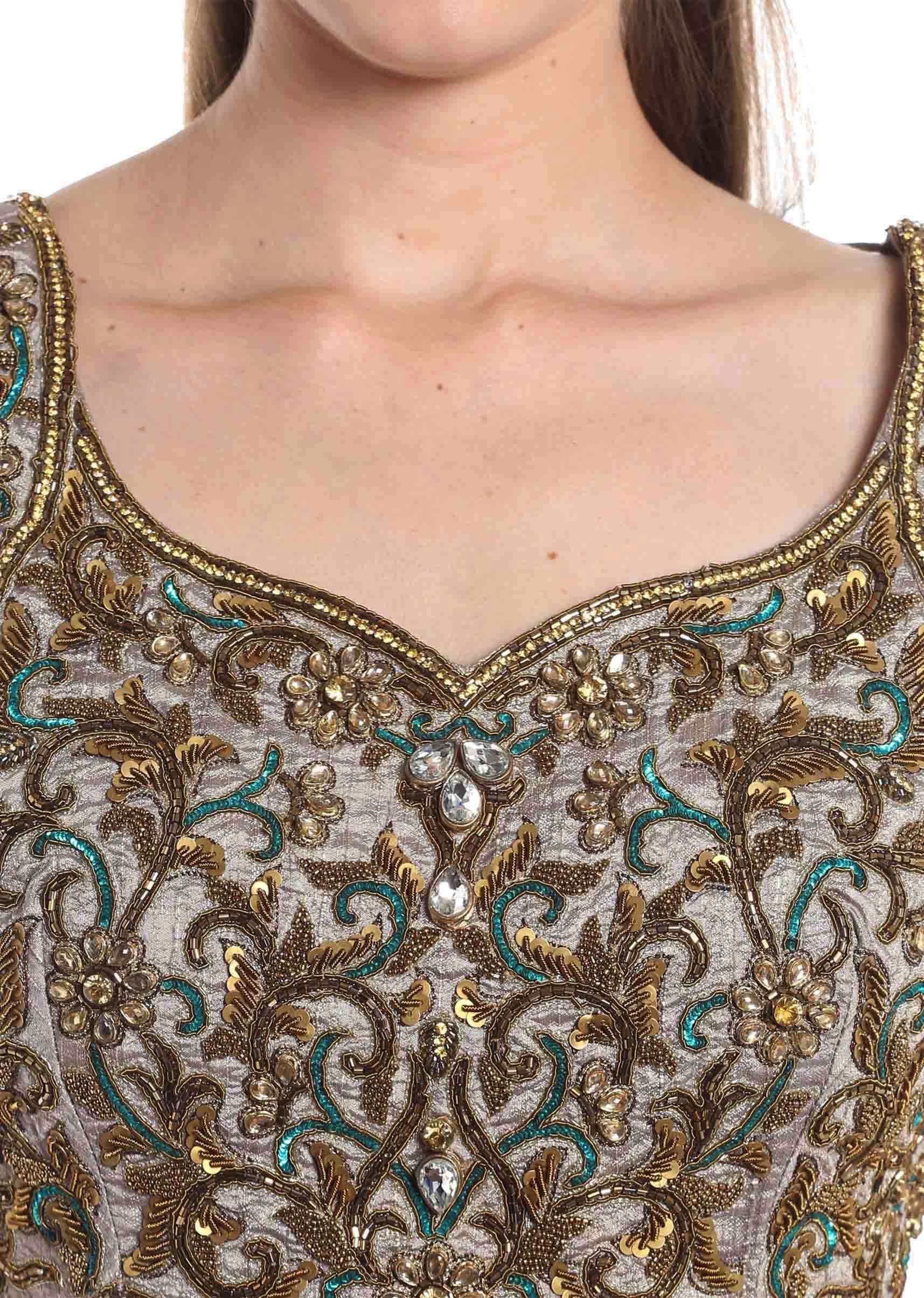 Charm your way through by flaunting the ethnic beauty of this grey and blue silk lehenga choli ensemble The ensemble features intricate digital prints that are highlighted with resham and... More Product Details