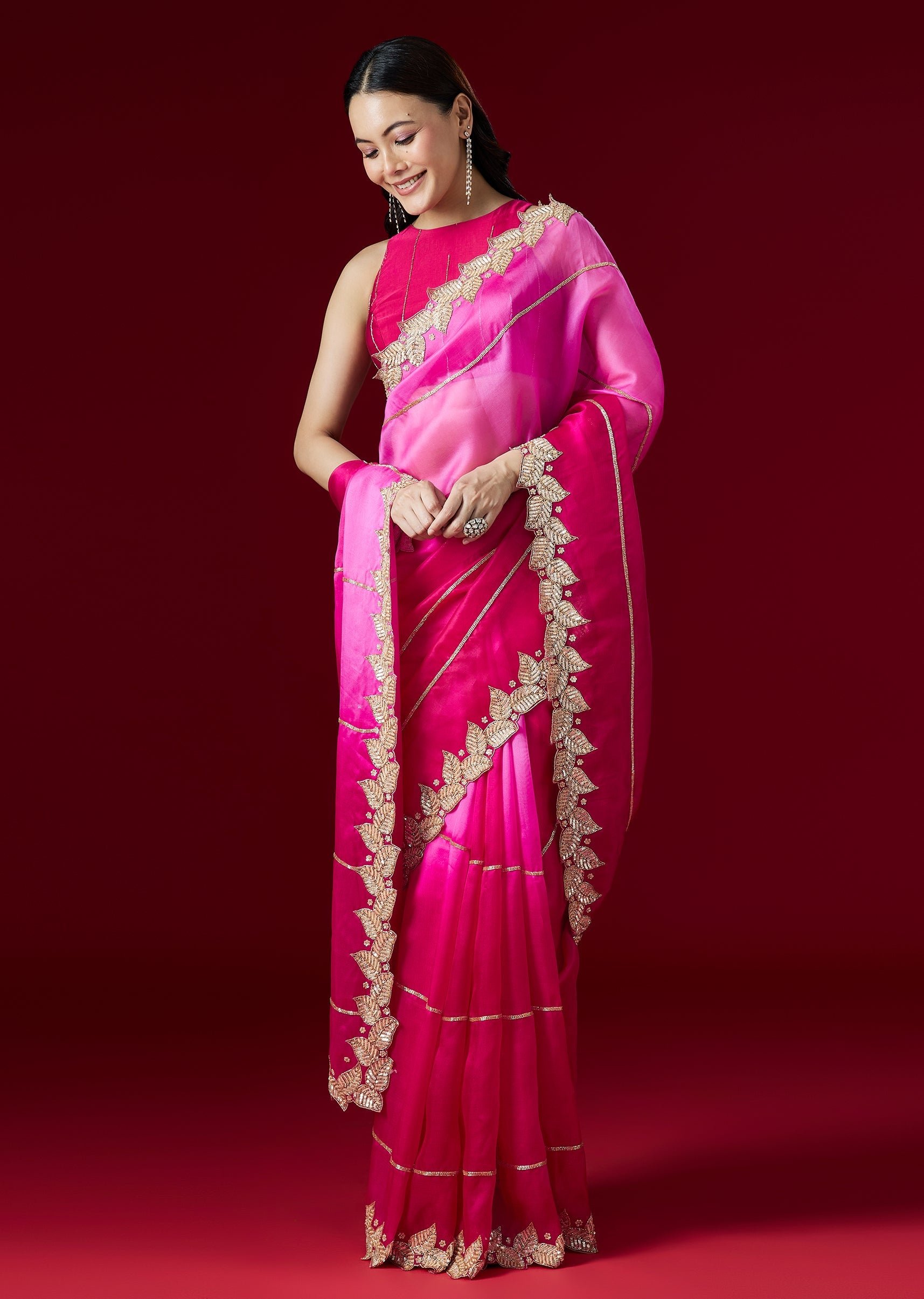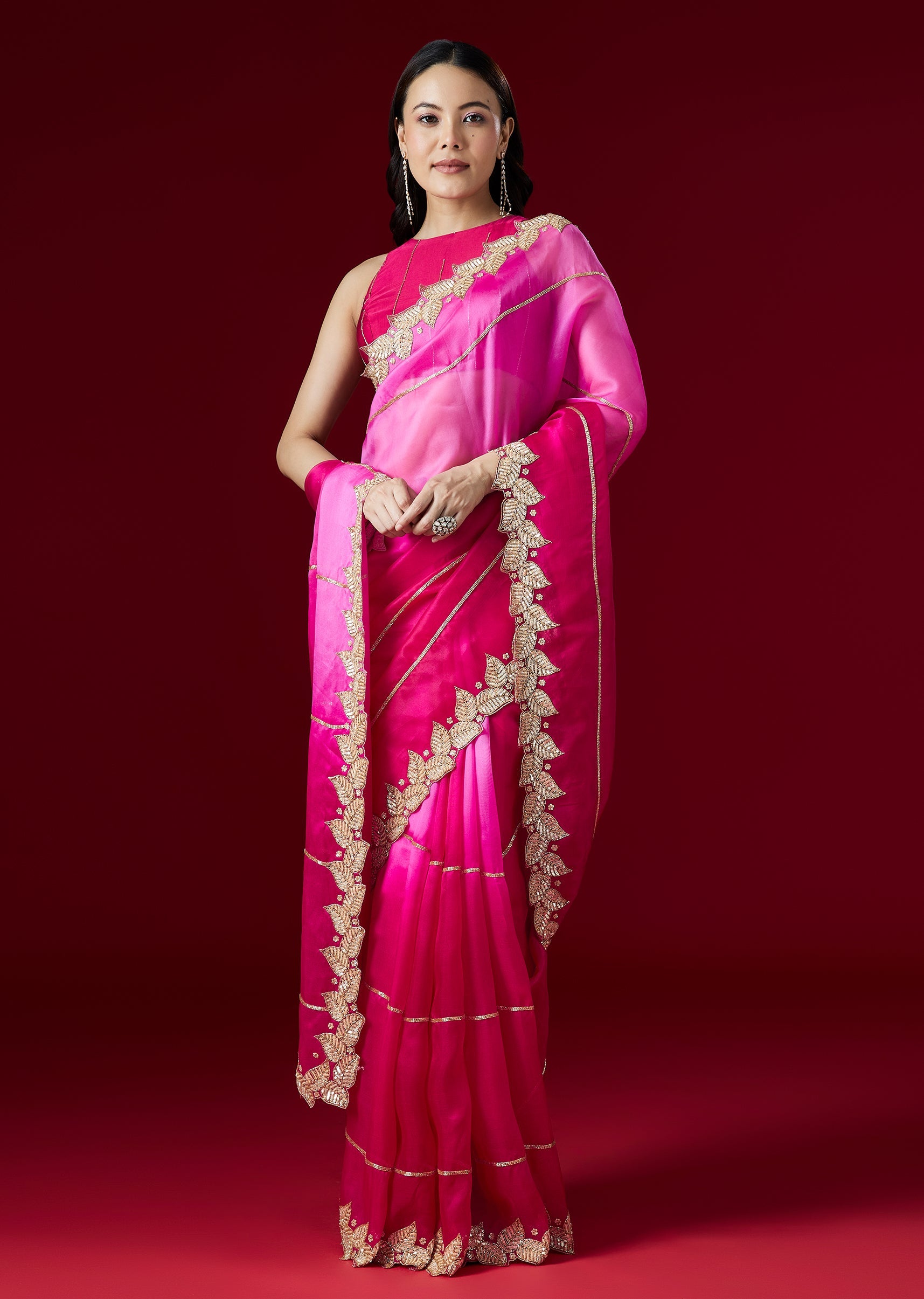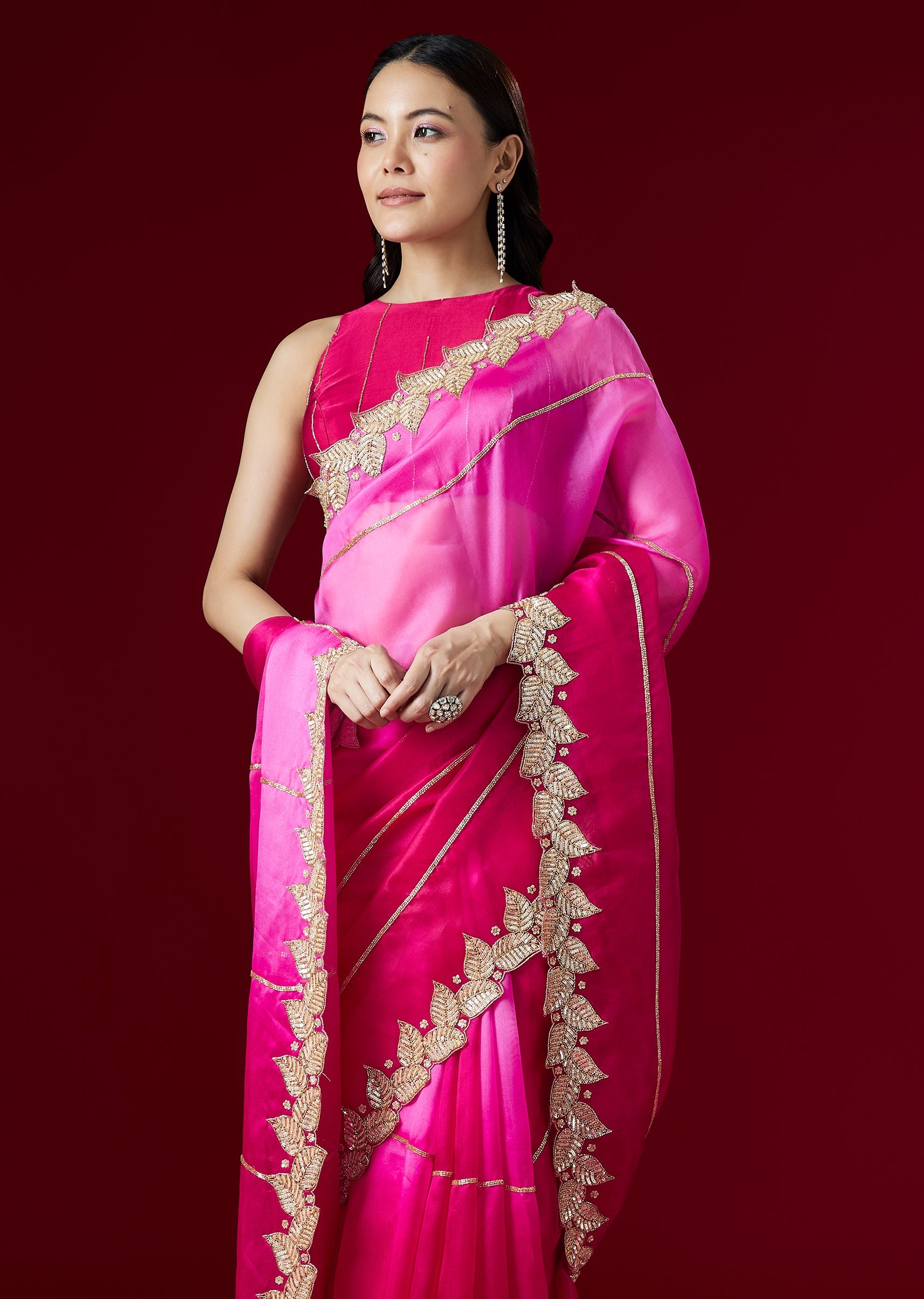 A stunning dual pink shaded organza silk saree featuring a cutwork border and leaf motif embroidery enhanced with cutdana and sequins. The embroidered stripes across the saree and blouse fabric... More Product Details